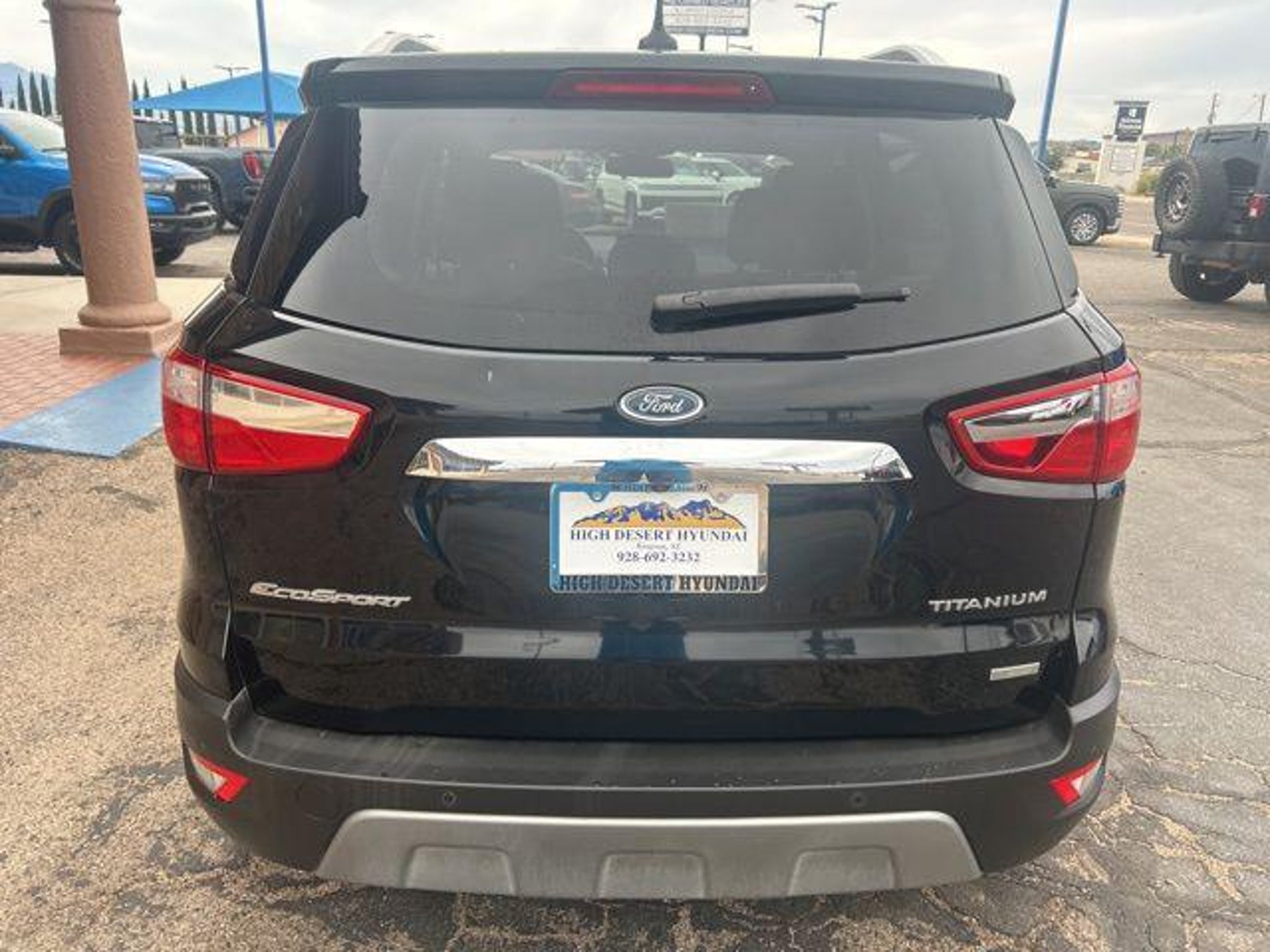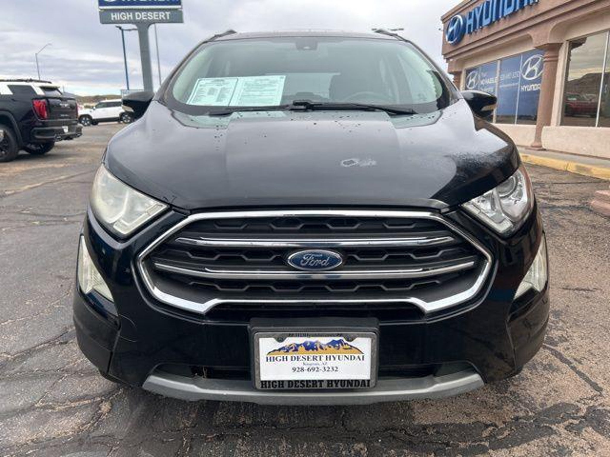 EcoBoost 1.0L I3 GTDi DOHC Turbocharged VCT Shadow Black 2018 Ford EcoSport Titanium FWD Awards: * 2018 KBB.com 10 Most Awarded Brands * 2018 KBB.com Brand Image Awards At High Desert Hyundai, we pride ourselves on offering a stellar automotive experience for drivers in Kingman, Henderson NV, and Prescott AZ. Our dedicated team of sales advisors, service technicians, and financing experts are here to address all your needs with the utmost respect, care, and attention to detail. Whether you're interested in the sleek Hyundai Santa Fe Sport, the stylish Sonata, the efficient Elantra, the versatile Tucson, or the compact Accent, our knowledgeable team will guide you through all the features and benefits of each model. If you're in the market for a reliable used car, our team is ready to help you explore our extensive inventory of pre-owned vehicles. Each car undergoes a thorough inspection to ensure it meets our high standards of quality and reliability. Our auto finance team is here to provide personalized solutions that fit your individual needs. Whether you're looking to lease a new Hyundai or finance a pre-owned vehicle, we offer a range of options to make the process stress-free. Start with our online appraisal form and credit application to get a head start. Our commitment to excellence doesn't end with the sale. Our onsite auto service and repair department is staffed with skilled technicians who use cutting-edge tools and technologies to keep your vehicle running smoothly. For those who prefer to perform their own maintenance, we offer a vast collection of authentic Hyundai parts and accessories. High Desert Hyundai has all your automotive needs covered. Whether you're stopping by for a test drive or need an oil change, our team is ready to assist you. Visit us at 4180 N Stockton Hill Rd, Kingman, Arizona, or contact us today to learn more about our services and inventory. This 2018 Ford EcoSport is equipped with the following options: Equipment Group 400A, 10 Speakers, 4-Wheel Disc Brakes, ABS brakes, Air Conditioning, Alloy wheels, AM/FM radio: SiriusXM, AppLink/Apple CarPlay and Android Auto, Auto-dimming Rear-View mirror, Automatic temperature control, Axle Ratio: 3.44, Brake assist, Bumpers: body-color, Compass, Delay-off headlights, Driver door bin, Driver vanity mirror, Dual front impact airbags, Dual front side impact airbags, Electronic Stability Control, Emergency communication system: SYNC 3 911 Assist, Exterior Parking Camera Rear, Front anti-roll bar, Front Bucket Seats, Front Center Armrest, Front fog lights, Front License Plate Bracket, Front reading lights, Front wheel independent suspension, Fully automatic headlights, Heated door mirrors, Heated front seats, Illuminated entry, Knee airbag, Leather Shift Knob, Leather steering wheel, Low tire pressure warning, Navigation System, Occupant sensing airbag, Outside temperature display, Overhead airbag, Overhead console, Panic alarm, Passenger door bin, Passenger vanity mirror, Perforated Leather-Trimmed Heated Bucket Seats, Power door mirrors, Power driver seat, Power moonroof, Power steering, Power windows, Radio data system, Radio: AM/FM Stereo w/MP3 Capable, Rain sensing wipers, Rear Parking Sensors, Rear seat center armrest, Rear side impact airbag, Rear window defroster, Rear window wiper, Remote keyless entry, Roof rack: rails only, Security system, SiriusXM Radio, Speed control, Speed-sensing steering, Split folding rear seat, Steering wheel mounted audio controls, SYNC 3 Communications & Entertainment System, SYNC Connect, Tachometer, Telescoping steering wheel, Tilt steering wheel, Traction control, Trip computer, Turn signal indicator mirrors, Variably intermittent wipers, and Wheels: 17 Premium Dark Stainless-Painted.