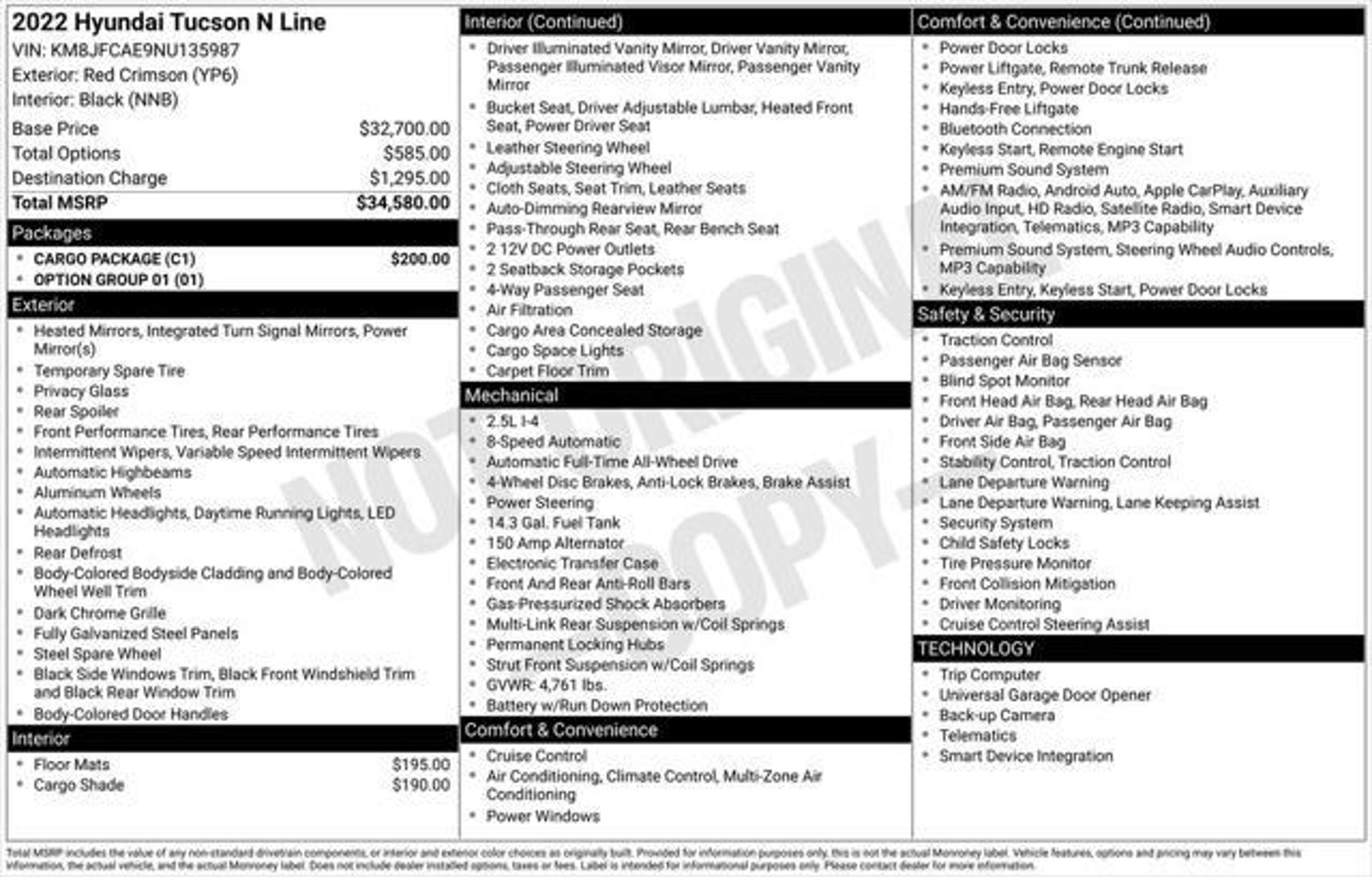 Discover the perfect blend of style, performance, and capability with the 2022 Hyundai Tucson N Line. This exceptional SUV is ready to elevate your driving experience and turn heads wherever you go. "¢ **VISION HYUNDAI OF CANANDAIGUA** "¢ Cargo Package "¢ Cargo Cover "¢ Carpeted Floor Mats Boasting a powerful 2.5L I4 DGI DOHC 16V engine, the Tucson N Line delivers an exhilarating 187 horsepower, mated to an 8-Speed Automatic with SHIFTRONIC transmission and AWD. With an impressive 24 city / 29 highway MPG, this SUV offers the perfect balance of power and efficiency. The striking red exterior, complemented by the N Line design elements, exudes a bold and sporty aesthetic that is sure to turn heads. Step inside and you'll be greeted by a premium Bose audio system, heated front seats, and a host of advanced technology features, including Apple CarPlay and Android Auto, ensuring a seamless and connected driving experience. Hyundai's commitment to safety is evident in the Tucson N Line, with features like Dual Front Impact Airbags, Dual Front Side Impact Airbags, and Electronic Stability Control, providing you and your loved ones with the utmost protection. As a Hyundai Certified Used Vehicle, this Tucson N Line has undergone a rigorous 173 point inspection, ensuring it meets the highest standards of quality and performance. With a Limited Warranty of 60 Months/60,000 Miles and a Powertrain Limited Warranty of 120 Months/100,000 Miles, you can drive with confidence, knowing your investment is protected. Don't miss the opportunity to experience the exceptional 2022 Hyundai Tucson N Line. Visit our showroom today and let our knowledgeable team guide you through all the features and benefits this stunning SUV has to offer. Do not forget with EVERY VEHICLE purchased at any of the 10 Vision locations you will receive -LIFETIME FREE INSPECTIONS YOU AND THE FAMILY -DISCOUNT COUPONS FOR SERVICE AND ACCESSORIES GOOD UP TO $250 THE FOLLOWING NO CHARGE ITEMS HAVE ALREADY BEEN ADDED TO THIS VEHICLE FOR THE PROTECTION OF THE DEALERSHIP AGAINST ENVIRONMENTAL DAMAGES AND THEFT. THESE PRODUCTS ARE AVAILABLE TO HAVE A WARRANTY ADDED UP TO 6 YEARS FROM PURCHASE) -LOJACK SYSTEM INSTALLED (NOT ACTIVE UNTIL PLAN PURCHASED) -RUSTPROOFING -INTERIOR PROTECTION PACKAGE APPLIED -PAINT PROTECTION- PROTECTING THE POUROUS SURFACE OF YOUR VEHICLE FROM ENVIRONMENTAL DAMAGES STOP INTO ANY OF OUR LOCATIONS TODAY WE LOOK FORWARD TO SERVING YOU, YOUR FAMILY, AND THE COMMUNITY!