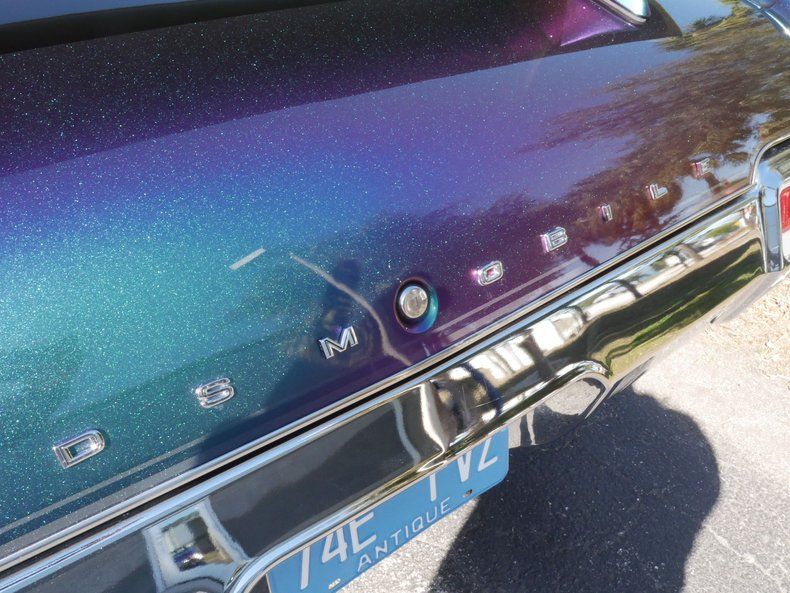 This 1971 Oldsmobile Cutlass Convertible is a true head-turner, blending classic Olds muscle with eye-catching modern flair. Finished in fresh Mysichrome Chameleon paint, the car shifts color beautifully in different light, giving this Cutlass a bold, custom presence while still respecting its vintage roots. Enhancing its aggressive stance are 4-4-2"style hood, bumpers, rear spoiler, and subtle ghost stripes, giving the car a muscular, performance-inspired look. A new black convertible top completes the package and is ready for top-down cruising.