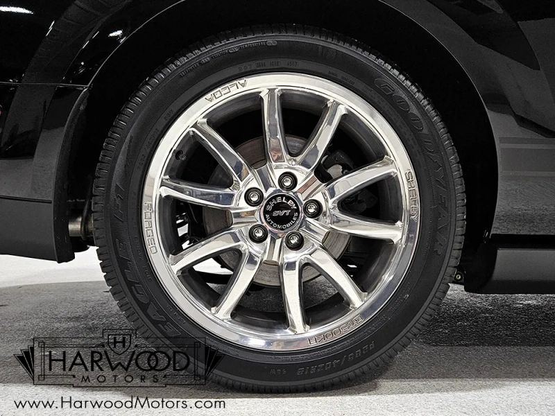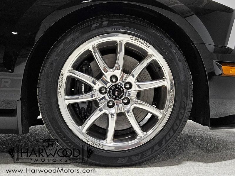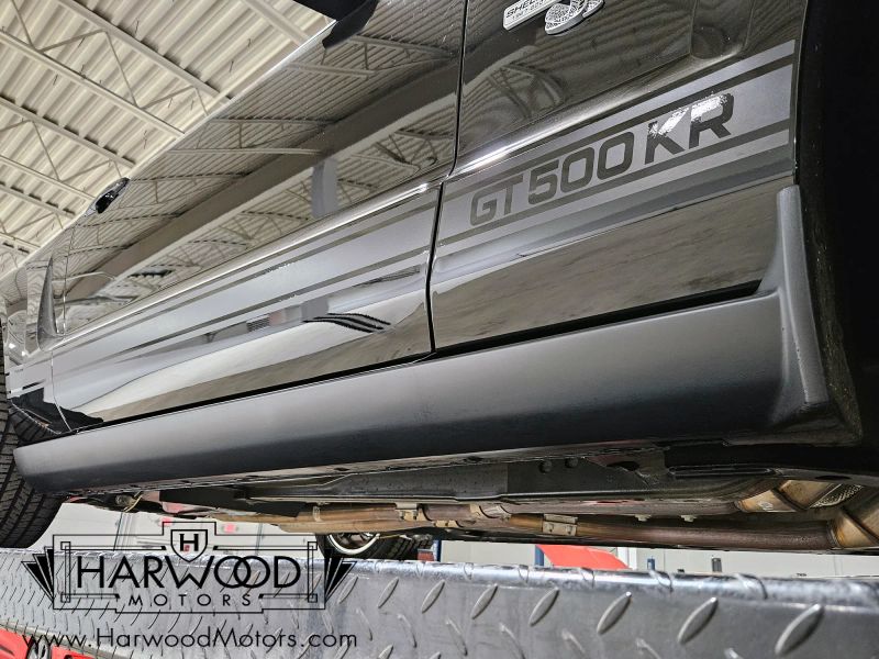 There are myriad changes underneath, too, starting with an upgraded clutch feeding the 6-speed manual gearbox. Out back, it has 3.73 gears to make the most of the KRs rev-happy nature, so theres fairly significant acceleration available at any speed. The suspension was revised so it rides better than a GT500 but offers still substantial grip and like I said, its all about the driver with direct connections to the tire patches. Giant 14-inch Brembo brakes are immune to fade and pull this somewhat heavy Mustang down from speed without any stress. Youll note that the underside looks almost new with zero signs of foul weather use or modifications, and even the assembly decals are still in place. The stainless exhaust sounds spectacular and youll note the heavy-duty trailing arms suspending the live axle, which is what gives the KR its fun, tail-out personality. Those forged aluminum Alcoa wheels were custom made just for the GT500KR and wear fresh 255/45/18 front and 285/40/18 rear Goodyear rubber (the original tires are included with the car).
