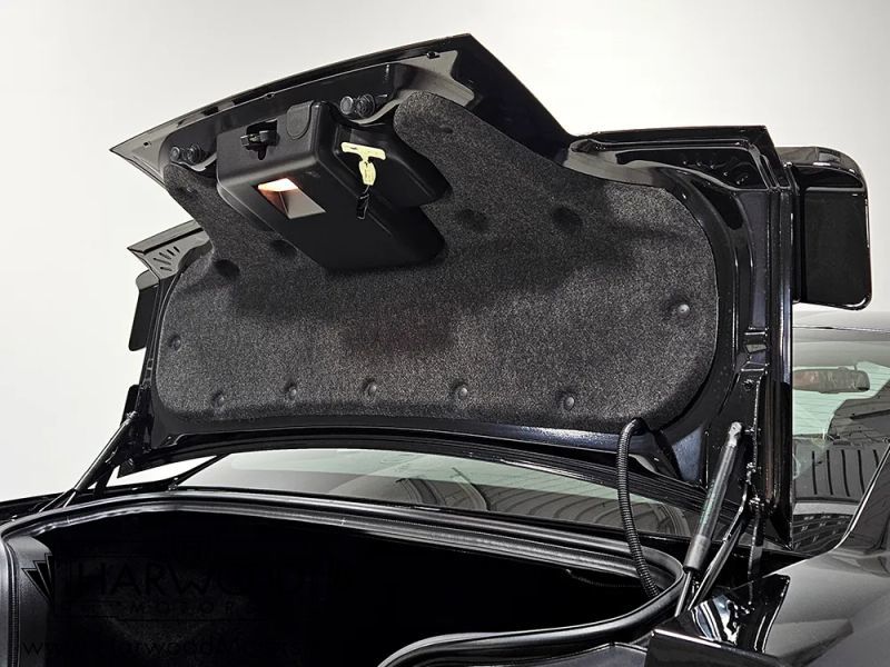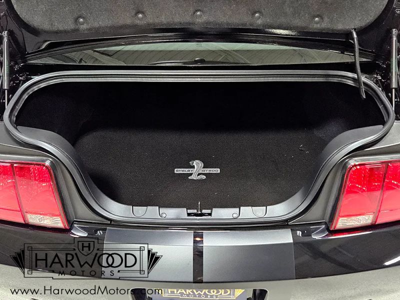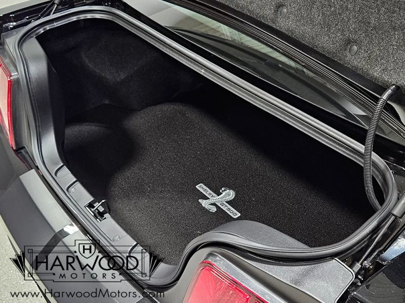 The interior isnt much changed from the standard GT500, but thats not a bad thing. The leather seats are incredibly comfortable and the Mustangs driving position has always been great for driving fast. You get a chunky steering wheel wrapped in leather, a retro-looking 6-speed shifter with shorter throws than the regular GT500 and topped with a cue ball knob, as well as those big, easy-to-read gauges. Theres a special commemorative badge between the center A/C vents featuring Carrolls signature as well as this cars unique Shelby serial number: 08KR0433. Ford included a big entertainment screen in the center stack and just about everything was standard: A/C, power windows, locks, seats, and mirrors, cruise control, rear defrost, and more. Theres also a set of matching embroidered floor mats. And if you like Shelby signatures, theres a pair on the headrests plus the one on the dash plaque. The back seats are actually usable by real people, although on this car its unlikely theres ever been a human being back there, and the rather large trunk has a matching embroidered mat as well. The KR did not come with a spare tire in the interest of all-out performance, but the original inflator kit is still in place and unused.