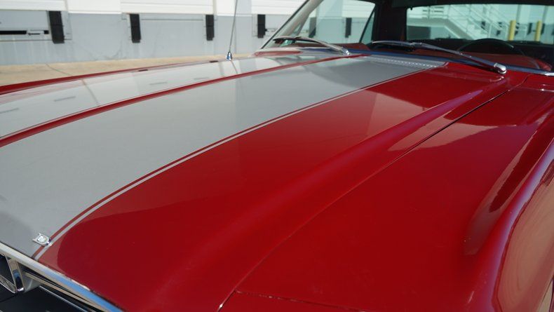 Inside, the red-on-red theme continues with a restored interior featuring red vinyl bucket seats with clean stitching, matching door panels, carpet, and dash. A classic three-spoke steering wheel, center console with cupholders, and an upgraded radio add comfort while maintaining a period-correct feel.