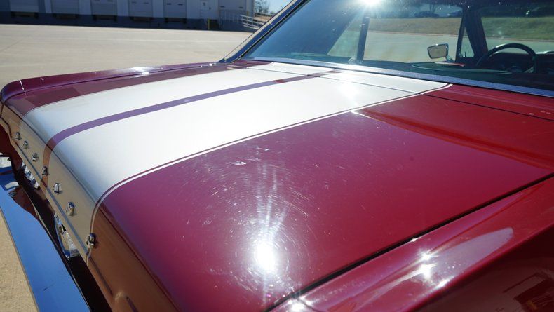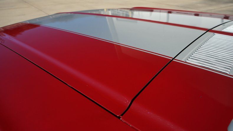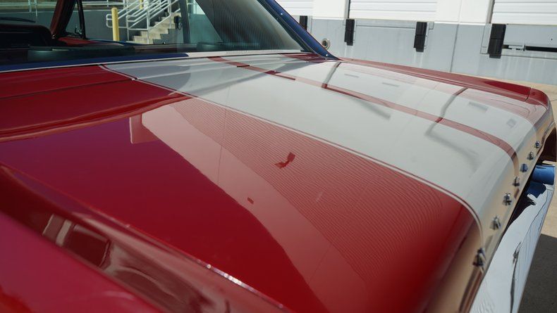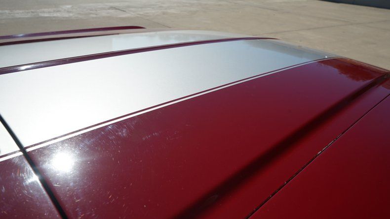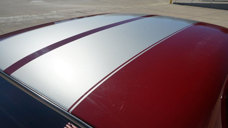 The exterior presents extremely well, highlighted by dual silver racing stripes, bright chrome bumpers, clean trim, and a confident stance on polished wheels wrapped in raised white letter tires. The paint shows a deep gloss and reflects years of careful ownership, having been garage kept since restoration.