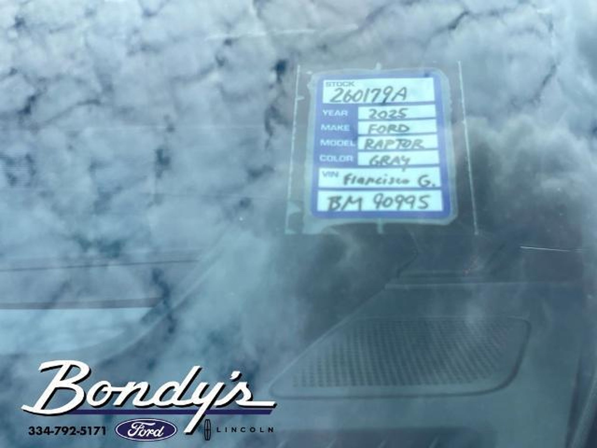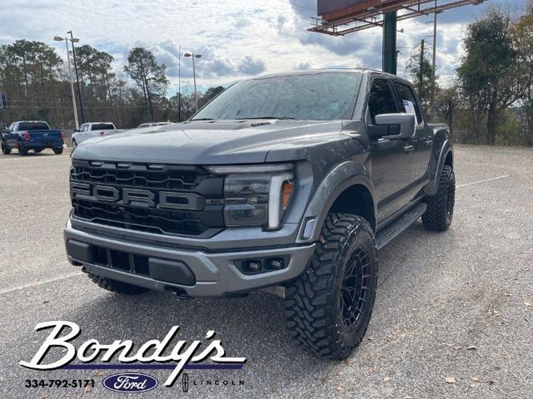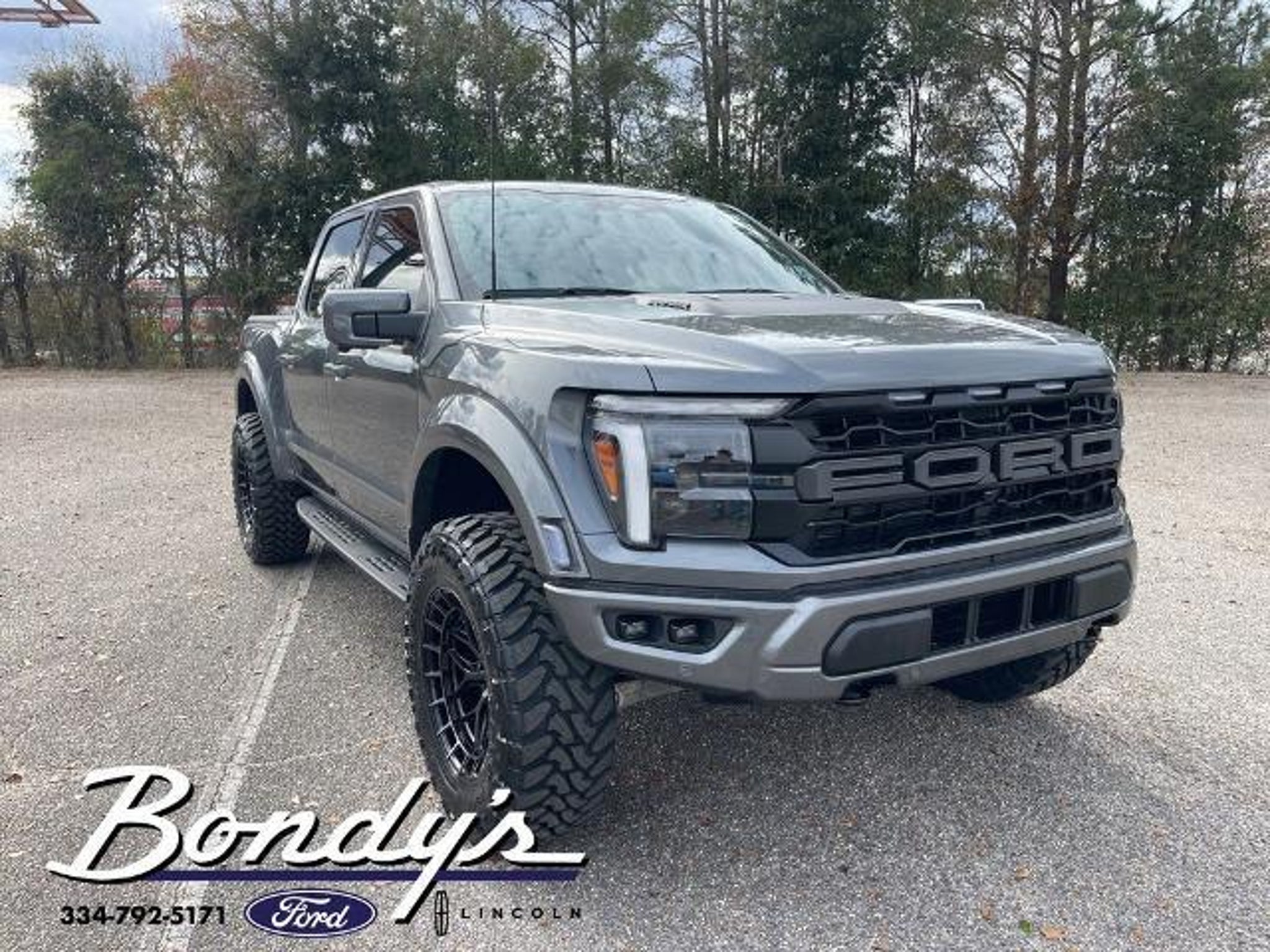 CARFAX One-Owner. Clean CARFAX. 2025 Ford F-150 Raptor 4WD, 14 Speakers, 17 Cast Aluminum Wheels, 4-Wheel Disc Brakes, ABS brakes, Adjustable pedals, Air Conditioning, Alloy wheels, AM/FM radio: SiriusXM with 360L, Auto High-beam Headlights, Auto tilt-away steering wheel, Auto-dimming door mirrors, Auto-dimming Rear-View mirror, Automatic temperature control, Brake assist, Bumpers: body-color, Compass, Delay-off headlights, Driver door bin, Driver vanity mirror, Dual front impact airbags, Dual front side impact airbags, Electronic Locking w/4.10 Axle Ratio, Electronic Stability Control, Emergency communication system: SYNC 4 911 Assist, Equipment Group 801A Standard, Front anti-roll bar, Front Bucket Seats, Front Center Armrest, Front dual zone A/C, Front fog lights, Front License Plate Bracket, Front reading lights, Front wheel independent suspension, Fully automatic headlights, Garage door transmitter, Heads-Up Display, Heated door mirrors, Heated front seats, Heated rear seats, Heated steering wheel, Illuminated entry, Internet access capable: FordPass Connect 5G, Lane Departure Warning System, Leather steering wheel, Leather Trimmed Seats, Low tire pressure warning, Memory seat, Navigation system: Connected Navigation, Occupant sensing airbag, Outside temperature display, Overhead airbag, Overhead console, Panic alarm, Passenger door bin, Passenger vanity mirror, Pedal memory, Power door mirrors, Power driver seat, Power passenger seat, Power steering, Power windows, Radio data system, Radio: B&O Unleashed Sound System by Bang & Olufsen, Rain sensing wipers, Rear reading lights, Rear step bumper, Rear window defroster, Remote keyless entry, Security system, Speed control, Speed-sensing steering, Split folding rear seat, Steering wheel memory, Steering wheel mounted audio controls, SYNC 4 w/Enhanced Voice Recognition, Tachometer, Telescoping steering wheel, Tilt steering wheel, Tough Bed Spray-In Bedliner, Traction control, Trip computer, Turn signal indicator mirrors, Twin Panel Moonroof, Variably intermittent wipers, Ventilated front seats, 4WD. Gray Metallic 4WD 3.5L V6 EcoBoost 10-Speed Automatic THIS VEHICLE IS LOCATED AT BONDY'S FORD LINCOLN AT 3615 ROSS CLARK CIRCLE DOTHAN, AL 36303. PLEASE CALL US AT 800-239-5171 TO ASK US ANY QUESTIONS! MON-FRI SALES IS HERE FROM 8:30 TO 7:00 AND SAT 8:30 TO 6:00. WE ARE CLOSED ON SUNDAYS. Call Toll Free 800-239-5171 or 334-792-5171.