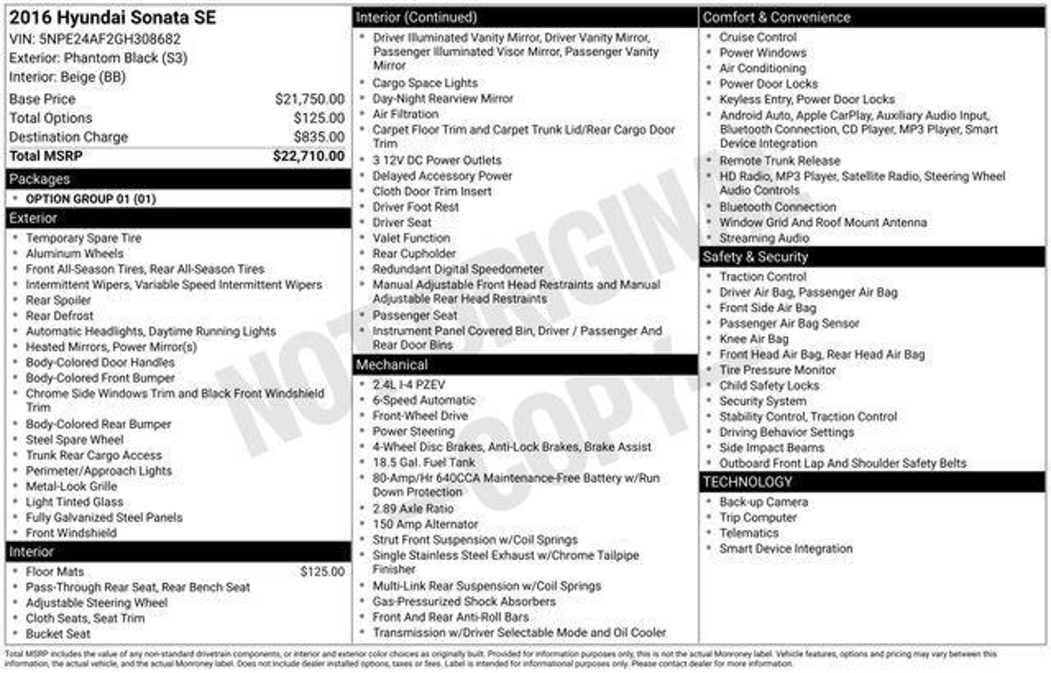 Discover the perfect blend of style, technology, and performance in this 2016 Hyundai Sonata SE. With its sleek black exterior and well-appointed interior, this sedan is sure to turn heads wherever you go. But don't let its good looks fool you - this Sonata is packed with features that will elevate your driving experience. - Triton Certified Classic Vehicle - 3 Month / 4,000 Mile Comprehensive Warranty - 5 Day Return / 30 Day Exchange - Auto Reward Program - Radio: AM/FM/SiriusXM/CD/MP3 Display Audio - Air Conditioning - Power steering - Power windows - Remote keyless entry - Steering wheel mounted audio controls - ABS brakes - Emergency communication system: Blue Link - Rear anti-roll bar - Exterior Parking Camera Rear - Fully automatic headlights - Speed control - Apple CarPlay & Android Auto - Variably intermittent wipers Under the hood, this Sonata is powered by a 2.4L I4 DGI DOHC 16V PZEV engine that delivers an impressive 185 horsepower, paired with a smooth-shifting 6-speed automatic transmission with Shiftronic. With an EPA-estimated 25 MPG in the city and 38 MPG on the highway, this Sonata offers excellent fuel efficiency to help you save at the pump. As a Triton Certified Classic Vehicle, this Sonata has undergone a rigorous inspection and reconditioning process to ensure it meets our high standards for quality and reliability. You can drive with confidence knowing that this vehicle has been thoroughly checked and comes with a comprehensive warranty for your peace of mind. The spacious and well-appointed interior of the Sonata SE offers a wealth of amenities to enhance your driving experience. Enjoy the convenience of features like Apple CarPlay, Android Auto, and a rearview camera, as well as the comfort of premium cloth seating and a host of safety technologies. Whether you're commuting to work, running errands, or embarking on a road trip, this 2016 Hyundai Sonata SE is the perfect companion. Experience the perfect balance of style, technology, and performance "“ visit our showroom today and let us put you behind the wheel of this exceptional vehicle.