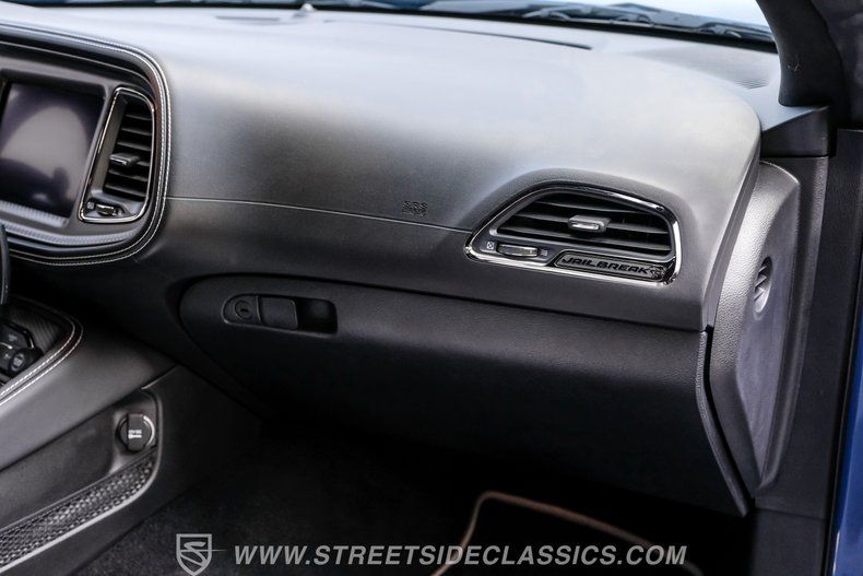 This Challenger SRT8 Hellcat Redeye has the rare Jailbreak package that added additional $18,595 to the price of the car. The Jailbreak option includes a 220-mph speedometer, widebody fender flares, high-performance engine controller, widebody competition suspension, Jailbreak badging and a SRT power chiller. Other options include Laguna leather seats with Hellcat logo that are ventilated and have memory settings, Technology Group, Driver Convenience Group, Harmon Kardon Audio Group with 18-speaker Prem Audio and trunk-mounted subwoofer, suede headliner, 8-speed TorqueFlite automatic transmission, 3.09 rear axle ratio, black hood pin kit, satin chrome exterior badging, satin black SRT Performance spoiler, SRT Widebody stripe, SRT Alcantra steering wheel with red LED logo, 4C NAV with 8.4-inch touch screen display, 20" x 11" Warp-Speed satin carbon wheels, real carbon fiber interior accents and blue brake calipers.