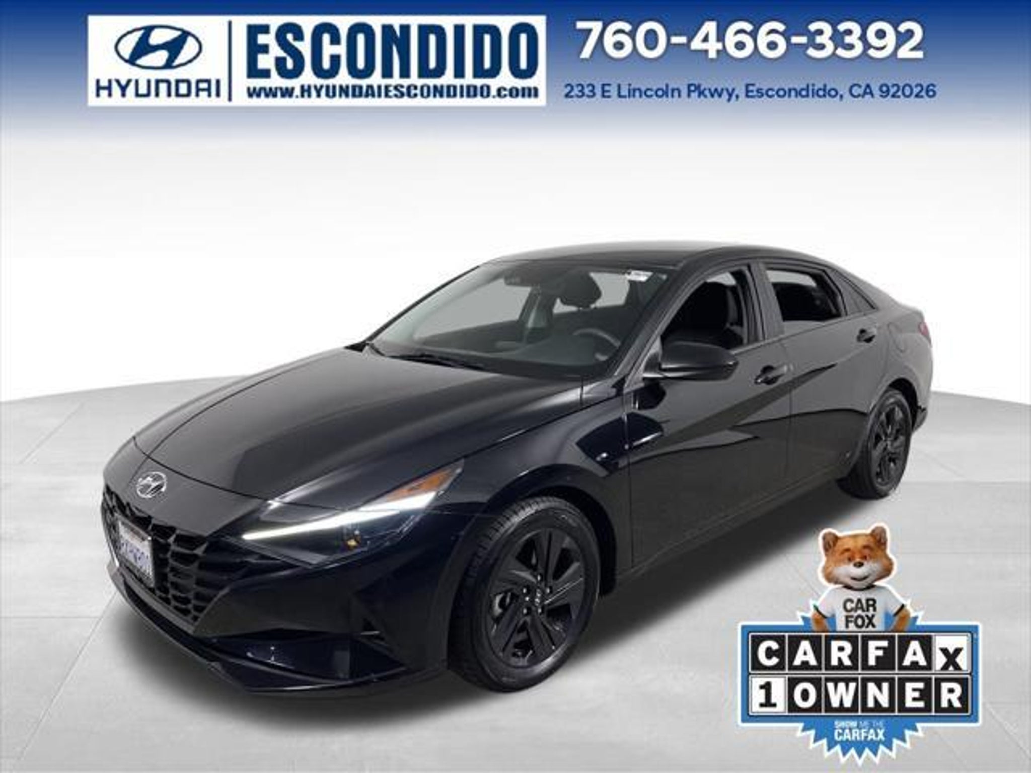 31/41 City/Highway MPG Odometer is 6314 miles below market average! CARFAX One-Owner. Clean CARFAX. Certified. Hyundai Combined Details: * Warranty Deductible: $50 (for Hyundai Certified Used Vehicles program) * Powertrain Limited Warranty: 120 Month/100,000 Mile (whichever comes first) from original in-service date (for Hyundai Certified Used Vehicles program) * 173 Point Inspection (for Hyundai Certified Used Vehicles program), 117 Point Inspection (for Hyundai Select Used program) * Vehicle History (for Hyundai Certified Used Vehicles program) * Limited Warranty: 60 Month/60,000 Mile (whichever comes first) from original in-service date (for Hyundai Certified Used Vehicles program) * Roadside Assistance (for Hyundai Certified Used Vehicles program) * Includes 10-year/Unlimited Mileage Roadside Assistance with Rental Car and Trip Interruption Reimbursement; Please See Dealers for Specific Vehicle Eligibility Requirements. 10-Year/100,000 Mile Hybrid/EV Battery Warranty. 3-Months SiriusXM Trial Subscription. Complimentary 1 Year (Connected Care & Remote Pkgs). (for Hyundai Certified Used Vehicles program), 6 Model Years Old and Newer With 80,000 - 120,000 Miles, 7-10 Model Years Old Vehicles With 120,000 Miles or Less. Powertrain Warranty 90 Days/5,000 Miles, HEV/PHEV Battery Warranty 10 Years/100,000 Miles. Roadside Assistance 90 Days/Unlimited Miles. Rental Car $35/Day Up to 5 Days. 3-Months SiriusXM Trial Subscription. (for Hyundai Select Used program) Option Group 01, Apple CarPlay & Android Auto, Front dual zone A/C, Remote keyless entry, Speed-sensing steering, ., 16 x 6.5J Alloy Wheels, 4-Wheel Disc Brakes, 6 Speakers, ABS brakes, Air Conditioning, Alloy wheels, AM/FM radio: SiriusXM, Auto High-beam Headlights, Automatic temperature control, Brake assist, Bumpers: body-color, Cargo Net, Cloth Seat Trim, Delay-off headlights, Driver door bin, Driver vanity mirror, Dual front impact airbags, Dual front side impact airbags, Electronic Stability Control, Emergency communication system: Blue Link Connected Car Service (3-year complimentary subscription), Exterior Parking Camera Rear, First Aid Kit, Front anti-roll bar, Front Bucket Seats, Front Center Armrest, Front reading lights, Front wheel independent suspension, Fully automatic headlights, Illuminated entry, Low tire pressure warning, Occupant sensing airbag, Outside temperature display, Overhead airbag, Overhead console, Panic alarm, Passenger door bin, Passenger vanity mirror, Power door mirrors, Power steering, Power windows, Radio: AM/FM/HD/SiriusXM Display Audio, Rear Bumper Applique, Rear window defroster, Security system, Speed control, Steering wheel mounted audio controls, Tachometer, Telescoping steering wheel, Tilt steering wheel, Traction control, Trip computer, and Variably intermittent wipers. As one of the premier San Diego Hyundai dealers, Hyundai Escondido has a huge selection of new, used and certified pre-owned vehicles to choose from. We provide great service, great prices and a great experience. We are non-pushy, genuine and honest. Hyundai Escondido is a family owned and operated dealership serving Escondido, Carlsbad, Temecula, Poway, Mira Mesa, Spring Valley, La Mesa, El Cajon, Santee, Lakeside, Chula Vista, National city and all of San Diego County. Our friendly staff is funny, approachable, and very knowledgeable. We are trained to serve you and we'll bend over backwards to help you find the right financing and appropriate vehicle that meets your needs. Phantom Black 2022 Hyundai Elantra SEL