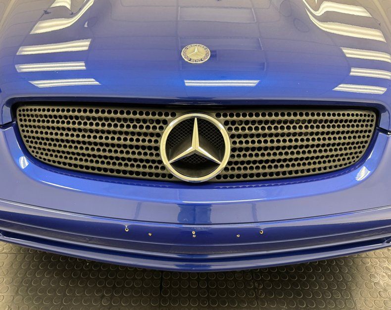 Bahama Blue Metallic covers our little roadster and its rounded edges and domed roof look wind defying from any angle. The wedge veers from pointy nosed sportscars and carries all of the Mercedes DNA, from the headlights and grille to the tail lights with vertical bands of clear lenses, and the 3 point star making an appearance of nose, back, and of course, the 16-inch Mercedes wheels. The rounded hardtop fits neatly and virtually seamlessly on the body, while body colored sport mirrors flank a steeply raked windshield. Fog lights are integrated into the chin spoiler and subtle body lines on the hood give the front even more character. Imperfections include some extra holes on the front bumper at the license plate area and just a few minor chips.