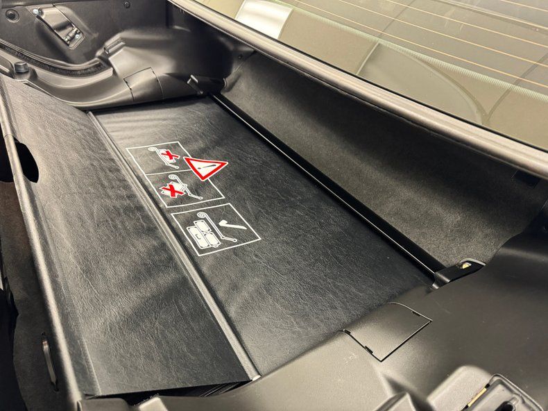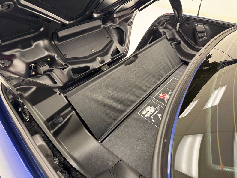 Not just basic black in this German sports car, but light gray inserts framed by black on the door panels and a wooden faceplate for an unexpected bit of pizazz, and it's all tight and clean and in good shape. The bucket seats repeat the pattern with some slight wear on the driver's seat leather, but in overall nice condition with high headrests and roll bars behind each seat. Gray frames the instrument panel where white faced gauges live in coves, each dial sporting a digital window as well, for time display, temperature, and odometer. A honey colored wood backs the center stack where A/C dials tops an AM/FM/Cassette radio and an in-dash cell phone panel. The black dash pad caps off the passenger side, over a gray glove box while a stout shifter lives in the center console surrounded by more wood and low pile gray carpet cleanly covers the floor. A small trunk is present but is mostly reserved for the folding hardtop and presents cleanly.