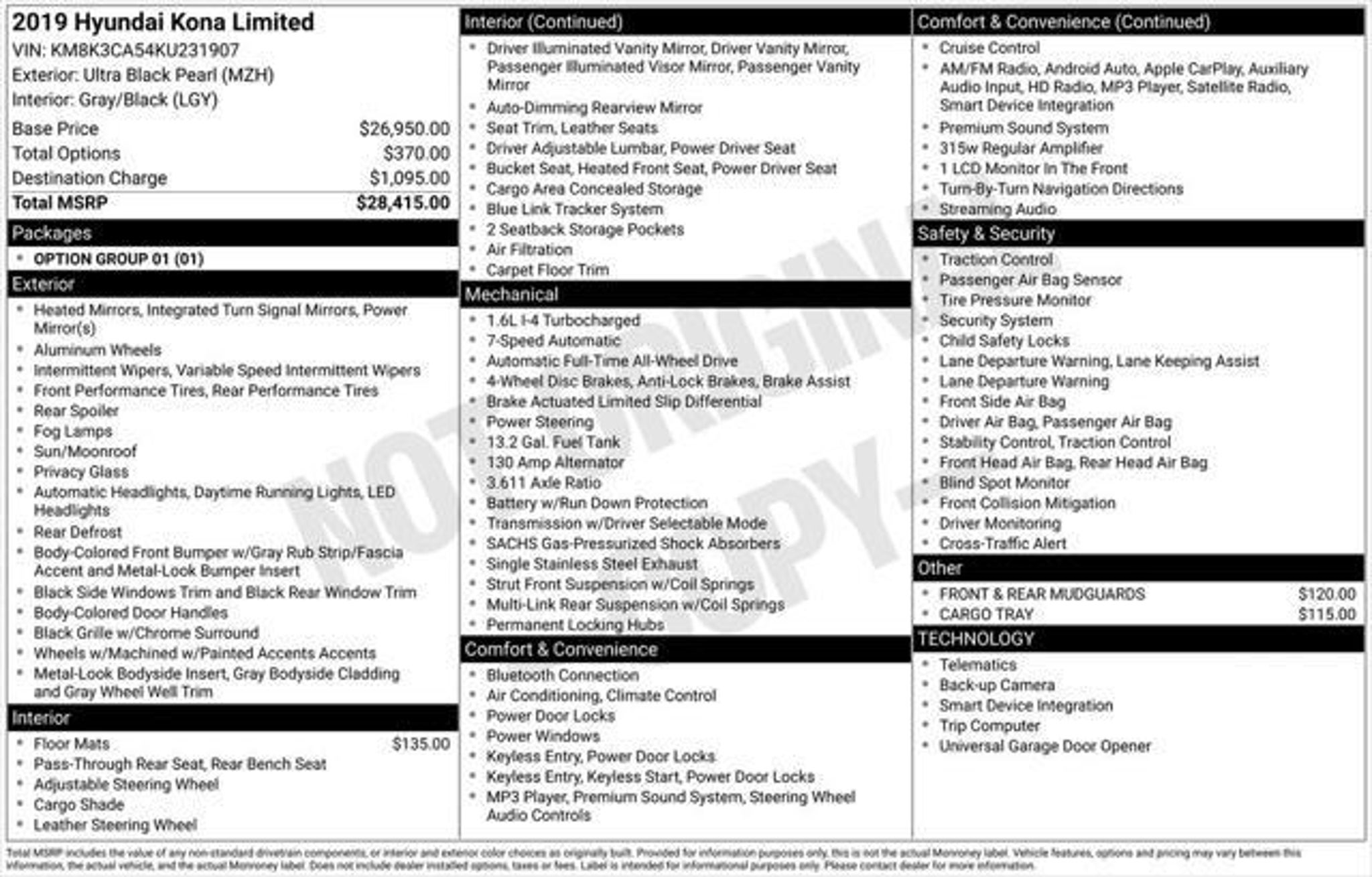 Discover the perfect blend of style, capability, and convenience in the 2019 Hyundai Kona Limited. This dynamic crossover SUV is ready to elevate your driving experience with its impressive array of features and impressive performance. "¢ 8 Speakers "¢ AM/FM radio: SiriusXM "¢ Radio: AM/FM/HD Radio/SiriusXM Audio System "¢ Air Conditioning "¢ Automatic temperature control "¢ Rear window defroster "¢ Power driver seat "¢ Power steering "¢ Power windows "¢ Remote keyless entry "¢ Steering wheel mounted audio controls "¢ Four wheel independent suspension "¢ Speed-sensing steering "¢ Traction control With its sleek, sculpted exterior and spacious, well-appointed interior, the Kona Limited offers a premium driving experience that is sure to impress. The 1.6L I4 DGI engine, paired with a 7-Speed Automatic transmission and AWD, delivers an exceptional blend of power and efficiency, with an EPA-estimated 26 city/29 highway MPG. The Kona Limited comes equipped with a host of advanced technologies and convenience features to enhance your daily driving. Enjoy the convenience of the power moonroof, the security of the Rear Parking Camera, and the seamless connectivity of Apple CarPlay and Android Auto. The Kona's impressive safety suite, including features like Automatic Emergency Braking, Lane Keeping Assist, and Blind Spot Monitoring, provide added peace of mind on the road. Whether you're navigating the city streets or exploring the open road, the 2019 Hyundai Kona Limited is the perfect companion. Its sleek design, impressive performance, and comprehensive list of features make it a standout in the crowded crossover SUV market. Visit our showroom today and experience the Kona Limited for yourself "“ we're confident you'll be impressed.
