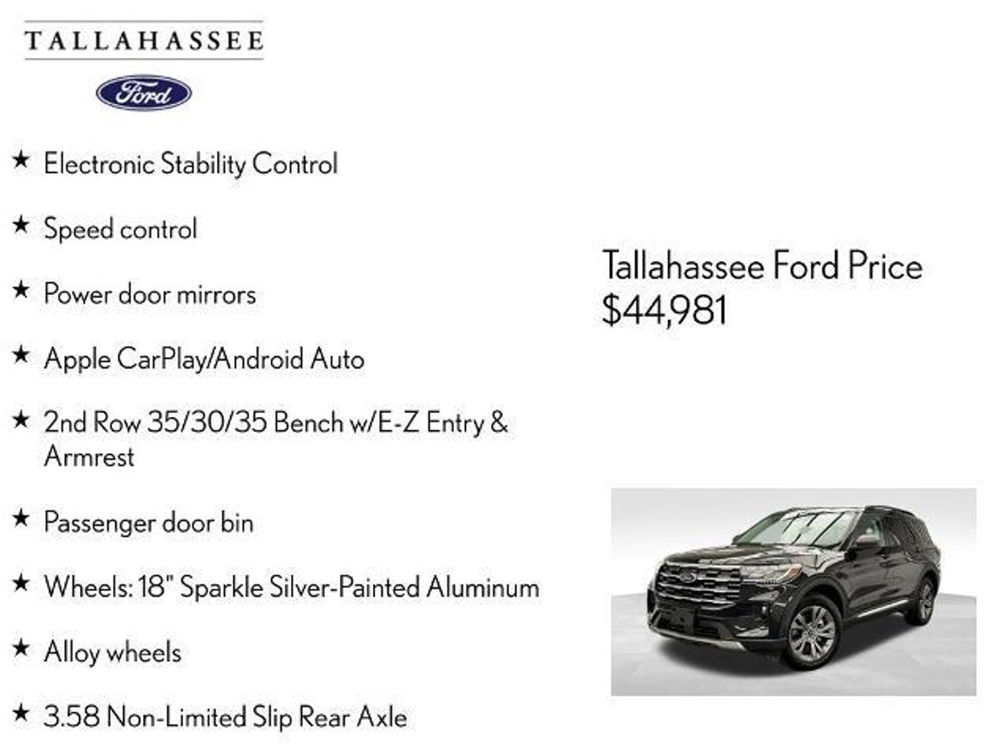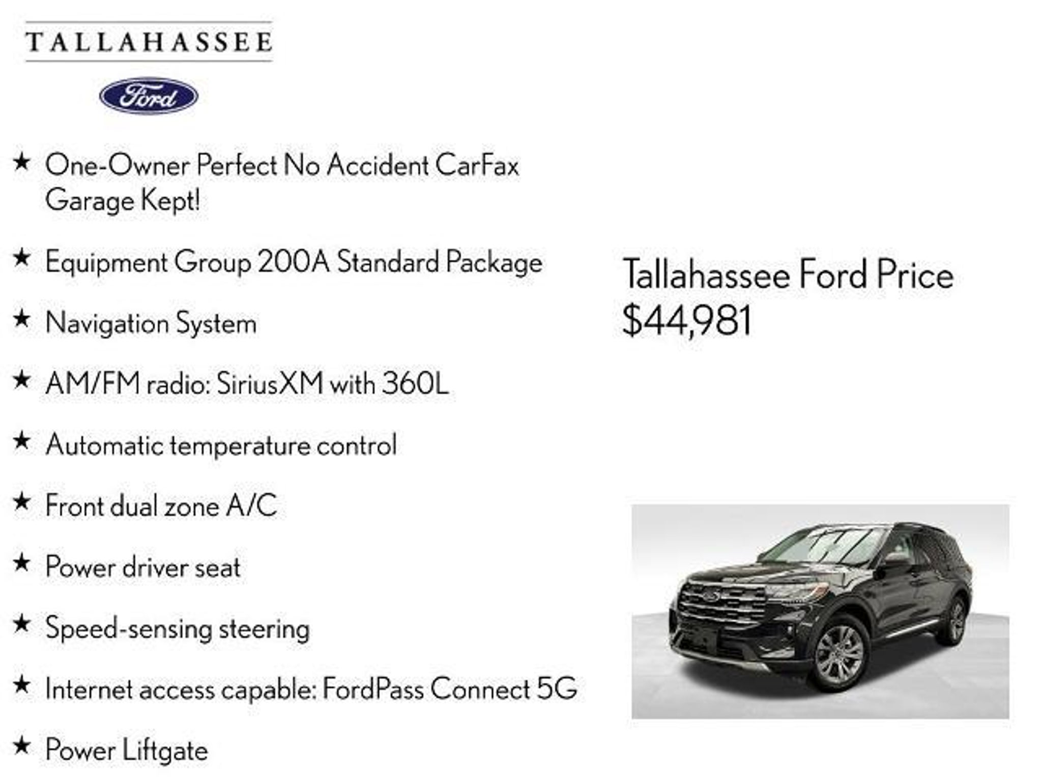 Discover the perfect blend of capability, technology, and style in this 2025 Ford Explorer Active. With its impressive 2.3L EcoBoost I-4 engine, 10-speed automatic transmission, and 4WD, this SUV is ready to take on any adventure. Boasting an exceptional fuel economy of 20 city/27 highway MPG, it's the ideal choice for those who demand both power and efficiency. ? One-Owner Perfect No Accident CarFax Garage Kept! ? Front and 2nd Rows Black Carpet Floor Mats ? Equipment Group 200A Standard Package This Explorer Active is packed with an array of premium features that elevate your driving experience, including: ? Navigation System ? AM/FM radio: SiriusXM with 360L ? Automatic Temperature Control ? Front Dual Zone A/C ? Power Driver Seat ? Speed-Sensing Steering ? Internet Access Capable: FordPass Connect 5G ? Power Liftgate ? Electronic Stability Control ? Apple CarPlay/Android Auto ? 2nd Row 35/30/35 Bench with E-Z Entry & Armrest Designed with your safety in mind, this Explorer Active comes equipped with an impressive suite of advanced safety technologies, including 911 Assist, Rear Parking Camera, and a comprehensive airbag system. As a Ford Gold Certified pre-owned vehicle, this Explorer Active has undergone a rigorous 172-point inspection and comes with the following benefits: ? Roadside Assistance ? Warranty Deductible: $100 ? Transferable Warranty ? Limited Warranty: 12 Month/12,000 Mile (whichever comes first) after new car warranty expires or from certified purchase date ? Powertrain Limited Warranty: 84 Month/100,000 Mile (whichever comes first) from original in-service date ? 22,000 FordPass Rewards Points to use toward first two maintenance visits Experience the confidence and peace of mind that comes with owning a Ford Gold Certified pre-owned vehicle. Visit our showroom today and let us demonstrate how this 2025 Explorer Active can elevate your driving experience. The listed online price reflects a $1,000 finance incentive and a $1,000 qualifying retail trade-in incentive; absence of either or both incentives will result in an increase of up to $2,000 to the final sale price.