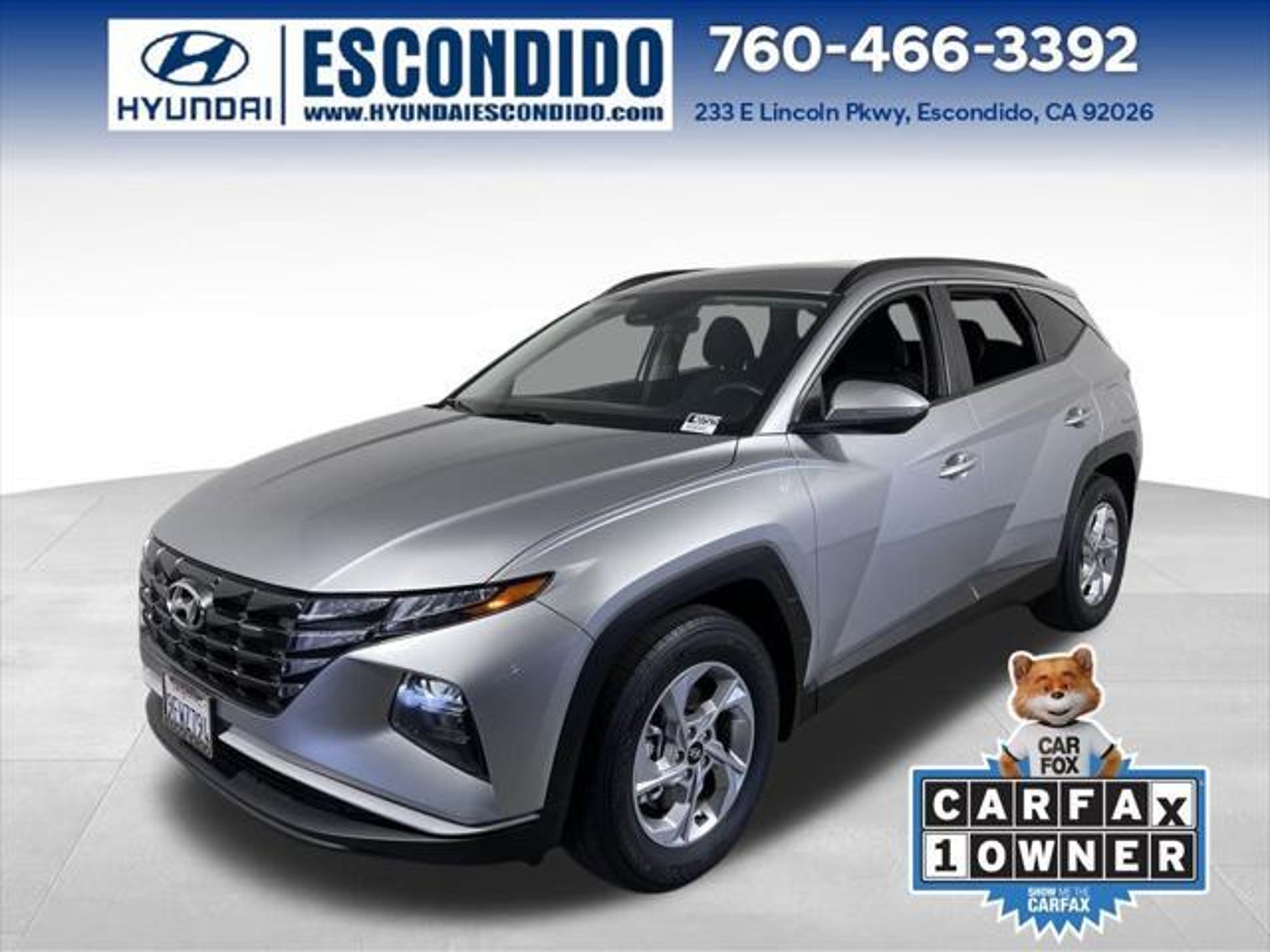 25/32 City/Highway MPG CARFAX One-Owner. Clean CARFAX. Certified. Hyundai Combined Details: * Limited Warranty: 60 Month/60,000 Mile (whichever comes first) from original in-service date (for Hyundai Certified Used Vehicles program) * Includes 10-year/Unlimited Mileage Roadside Assistance with Rental Car and Trip Interruption Reimbursement; Please See Dealers for Specific Vehicle Eligibility Requirements. 10-Year/100,000 Mile Hybrid/EV Battery Warranty. 3-Months SiriusXM Trial Subscription. Complimentary 1 Year (Connected Care & Remote Pkgs). (for Hyundai Certified Used Vehicles program), 6 Model Years Old and Newer With 80,000 - 120,000 Miles, 7-10 Model Years Old Vehicles With 120,000 Miles or Less. Powertrain Warranty 90 Days/5,000 Miles, HEV/PHEV Battery Warranty 10 Years/100,000 Miles. Roadside Assistance 90 Days/Unlimited Miles. Rental Car $35/Day Up to 5 Days. 3-Months SiriusXM Trial Subscription. (for Hyundai Select Used program) * Vehicle History (for Hyundai Certified Used Vehicles program) * 173 Point Inspection (for Hyundai Certified Used Vehicles program), 117 Point Inspection (for Hyundai Select Used program) * Warranty Deductible: $50 (for Hyundai Certified Used Vehicles program) * Powertrain Limited Warranty: 120 Month/100,000 Mile (whichever comes first) from original in-service date (for Hyundai Certified Used Vehicles program) * Roadside Assistance (for Hyundai Certified Used Vehicles program) Option Group 01, Apple CarPlay & Android Auto, Heated Front Bucket Seats, Power driver seat, Power Liftgate, ., 3.648 Axle Ratio, 4-Wheel Disc Brakes, 6 Speakers, ABS brakes, Air Conditioning, Alloy wheels, AM/FM radio: SiriusXM, Auto High-beam Headlights, Brake assist, Bumpers: body-color, Cargo Cover, Cargo Tray, Delay-off headlights, Driver door bin, Driver vanity mirror, Dual front impact airbags, Dual front side impact airbags, Electronic Stability Control, Emergency communication system: Blue Link Connected Car Service (3-year complimentary subscription), First Aid Kit, Four wheel independent suspension, Front and Rear Mudguards, Front anti-roll bar, Front Bucket Seats, Front Center Armrest, Front reading lights, Fully automatic headlights, H-Tex Seat Trim, Heated door mirrors, Heated front seats, Illuminated entry, Low tire pressure warning, Occupant sensing airbag, Outside temperature display, Overhead airbag, Overhead console, Panic alarm, Passenger door bin, Passenger vanity mirror, Power door mirrors, Power steering, Power windows, Radio data system, Radio: AM/FM/HD/SiriusXM Audio System, Rear anti-roll bar, Rear seat center armrest, Rear window defroster, Rear window wiper, Remote keyless entry, Roof rack: rails only, Security system, Speed control, Split folding rear seat, Spoiler, Stain & Odor Resistant Cloth Seat Trim, Steering wheel mounted audio controls, Tachometer, Telescoping steering wheel, Tilt steering wheel, Traction control, Trip computer, Turn signal indicator mirrors, Variably intermittent wipers, Wheel Locks, and Wheels: 17 x 7.0J Alloy. As one of the premier San Diego Hyundai dealers, Hyundai Escondido has a huge selection of new, used and certified pre-owned vehicles to choose from. We provide great service, great prices and a great experience. We are non-pushy, genuine and honest. Hyundai Escondido is a family owned and operated dealership serving Escondido, Carlsbad, Temecula, Poway, Mira Mesa, Spring Valley, La Mesa, El Cajon, Santee, Lakeside, Chula Vista, National city and all of San Diego County. Our friendly staff is funny, approachable, and very knowledgeable. We are trained to serve you and we'll bend over backwards to help you find the right financing and appropriate vehicle that meets your needs. Shimmering Silver 2023 Hyundai Tucson SEL