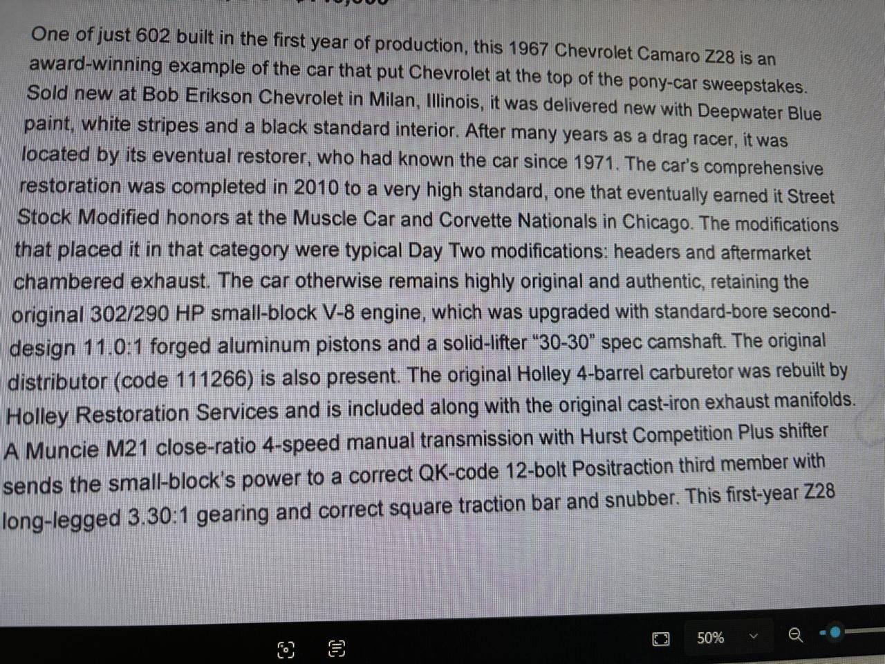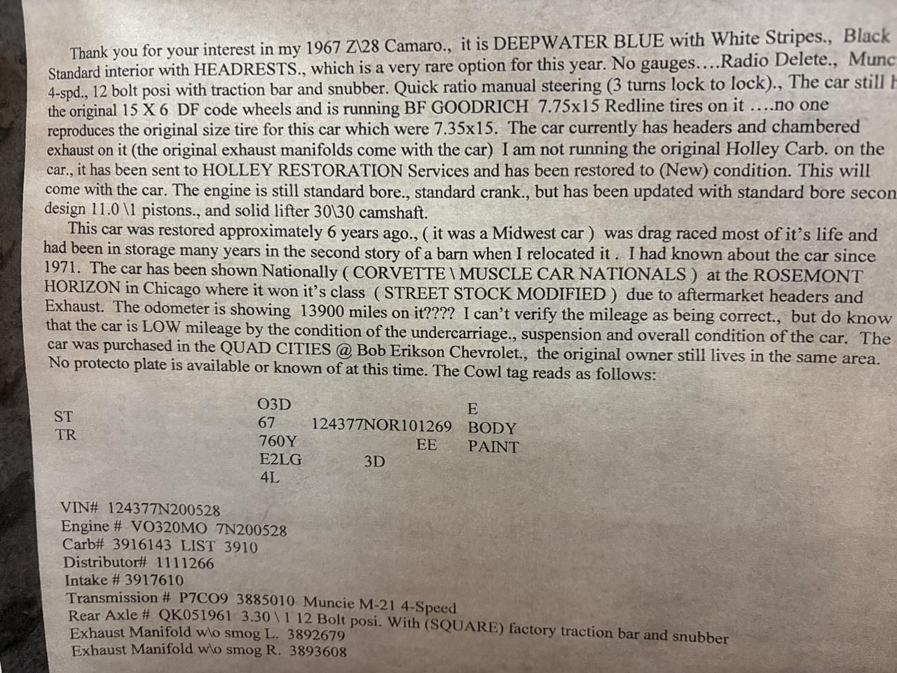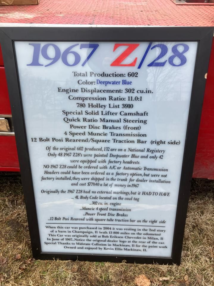 Amazing and rare Deep-Water Blue 1967 Camaro Z28 with numbers matching DZ 302 V8 with solid lifter cam shaft and 4 speed Muncie manual. Only 602 of these cars made. Local Illinois car with extremely nice restoration. Radio delete car. New headers and chambered dual exhaust that sounds so hot, it will make your ears melt. Quick ratio manual steering, power front disk brakes and 3.30:1 ratio 12 bolt posi with factory traction bar. Not many of these real deal cars left out there. Only 42 were made in this color with headrests. Don't delay, and miss out on this one. This car won best-in-class winner at MCACN in Chicago. We offer financing for good credit and 10% down. Nationwide shipping offered. Call us at 618 336 5210 to discuss a deal. Visit Vaughns Classic Cars online at vaughnsclassiccars.com to see more pictures of this vehicle or call us at 618-336-5210 today to schedule your test drive.