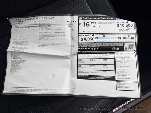 Alex Almes724-840-3499 call/text1115 Philadelphia StreetIndiana, PA 15701The 2024 Mercedes-AMG GLS 63 is a commanding full-size luxury performance SUV that blends blistering power with opulent comfort. Powered by a 4.0L twin-turbo V8 engine with mild hybrid assist, it delivers an impressive 603 horsepower and 627 lb-ft of torque, rocketing from 0-60 mph in around 4.1 seconds while paired with AMG Performance 4MATIC+ all-wheel drive and a 9-speed automatic transmission.This low-mileage example (just 19k miles) features premium upgrades like Manufaktur Alpine Grey paint, exclusive Nappa leather upholstery with diamond stitching, carbon fiber accents, a heated AMG Performance steering wheel, advanced AMG ACTIVE RIDE CONTROL suspension, and a suite of luxury tech including a 12.3-inch digital cockpit, MBUX infotainment, Apple CarPlay/Android Auto, and comprehensive driver assists.With seating for up to seven, high-end amenities like multi-contour ventilated seats, a Burmester sound system, and AMG-specific enhancements, its the ultimate family hauler for those who demand supercar thrills in a spacious, refined packagethough expect thirsty fuel economy around 14/18 mpg city/highway. A thrilling, head-turning machine thats barely broken in!Call or text Alex about this vehicle at 724-840-3499 for more information or to set up an appointment. I offer Facetime as a way to virtually inspect the cars before purchase. If you havent been on our website yet, please visit www.autosportco.com to view 25+ pictures of each vehicle as some websites only list a few photos.This vehicle is located at 1115 Philadelphia Street, Indiana, PA 15701. These vehicles are mostly stored within our indoor showroom. We accept trades, offer transportation services and can assist with financing options. WeBe Autos Specializes in Marketing and Advertising Muscle, Classic, Vintage and Specialty Cars. We offer Professional Photography, HD Movies, and Staging that Sells Cars. Let us showcase and sell your specialty car. Please visit our website for more details. Keep in Touch, Michael Runnalls Specialty Car Marketing & Media WeBe Autos Ltd. Long Island, NY 11780 Michael@WeBeAutos.com www.WeBeAutos.com (O)631-339-0399 (C)516-729-2003 Skype: webeautos (F)631-389-2605 - - Air Conditioning, Climate Control, Dual Zone Climate Control, Cruise Control, Tinted Windows, Power Steering, Power Windows, Power Mirrors, Leather Steering Wheel, Leather Shifter, Power Drivers Seat, Heated Seat, Rear Air Conditioning, Clock, Tachometer, Digital Info Center, Homelink System, Tilt Steering Wheel, Telescoping Steering Wheel, Steering Wheel Radio Controls, Sunroof, Moonroof, Driver Airbag, Passenger Airbag, Side Airbags, Keyless Entry, Security System, ABS Brakes, Traction Control, Dynamic Stability, Rear Defogger, Intermittent Wipers, AM/FM, Anti-Theft, Leather Interior Surface, Child Safety Door Locks, Electronic Brake Assistance, Limited Slip Differential, Locking Differential, Electronic Parking Aid, Remote Ignition, Heated Steering Wheel, Adjustable Foot Pedals, Tire Pressure Monitor, Subwoofer, Front Power Lumbar Support, Leather Seat, Load Bearing Exterior Rack, Automatic Headlights, Daytime Running Lights, Full Size Spare Tire, Heated Exterior Mirror, Electrochromic Interior Rearview Mirror Adaptive headlights, Air Conditioned Seats, Aux. Audio Input, Bluetooth, Carpeted Floor Mats, Center Arm Rest, Child Proof Door Locks, Daytime Running Lights, Distronic, Front AC Seats, Front Heated Seats, Heads Up Display, Heated Mirrors, Overhead Console, Parking Sensors, Power Lift Gate, Rear Fog Lamps, Rear Heated Seats , Rear Spoiler, Rear Spoiler, Rear Wipers, Remote Trunk Lid, Reverse Camera, Roll Stability Control, Running Boards, Side Curtain Airbags, Sliding Rear Window, Sport Seats, Tire Pressure Monitor, Vanity Mirrors - Contact Michael Runnalls at 631-339-0399 or Michael@WeBeAutos.com for more information. -