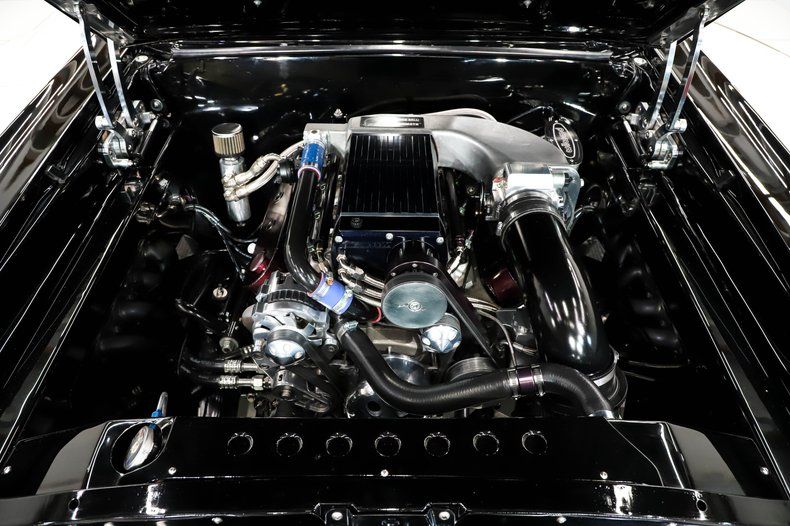 ENGINE COMPARTMENT: The engine bay of this '67 Chevelle is nothing short of breathtaking-and it makes you want to take it for a spin immediately. At its heart is a stout 6.0-liter LQ4 block, built for serious performance with Manley forged crank and rods, SRP pistons, a Comp cam, prototype Gale Banks Engineering heads, roller rockers, and a GMPP timing set. With 9:1 compression and a Kenne Bell Mammoth supercharger running 10 psi-blueprinted and finely tuned-along with a 102mm throttle body, CBM computer, GM coils, and Edelbrock headers, the pro builder estimates a solid 700"750 horsepower at your command. The front of the motor features a polished serpentine pulley system driving the alternator, air conditioning, and billet power steering pump. Additional details include a catch can system with braided lines, custom coil covers, and an aluminum radiator paired with an electric fan to keep it running cool. The entire engine bay is smoothed and detailed with custom-fabricated metal, painted gloss black, while billet hinges lift the hood effortlessly-every inch of this space is as functional as it is show-stopping.