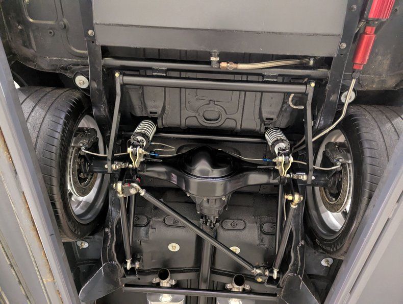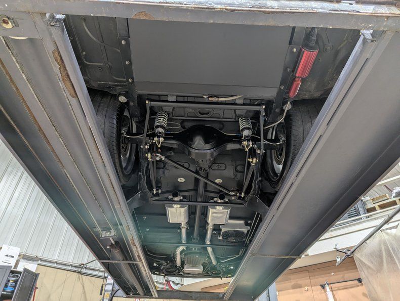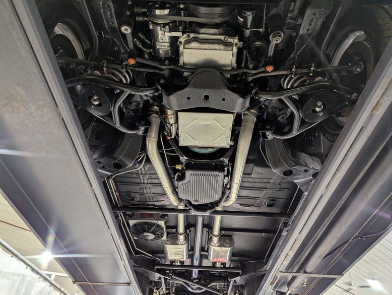 UNDERSIDE: The body was off of the frame and every item was upgraded. The front end has Heidts 2 inch drop spindles, tubular control arms, coilover adjustable gas shocks, and a splined swaybar. In back the frame was narrowed 5 inches per side, gusseted and reinforced to accommodate the wide tires. Upgraded with a 3 link system with adjustable panhard bar, adjustable control arms, coilover adjustable gas shocks, and a splined swaybar. Wilwood 4 wheel disc brakes with big drilled and slotted rotors, 6 piston calipers in front, 4 piston in back. The exhaust is custom made, ceramic coated 2.5" pipes with crossover and Flowmaster mufflers. A custom fuel tank and an Aeromotive A1000 fuel pump feeds the beast under the hood. Looking up at the motor it has an extra capacity oil pan and a high torque starter. The Turbo 400 automatic was pro built and has a 2800 stall and aluminum finned oil pan. In back is a Harrison Racing Fab 9 rear end with Detroit Locker 3.50 gears. The fabricated floors were coated in durable chip guard paint.