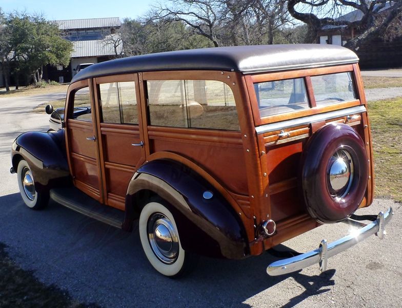 Beginning in 1940, after the relationship between Ford and the Murray Corporation went south, Ford needed an alternative way to produce their Woodie Station Wagon. This led to Ford having the idea of fully in house production will all body assembly being completed in Michigan and then sent to assembly plants fully trimmed out. They made the change and with it also redesigned the overall look. A lot of changes were incorporated including a more rounded roofline at the windshield, the rear quarter panels were now one piece, new grill design and the rear doors were no longer "suicide" now opening towards the front. They also relocated the spare back to the tailgate as it was in the mid 30's. Management was ultimately very happy as the quality increased while also coming in at a lower price point. This beautiful 1940 Deluxe was found in 2007 where it was tucked away in a San Francisco boatyard. It was then sent to Jim Lowrey's restoration shop in Tilton, New Hampshire by a well known collector Michael Dingman. The result is a beautiful frame off restored car that looks as though it could be brand new on a showroom in 1940. All of the wood work was done by Mike Nickels in Traverse, Michigan who pulled out all the stops. The wood used during normal production was somewhat random so they opted for the high end birdseye maple. Due to being such a treasured wood this grain was often reserved for Henry Ford's small collection or special customers. It is absolutely gorgeous and the Maroon painted steel is the perfect backdrop to highlight its beauty. It is clear that during the build a large effort was made to keep as original and factory looking as possible. The level of detail is unmatched by most vehicles down to small things like the hardware used all having the heads aligned to face the same direction. It wears all its correct chrome and trim as well as the correct brown grain leather roof. The glass is all in great condition with a 2 piece windshield and pop up rear window. The painted to match wheels feature Ford Deluxe hubcaps with beauty rings and the wide white wall tires look perfect on the car.