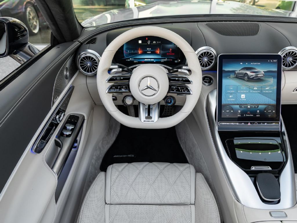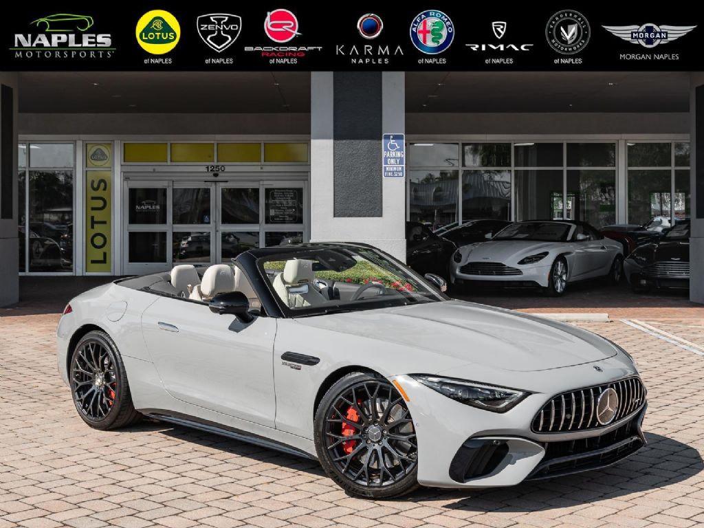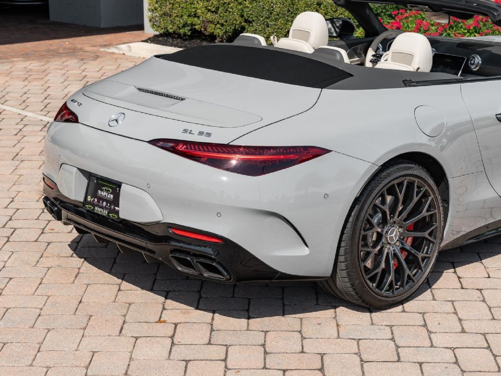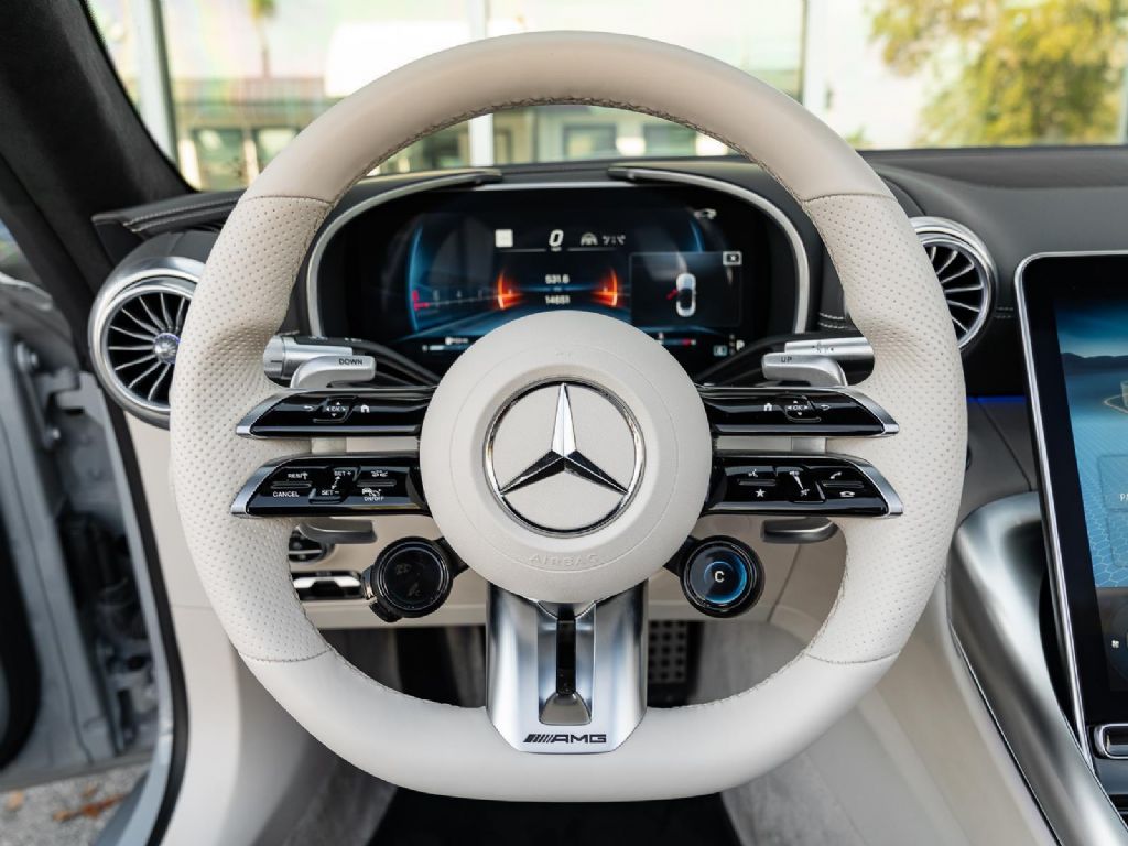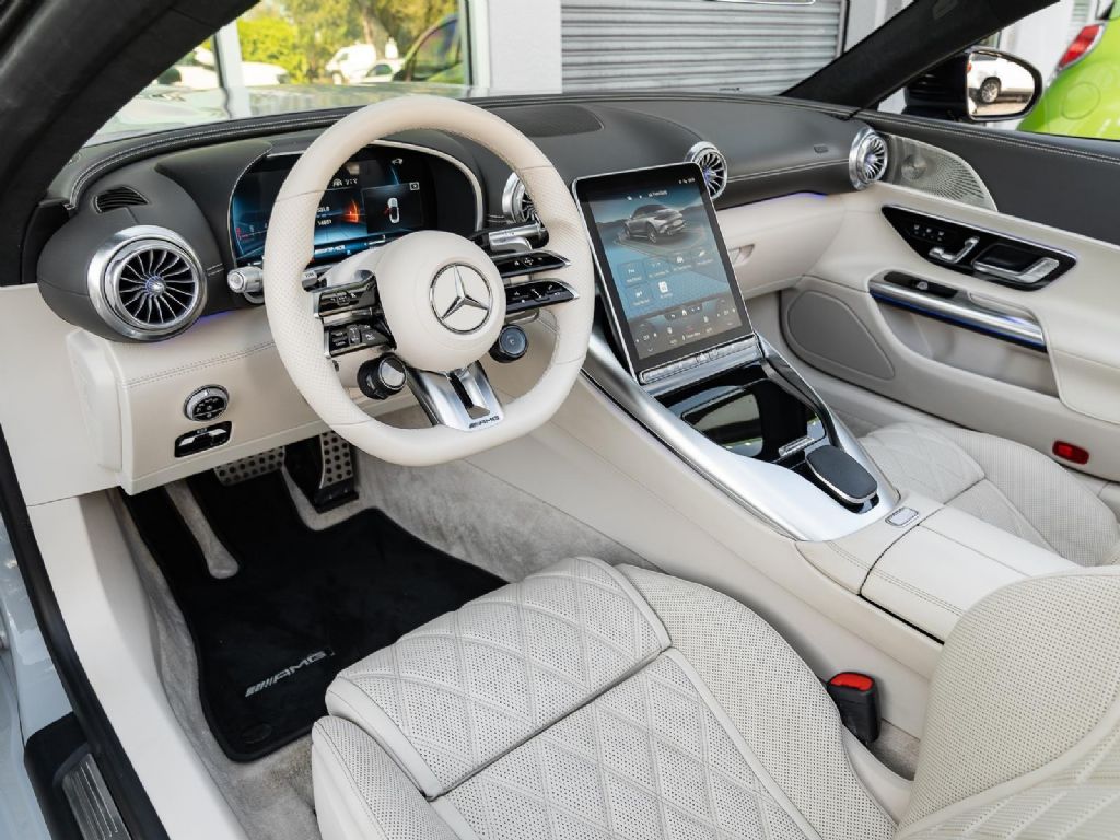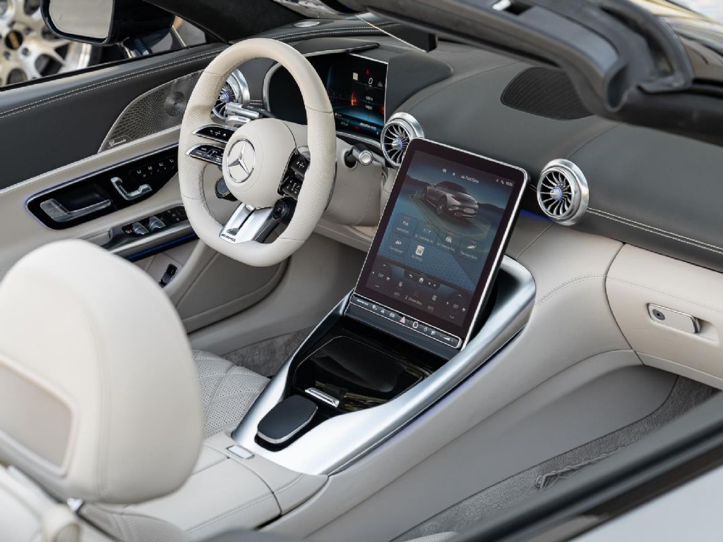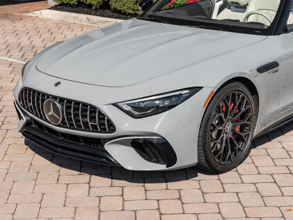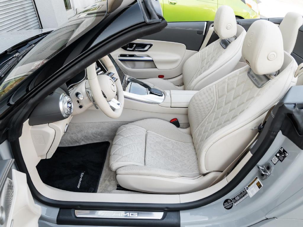 This 2022 Mercedes Benz SL 55 AMG represents a complete reinvention of the iconic SL platform, combining modern AMG performance engineering with grand touring refinement and everyday usability. Finished in sophisticated Alpine Grey over a Macchiato Beige interior and showing only 14,651 miles, this example offers a striking balance of sportiness and luxury with near new condition appeal. The redesigned chassis features an aluminum intensive architecture developed by AMG, paired with advanced 4MATIC+ all wheel drive for enhanced traction and confidence in all driving conditions. Inside, the cabin blends cutting edge technology with premium craftsmanship, highlighted by turbine style vents, a portrait oriented central display, and beautifully tailored leather surfaces that elevate the roadster experience while maintaining a distinctly performance focused cockpit.