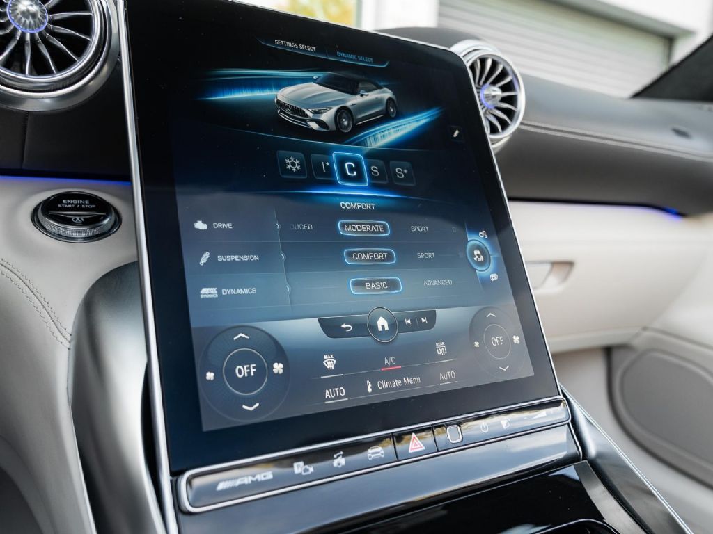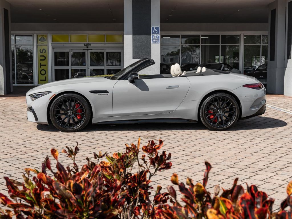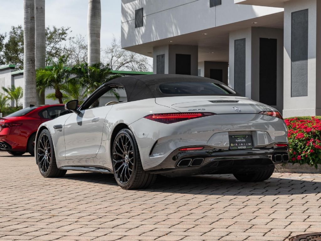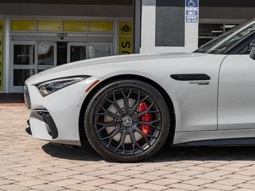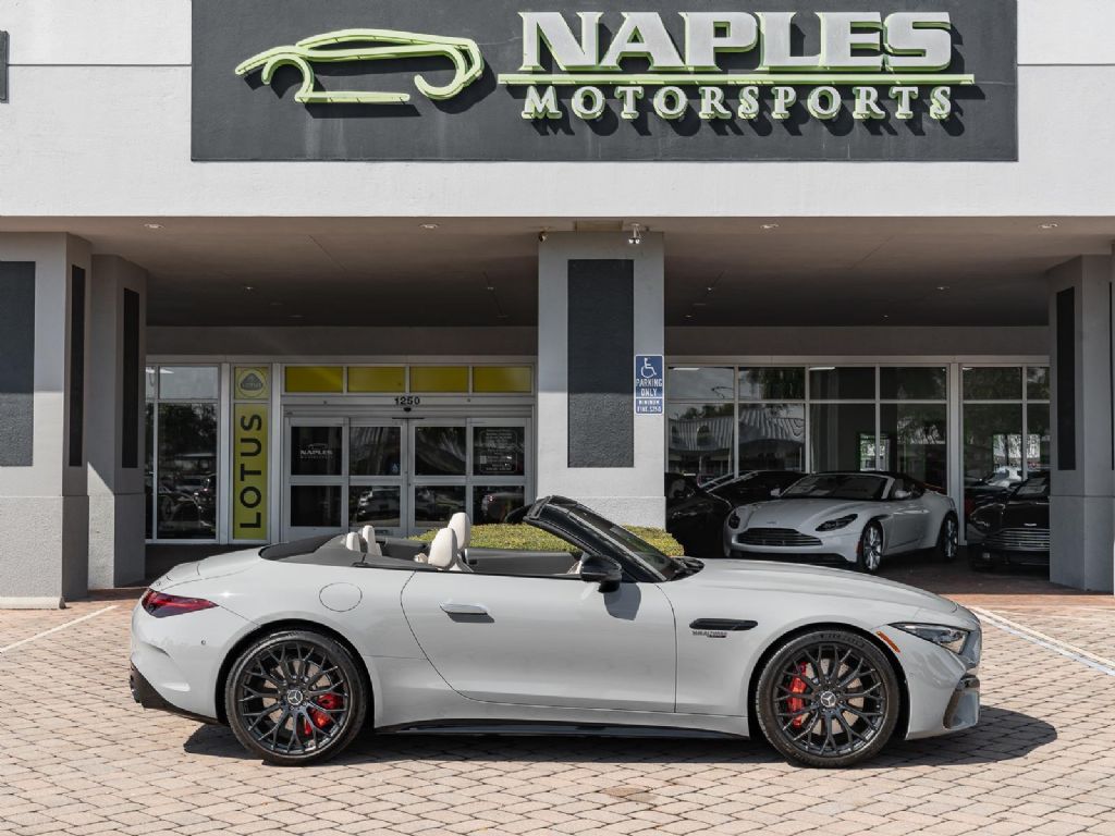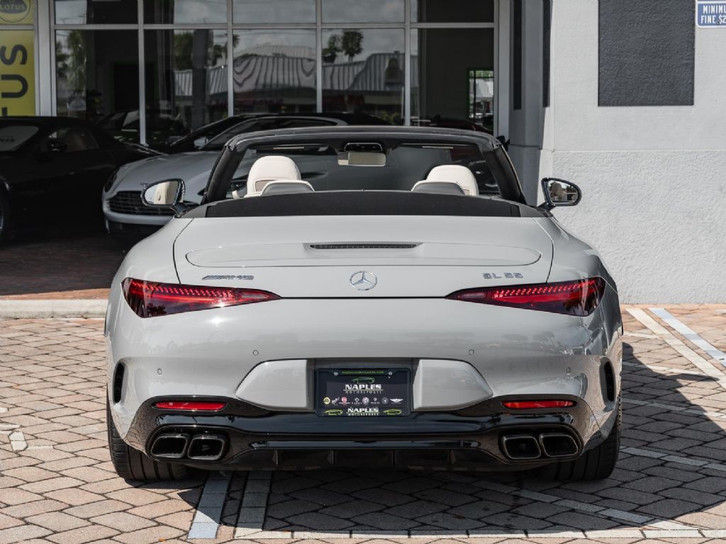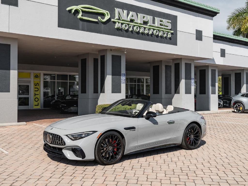 This 2022 Mercedes Benz SL 55 AMG represents a complete reinvention of the iconic SL platform, combining modern AMG performance engineering with grand touring refinement and everyday usability. Finished in sophisticated Alpine Grey over a Macchiato Beige interior and showing only 14,651 miles, this example offers a striking balance of sportiness and luxury with near new condition appeal. The redesigned chassis features an aluminum intensive architecture developed by AMG, paired with advanced 4MATIC+ all wheel drive for enhanced traction and confidence in all driving conditions. Inside, the cabin blends cutting edge technology with premium craftsmanship, highlighted by turbine style vents, a portrait oriented central display, and beautifully tailored leather surfaces that elevate the roadster experience while maintaining a distinctly performance focused cockpit.