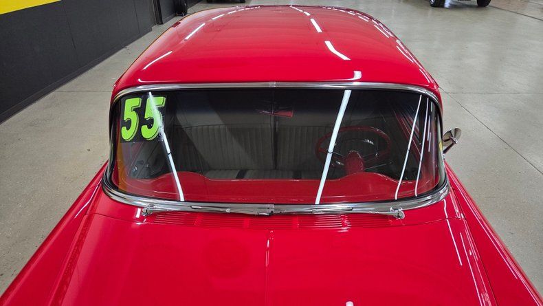 1955 Chevrolet 2dr Sedan in Viper Red paint. This one has a 327 V8 (out of a 1967 Corvette, 350hp) with a TH400 auto transmission with 2800 stall. Equipped with true dual exhaust, rams horn manifold, 202 camelback heads, powder coated frame, aluminum radiator, & Vintage air. A/C BLOWS COLD! Chrome and brightwork in good shape and shows well. Riding on polished Weld wheels with BFGoodrich radial tires. Paint shows well front to back on this one. Side glass is lightly tinted, check with local and state laws in your area. Previous owner states this was a frame-off restoration. Beige bench seat interior with matching door cards and red painted dash. Custom center console with Hurst shifter, cupholders, aftermarket gauges, and stereo assembly.