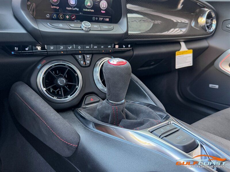 "2024 Chevrolet Camaro ZL1. Panther Black Matte Exterior with Jet Black w/Red Accent Interior. Features Include: 650 Horsepower Supercharged 6.2L V8 Engine, 6 Speed Manual Transmission, Red Brake Calipers, 20"" Multi-Spoke Forged Aluminum Wheels, Black Panther Collectors Edition, Black Center Stripe, Collector Edition Badging, Black Fuel Door w/Exposed Carbon Fiber Insert, Rear Spoiler in Carbon Fiber, Satin Black Outside Mirrors, Exposed Carbon Fiber Hood Insert, Dual Mode Exhaust, LED Tail Lights, HID Headlamps, LED DRLs, Keyless Open with Push Button Ignition, Illuminated Sill Plates, Recaro Performance Front Bucket Seats, Suede/Leather Interior Trim, Suede Multifunctional Steering Wheel, Carbon Fiber Instrument Panel Molding, Red Seat Belts, Shift Knob w/ Carbon Fiber, Performance Data Video Recorder, Head-Up Display, Chevrolet Infotainment 3 Premium System, 8"" Touchscreen, Premium Bose Audio System, Wireless Android Auto, Wireless Apple CarPlay, Driver Mode Selector, Dual Zone Automatic Climate Control, Rear Camera Mirror, Lane Change Alert, Rear Park Assist, Rear Vision Camera, Wi-Fi Hotspot, Wireless Charging, Smartphone Integration, Bluetooth, Navigation, SiriusXM. Call For Price. Financing and leasing available. We ship worldwide. We pay top dollar for lightly used sports cars, Call or text our Product Specialist today at 239-522-2262 or email us at sales@gcmworks.com. Fees and Taxes: $1199.00 Doc Fee on all Purchases. Out of state buyers are responsible for all state, county, city taxes and fees, as well as title/registration fees in the state that the vehicle will be registered. -- INSTALLED FEATURES: Air filtration, Front air conditioning: automatic climate control, Front air conditioning zones: dual, Airbag deactivation: occupant sensing passenger, Front airbags: dual, Knee airbags: dual front, Side airbags: front, Side curtain airbags: front / rear, Antenna type: diversity / element / mast, Auxiliary audio input: Bluetooth / iPod/iPhone / jack / USB, Premium brand: Bose, Radio: AM/FM / touch screen display / voice operated, Radio data system, Satellite radio: SiriusXM, Speed sensitive volume control, Total speakers: 9, ABS: 4-wheel, Braking assist, Electronic brakeforce distribution, Electronic parking brake: auto off, Front brake type: ventilated disc, Power brakes, Premium brakes: Brembo, Rear brake type: ventilated disc, Door sill trim: illuminated scuff plate, Door trim: aluminum, Floor mat material: carpet, Floor material: carpet, Floor mats: front, Foot pedal trim: alloy, Heated steering wheel, Shift knob trim: aluminum / faux suede, Steering wheel trim: faux suede, Ambient lighting: color-adjustable, Capless fuel filler system, Center console: front console with armrest and storage, Cruise control, Cupholders: 2 / front, Memorized settings: 2 driver / driver seat / side mirrors, Multi-function remote: panic alarm / proximity entry system / trunk release, One-touch windows: 2, Power outlet(s): 12V front, Power steering: variable/speed-proportional, Push-button start, Reading lights: front, Rearview mirror: camera-based, Steering wheel: tilt and telescopic, Steering wheel mounted controls: audio / cruise control / voice control, Storage: door pockets, Vanity mirrors: dual illuminating, Wireless charging station: front, Door handle color: body-color, Exhaust: quad tip, Exhaust tip color: stainless steel, Front bumper color: body-color, Grille color: black, Mirror color: body-color, Rear bumper color: body-color, Rear spoiler: wing, Rear spoiler color: body-color, Window trim: black, Connected in-car apps: app marketplace integration / Google POIs / Google search, Infotainment: Chevrolet Infotainment System, Infotainment screen size: 8 in., Smartphone integration: wireless Android Auto / wireless Apple CarPlay, Clock, Compass, Customizable instrument cluster, Digital odometer, External temperature display, Fuel economy display: MPG / range, Gauge: oil pressure / tachometer, Head-up display, Instrument cluster screen size: 8 in., Multi-function display, Trip odometer, Warnings and reminders: low fuel level / low oil level / maintenance due, Daytime running lights: LED, Headlights: auto delay off / auto on/off / HID/Xenon / wiper activated, Taillights: LED / tinted, Side mirror adjustments: power / reverse gear tilt, Side mirrors: driver side auto-dimming / heated, Auxiliary oil cooler, Auxiliary transmission fluid cooler, Battery: maintenance-free, Battery saver, Drive mode selector, Limited slip differential: rear, Blind spot safety: sensor/alert, Camera system: rearview, Child seat anchors: LATCH system, Cross traffic alert: rear, Crumple zones: front / rear, Emergency interior trunk release, Parking sensors: rear, Pre-collision warning system: audible warning / visual warning, Programmable safety key, Rearview monitor: in dash, Front seatbelts: 3-point, Rear seatbelts: 3-point, Seatbelt pretensioners: front, Seatbelt warning sensor: front, Driver seat: heated / ventilated, Driver seat power adjustments: 8 / height / reclining, Front headrests: 2 / adjustable, Front seat type: Recaro, Passenger seat: heated / ventilated, Passenger seat power adjustments: 6 / height / reclining, Rear seat folding: one-piece, Rear seat type: bench, Upholstery: leather-trimmed, Upholstery accents: faux suede, Anti-theft system: alarm / vehicle immobilizer, Power door locks: anti-lockout, Stability control, Traction control, Active suspension, Driver adjustable suspension: ride control, Front shock type: monotube, Front spring type: coil, Front stabilizer bar, Front struts: MacPherson, Front suspension classification: independent, Front suspension type: double ball joint, Rear shock type: monotube, Rear spring type: coil, Rear stabilizer bar, Rear suspension classification: independent, Rear suspension type: multi-link, Suspension control: magnetic, Tuned suspension: sport, Driver assistance app: roadside assistance, Electronic messaging assistance: voice operated / with read function, Han