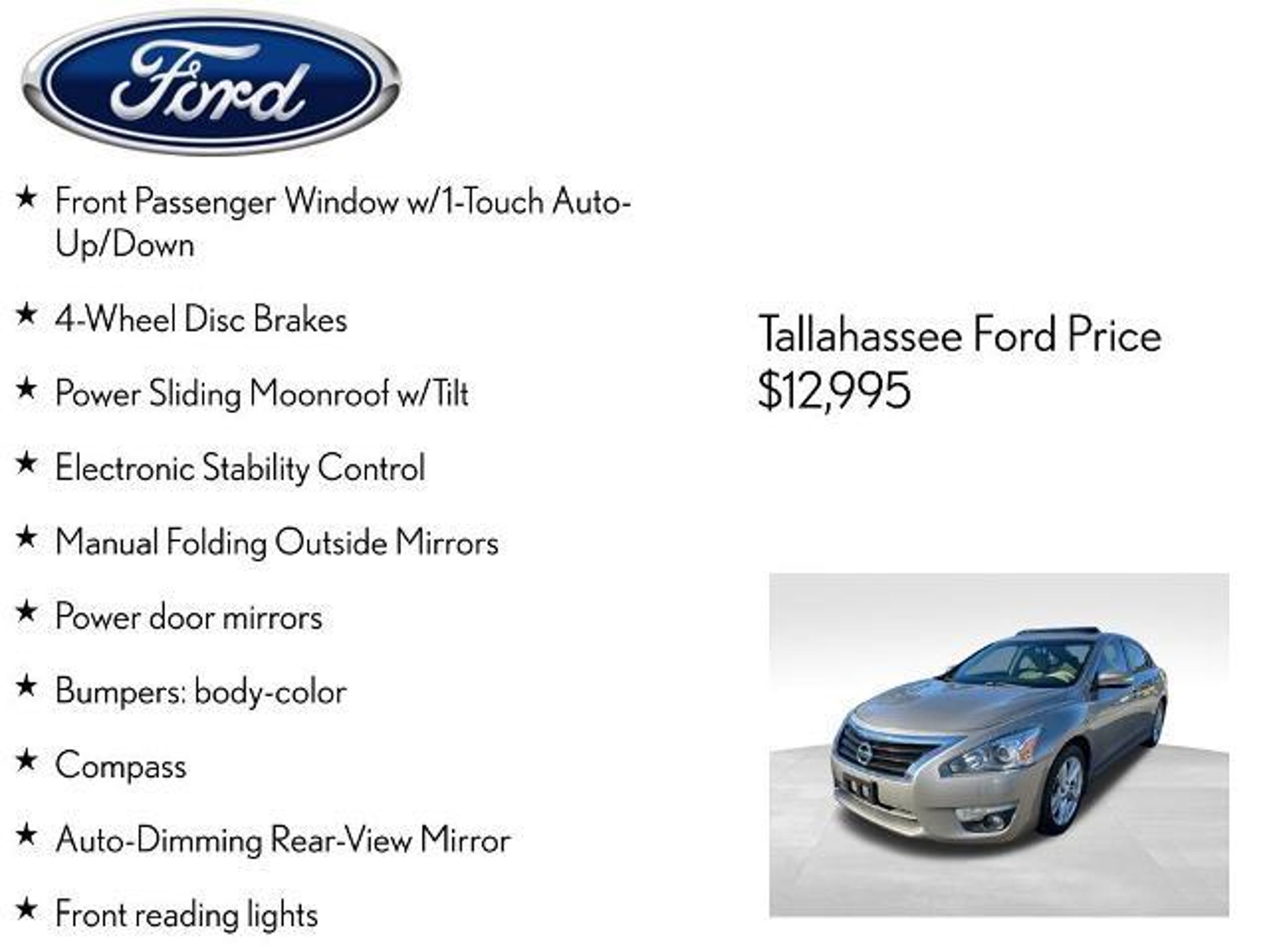 Take a closer look at this impressive 2015 Nissan Altima 2.5 SV. With its sleek beige exterior and well-appointed interior, this sedan offers the perfect blend of style and substance. Boasting an efficient 2.5L 4-cylinder engine and CVT transmission, it delivers an impressive 27 city/38 highway MPG, making it an exceptional value in its class. - Power Sliding Moonroof with Tilt - HomeLink Universal Transceiver - Front Passenger Window with 1-Touch Auto-Up/Down - Manual Folding Outside Mirrors - Auto-Dimming Rearview Mirror - Compass - Side Cargo Net The Convenience Package takes this Altima to the next level, adding rear A/C vents, a mood lamp, and illuminated kick plates for a touch of premium flair. Slip into the supportive cloth seats, fire up the AM/FM/CD/MP3 audio system, and enjoy the convenience of steering wheel-mounted controls and remote keyless entry. Safety is also a top priority, with features like Electronic Stability Control, 4-Wheel Disc Brakes, and a suite of airbags to give you peace of mind on the road. The Rear View Camera makes parking a breeze, while the 17-inch alloy wheels and speed-sensitive wipers add a finishing touch of sophistication. Whether commuting, running errands, or embarking on a weekend adventure, this 2015 Nissan Altima 2.5 SV is ready to elevate your driving experience. Schedule a test drive today and discover why it's the perfect match for your lifestyle. The listed online price reflects a $1,000 finance incentive and a $1,000 qualifying retail trade-in incentive; absence of either or both incentives will result in an increase of up to $2,000 to the final sale price.