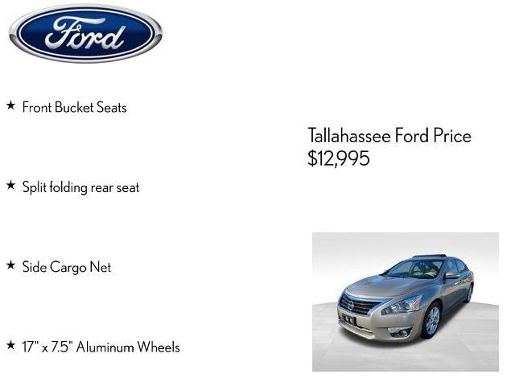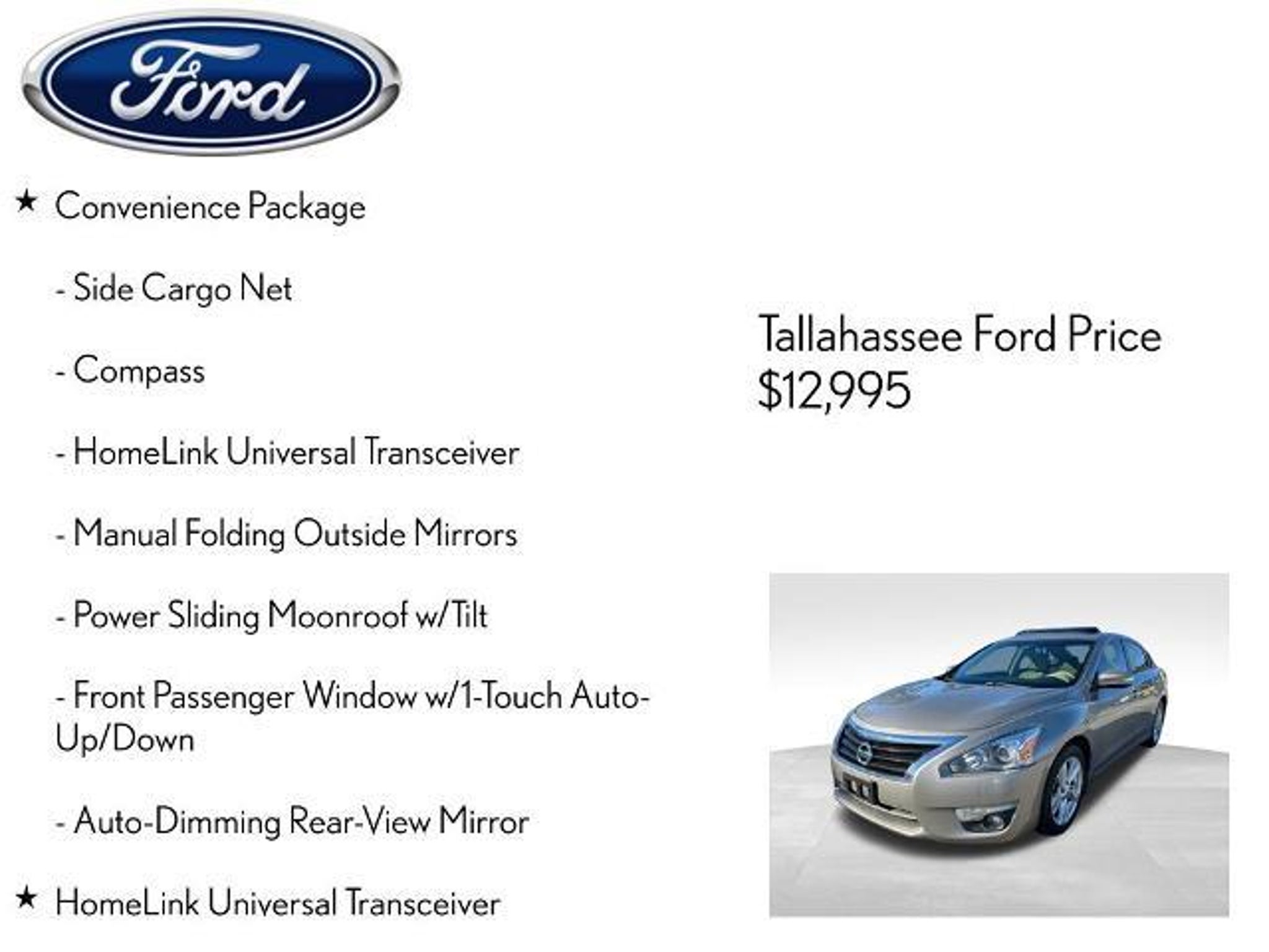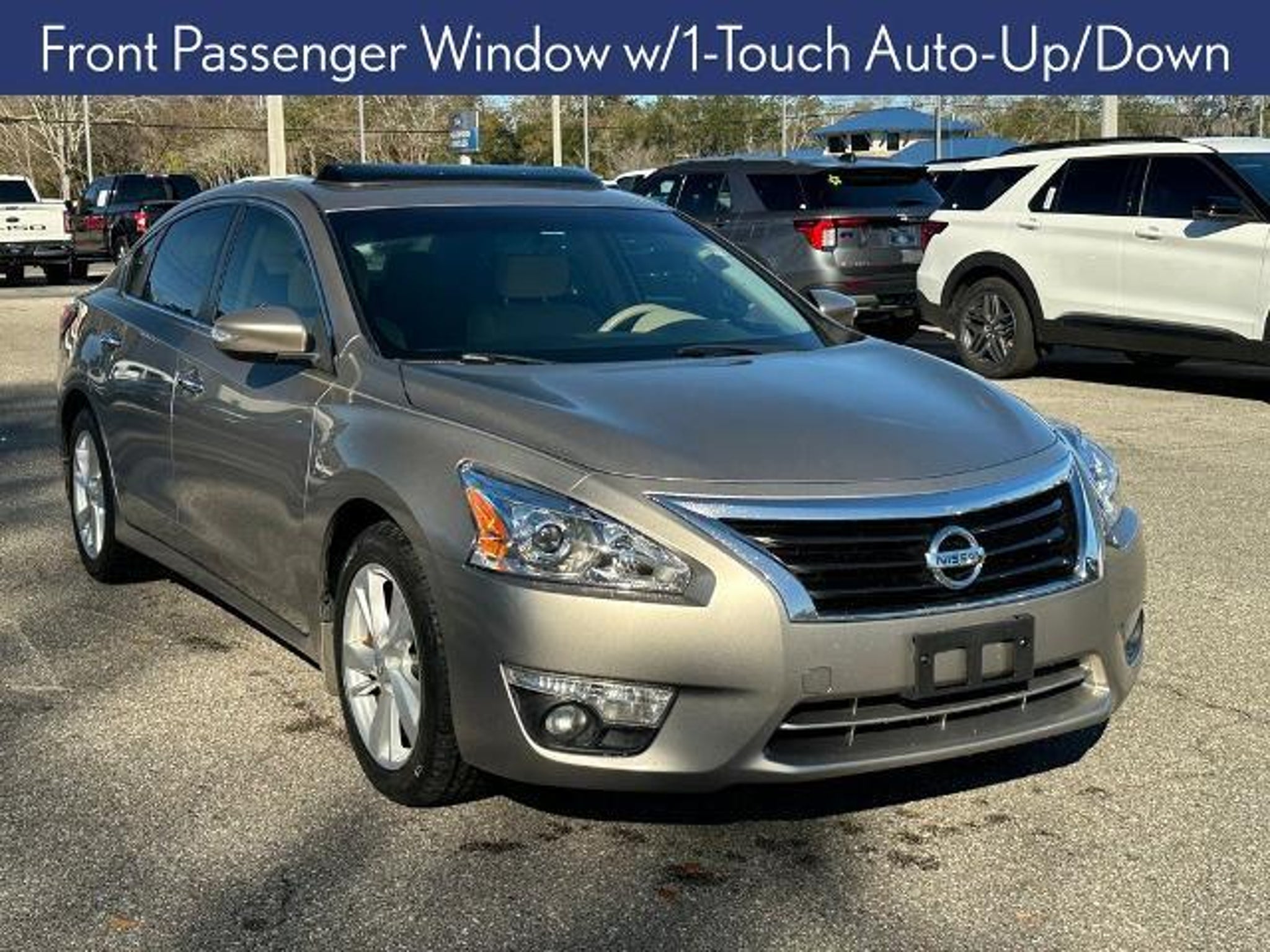 Take a closer look at this impressive 2015 Nissan Altima 2.5 SV. With its sleek beige exterior and well-appointed interior, this sedan offers the perfect blend of style and substance. Boasting an efficient 2.5L 4-cylinder engine and CVT transmission, it delivers an impressive 27 city/38 highway MPG, making it an exceptional value in its class. - Power Sliding Moonroof with Tilt - HomeLink Universal Transceiver - Front Passenger Window with 1-Touch Auto-Up/Down - Manual Folding Outside Mirrors - Auto-Dimming Rearview Mirror - Compass - Side Cargo Net The Convenience Package takes this Altima to the next level, adding rear A/C vents, a mood lamp, and illuminated kick plates for a touch of premium flair. Slip into the supportive cloth seats, fire up the AM/FM/CD/MP3 audio system, and enjoy the convenience of steering wheel-mounted controls and remote keyless entry. Safety is also a top priority, with features like Electronic Stability Control, 4-Wheel Disc Brakes, and a suite of airbags to give you peace of mind on the road. The Rear View Camera makes parking a breeze, while the 17-inch alloy wheels and speed-sensitive wipers add a finishing touch of sophistication. Whether commuting, running errands, or embarking on a weekend adventure, this 2015 Nissan Altima 2.5 SV is ready to elevate your driving experience. Schedule a test drive today and discover why it's the perfect match for your lifestyle. The listed online price reflects a $1,000 finance incentive and a $1,000 qualifying retail trade-in incentive; absence of either or both incentives will result in an increase of up to $2,000 to the final sale price.