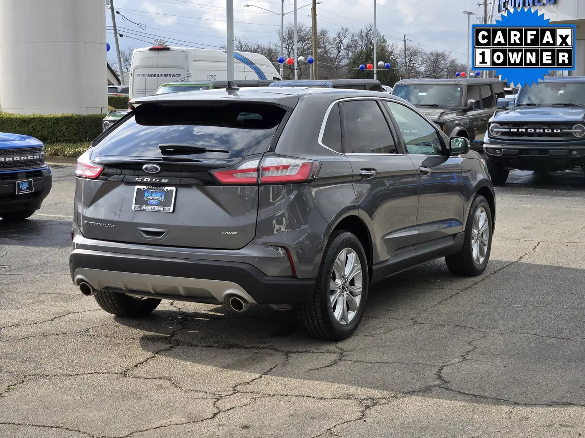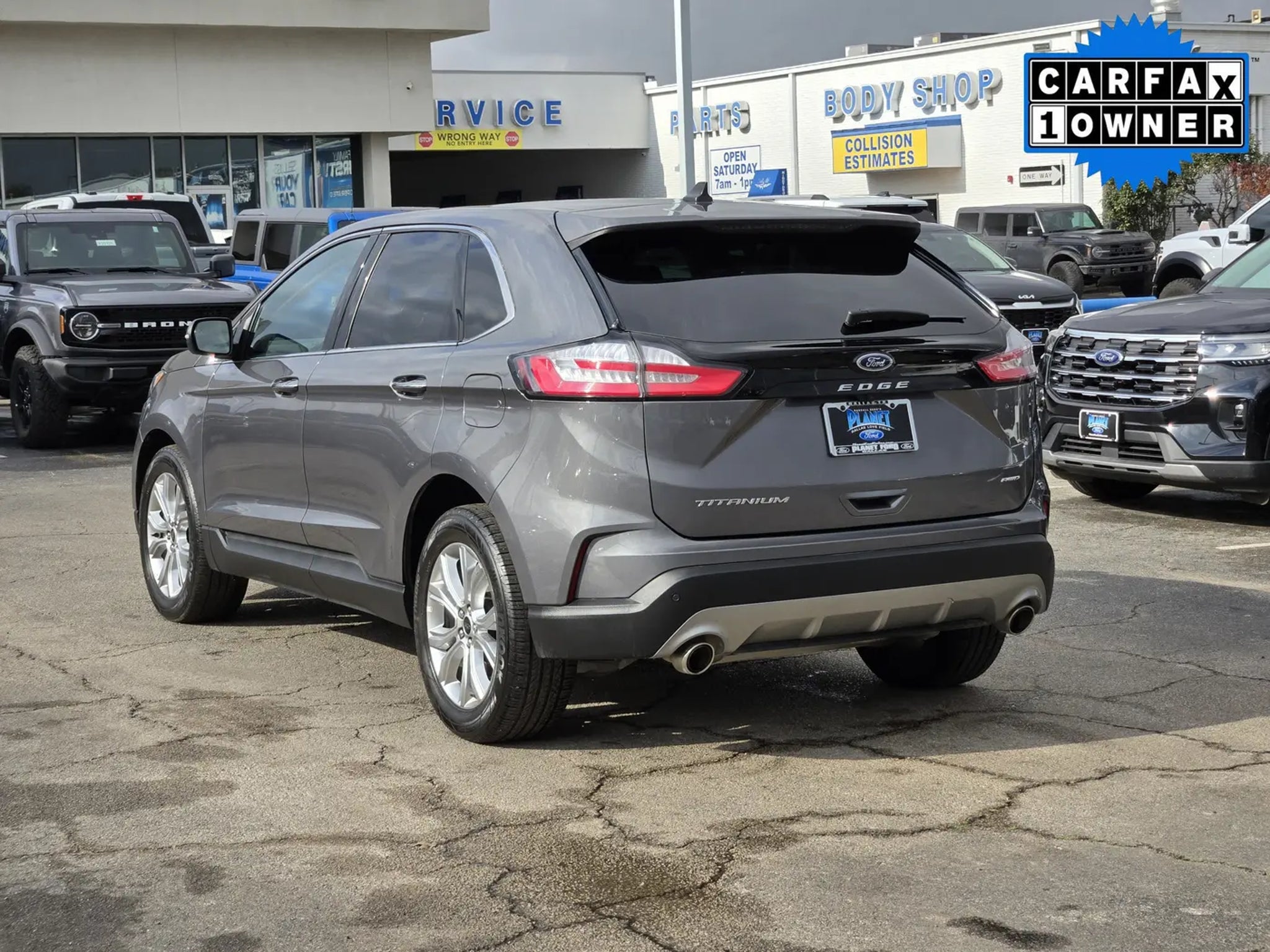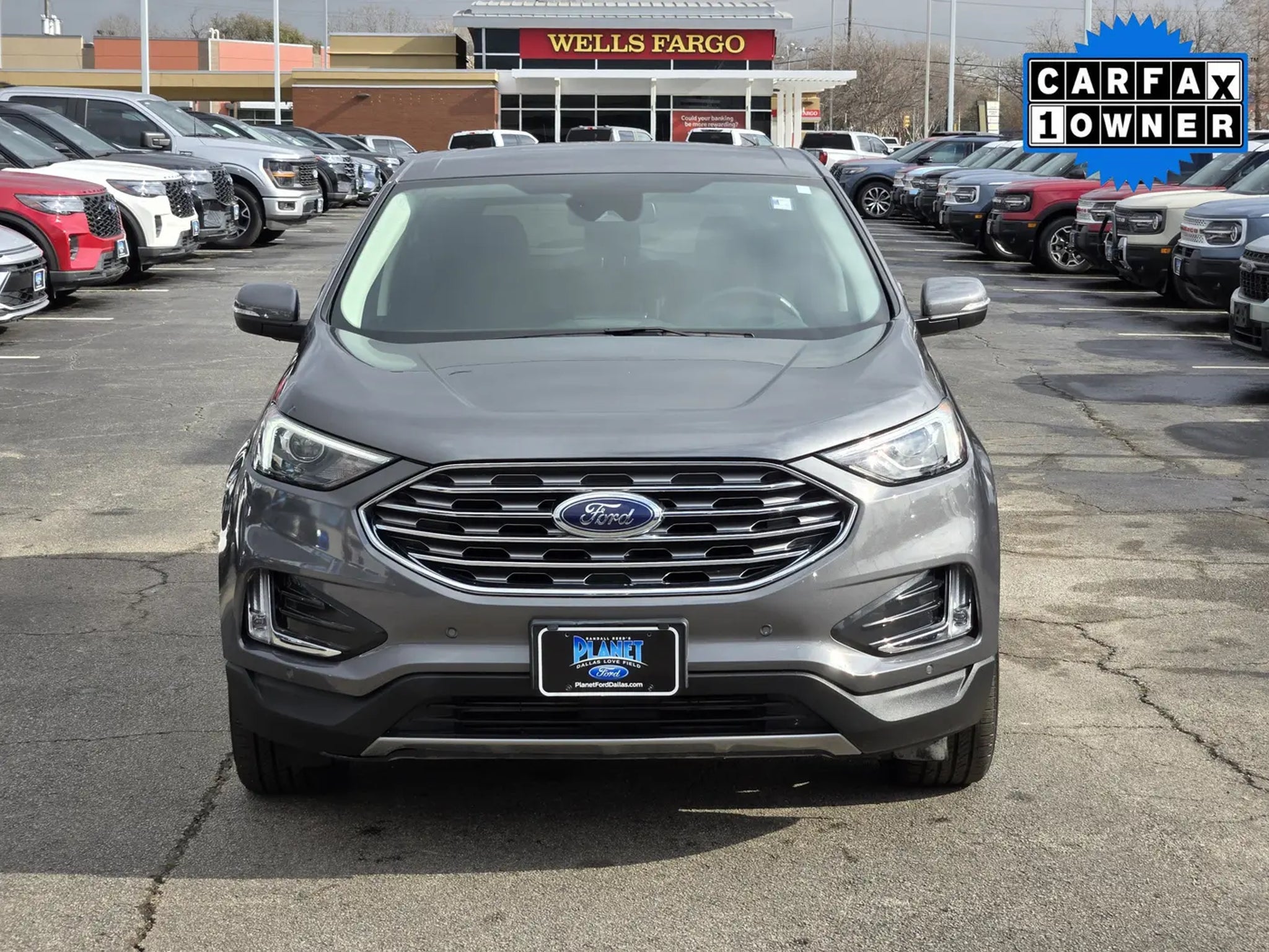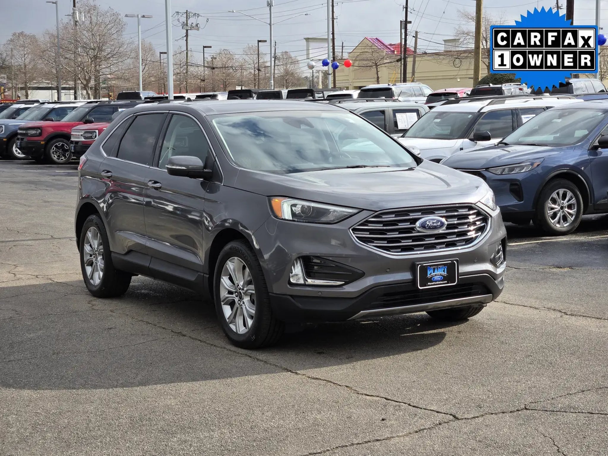 You'll love our One Owner 2024 Ford Edge Titanium AWD that shows off style and luxury in Carbonized Gray Metallic! Powered by a TurboCharged 2.0 Liter EcoBoost 4 Cylinder supplying 250hp to an 8 Speed Automatic transmission with a sophisticated rotary gear selector. Composed handling helps you keep comfortably on the move, and this All Wheel Drive SUV returns nearly 28mpg on the highway. Bold Edge design comes into the picture with LED signature lighting, fog lamps, a hands-free liftgate, bright-tipped integrated exhaust outlets, a chrome grille, a rear spoiler, and eye-catching 20-inch alloy wheels.Our Titanium cabin is impressive, featuring heated ActiveX power front sport seats, a heated leather steering wheel, dual-zone automatic climate control, remote start, keyless access, pushbutton ignition, and a handy 110V/150W power outlet. Leading Edge technologies include a 12-inch touchscreen, dual 4.2-inch driver displays, Android Auto®, Apple CarPlay®, WiFi compatibility, Bluetooth®, wireless charging, voice control, and a Bang & Olufsen surround-sound audio system.Rest assured that Ford surrounds you with safety by supplying automatic braking, blind-spot monitoring, a rearview camera, lane-keeping assistance, tire-pressure monitoring, rear cross-traffic alert, hill-start assistance, and more. Own our Edge Titanium, and cut through the crowd in style! Save this Page and Call for Availability. We Know You Will Enjoy Your Planet Ford Dallas Test Drive Towards Ownership!