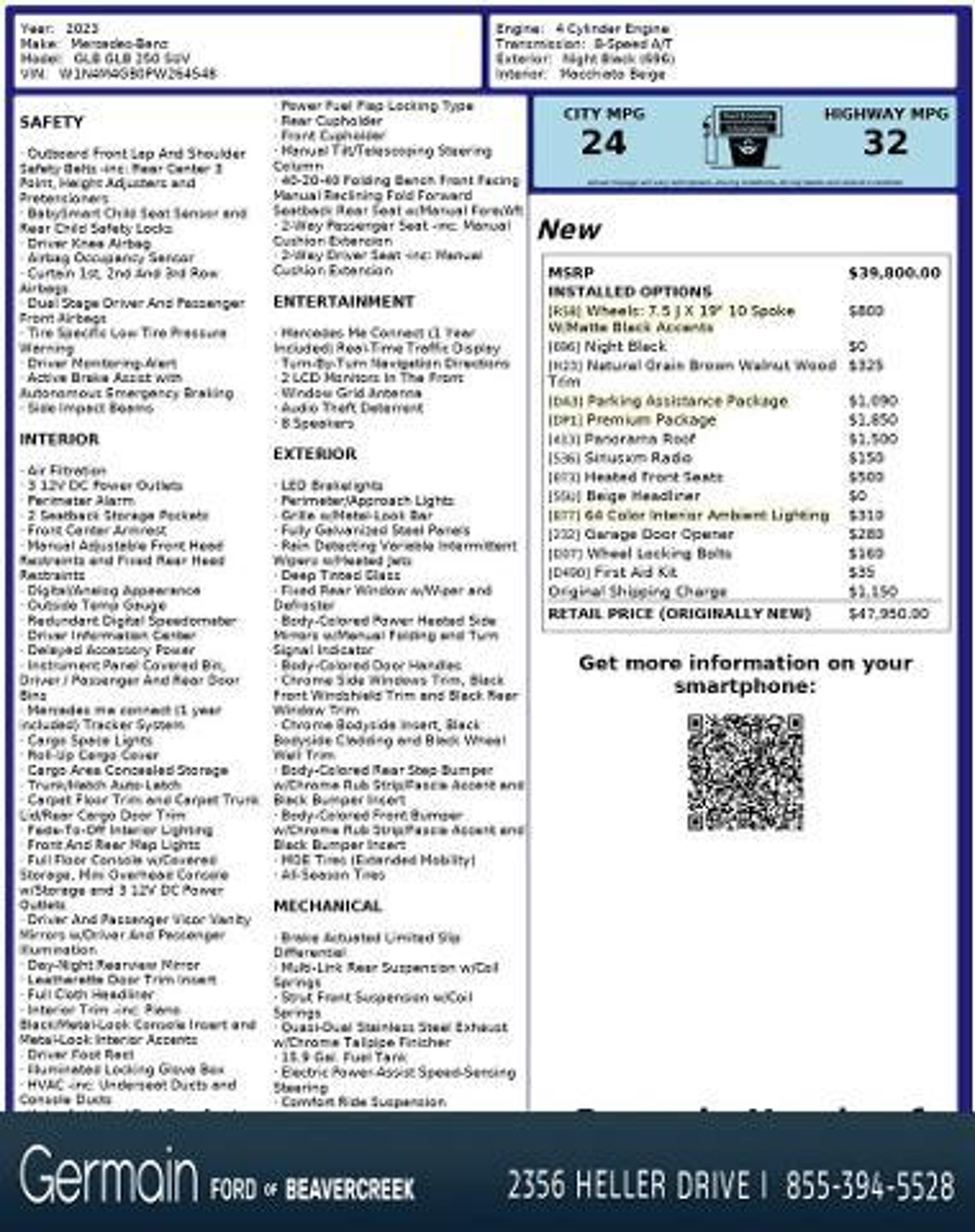 Details > 2023 Mercedes-Benz GLB GLB 250 4DR SUV For Sale in Dayton, OH Private Party Sellers Click here to place your ad now! You auta tell them you saw the ad in AutaBuy when you call or email. 1/30 2/30 3/30 4/30 5/30 6/30 7/30 8/30 9/30 10/30 11/30 12/30 13/30 14/30 15/30 16/30 17/30 18/30 19/30 20/30 21/30 22/30 23/30 24/30 25/30 26/30 27/30 28/30 29/30 30/30 View 30 Photos View All Add to My Garage Parked in Your Garage! Germain Ford of Beavercreek Contact Seller: I would like to: Make Offer Check Availability Ask A Question Request More Photos Check Financing Options Send a copy of this message to me Add this listing to my garage Send to Mobile Mileage 21,243 Exterior Color Midnight Black Interior Color Macchiato Beige Doors 4 Engine 2.0L I4 Transmission 8 Speed Auto Stock # TNF8251 VIN W1N4M4GB0PW264548 Estimated Monthly Payment $558 mo Apply Now J.J. Best Banc & Co. 2023 Mercedes-Benz GLB GLB 250 4DR SUV Description: New Price! CARFAX One-Owner. Clean CARFAX. Odometer is 15607 miles below market average! 24/32 City/Highway MPG The Right car, The Right price, The Right way. https://www.kbb.com/kbbreport/gl39d · Mileage: 21,243 · Color: Midnight Black Price: $32,226. Price: $32,057. Mileage 21,243 Exterior Color Midnight Black Interior Color Macchiato Beige Doors 4 Engine 2.0L I4 Transmission 8 Speed Auto Stock # TNF8251 VIN W1N4M4GB0PW264548 Estimated Monthly Payment $558 mo Apply Now J.J. Best Banc & Co. Add to My Garage Parked in Your Garage! Message Seller Germain Ford of Beavercreek Contact Seller: I would like to: Make Offer Check Availability Ask A Question Request More Photos Check Financing Options Send a copy of this message to me Add this listing to my garage Offered for sale by Germain Ford of Beavercreek DAYTON, OH Price: $32,226. Price: $32,057. Offered for sale by Germain Ford of Beavercreek DAYTON, OH [entire inventory] Ask Auta Intelligence How far is this from me? What engine options did these come with? How easy are parts to find for this model? What transmission options did these offer? Can you show me more luxury cars for a similar price? What colors did these come in? What safety features does this model offer? What trim levels were available for this model? What factory options were available on this model? Where is this located? When was this model first introduced? How many passengers can this seat comfortably? Tell me the history on this model What kind of mileage do these get? How many GLBs were produced in Black? How many of these were produced? What does this VIN number tell me? Do you have a similar car to sell? List It Now! Questions about this car? Ask Auta Intelligence for production numbers, available options, etc. · Subscribe to AutaBuy! · Send a Gift Subscription Notice to a Friend