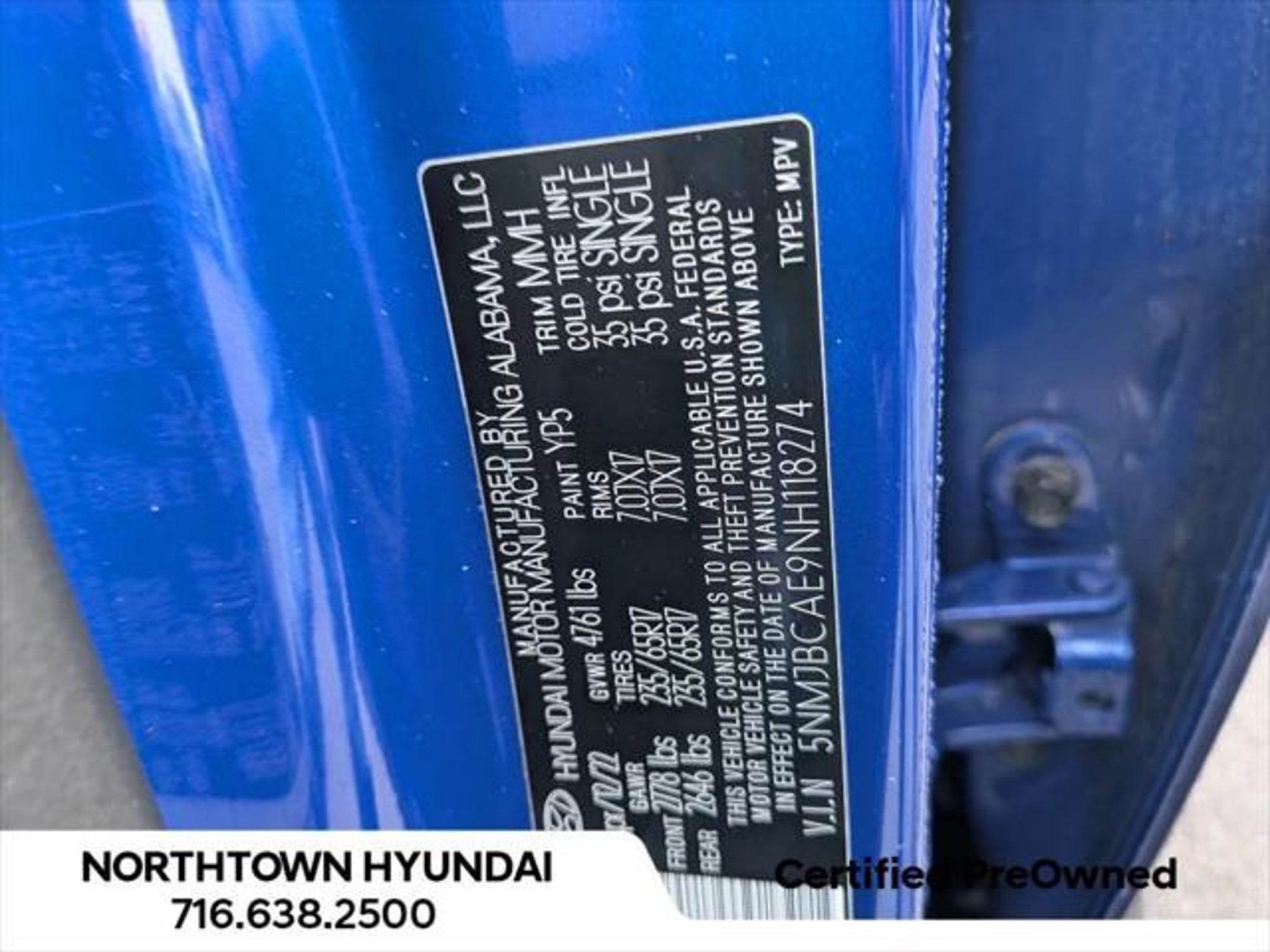 5NMJBCAE9NH118274 |