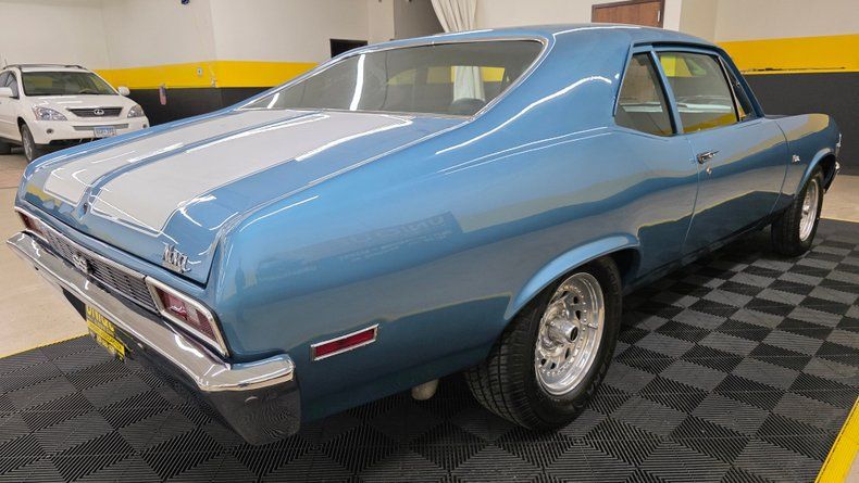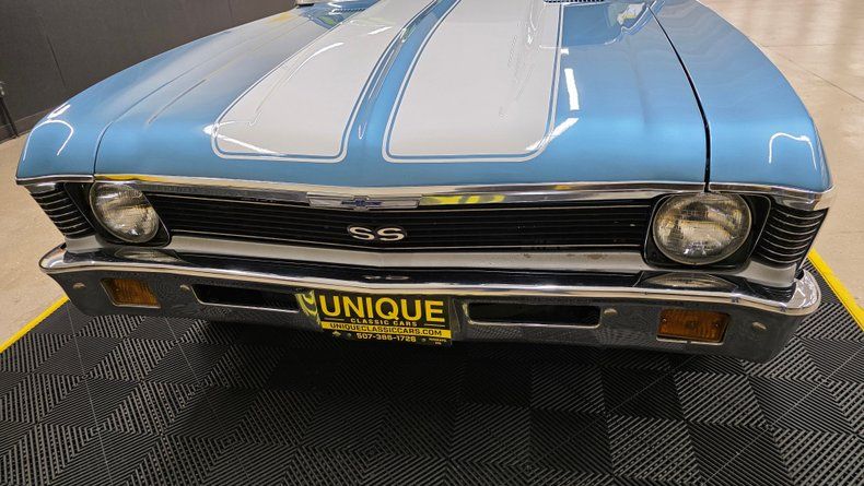 1972 Chevrolet Nova two-door sport coupe SS tribute. 350 V8 engine featuring aluminum heads, a Holley four-barrel carburetor, and paired to a Turbo Hydramatic 350 automatic transmission. Featuring an MSD coil, headers, and power brakes. It comes with a build sheet, owner's manual, along with a folder documenting ownership history from 1983 to 2004. Medium blue metallic with white stripes with a cowl induction hood, complemented by polished centerline wheels with radial tires. Black vinyl interior with bucket seats and a B&M shifter, aftermarket gauge cluster, and Pioneer stereo system. Oil pressure, fuel, amps and temp gauges reading. The tires, brakes, and alignment have recently been serviced. The speedometer is noted to read slightly fast, tachometer is not entirely accurate, and there is minor rear tire rubbing. Inside, the door panels and carpeting are in good shape, the car maintains a largely original look with factory-style bucket seats, the rear vinyl seat on the passenger side shows some cracking due to age. Nice throttle response and a mild cam sound. On the road, smooth acceleration, firm braking, and a fun to drive feel.