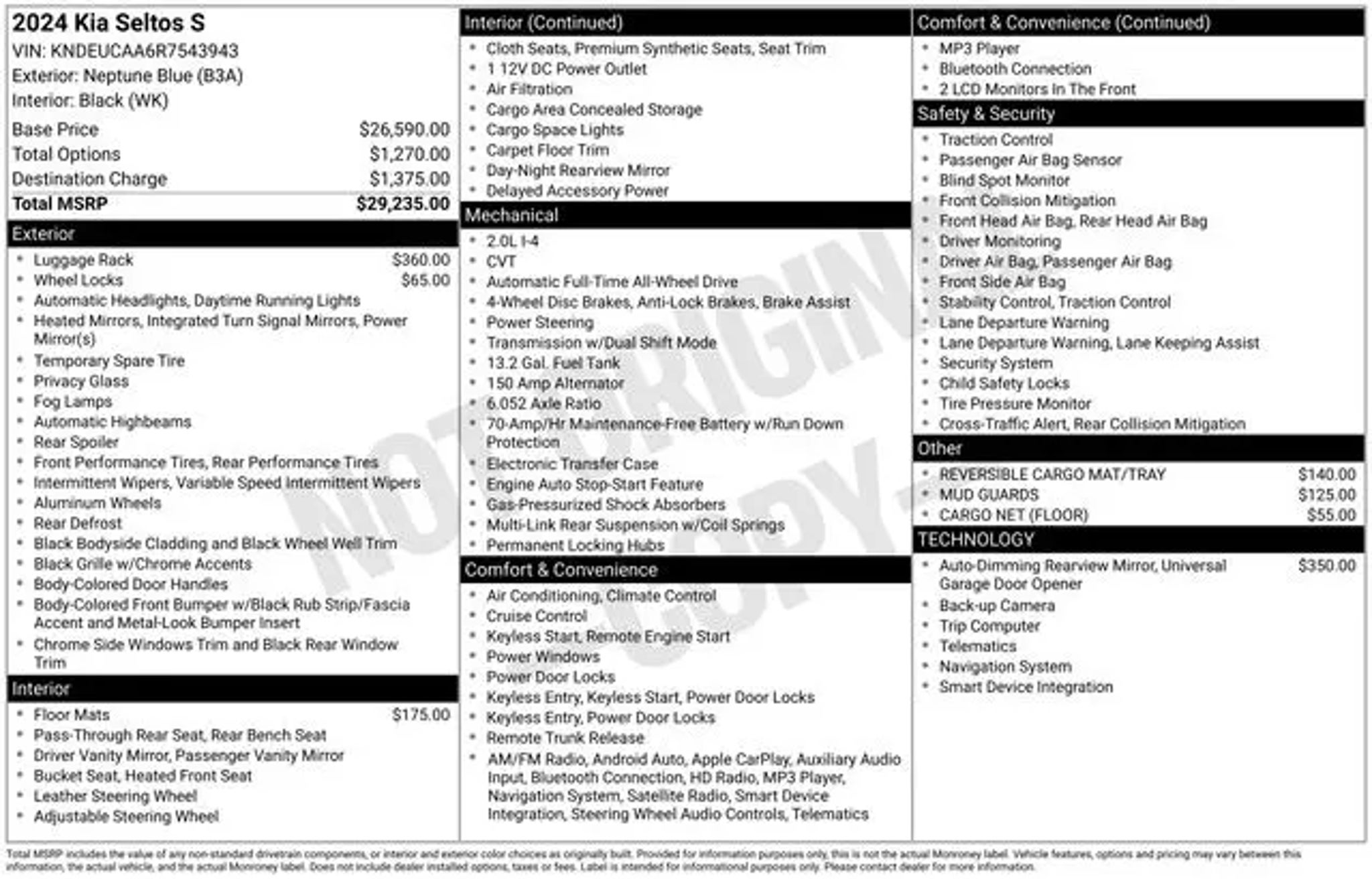 2024 Kia Seltos Neptune Blue AWD *CARFAX One-Owner *Apple CarPlay & Android Auto *Exterior Parking Camera Rear *Heated front seats *Leather Shift Knob *Leather steering wheel *Navigation System *Power door mirrors *Split folding rear seat *Spoiler *Turn signal indicator mirrors *Fuel Economy: 27/31 City/Highway MPG EXPERTISE YOU CAN TRUST! At Ken Ganley Kia Boardman, we offer more than just vehicles; we provide a comprehensive car-buying experience backed by a team of Kia-certified sales experts. Our staff is dedicated to guiding you through every step of the process, ensuring you make informed decisions with confidence. Our service team, comprised of ASE Certified and Kia Master technicians, guarantees that every vehicle is maintained to the highest standards, providing you with peace of mind long after your purchase. UNPARALLELED CUSTOMER CARE! Our commitment to exceptional customer service extends beyond the sale. From the moment you enter our dealership, you become part of the Ken Ganley Kia family. We offer convenient service options, including Saturday hours, evening pickups and drop-offs, service shuttles, and loaner vehicles, to accommodate your busy lifestyle. Our goal is to build lasting relationships and ensure your satisfaction at every turn. At Ken Ganley Kia Boardman, you're not just buying a car; you're gaining a partner in your automotive journey.