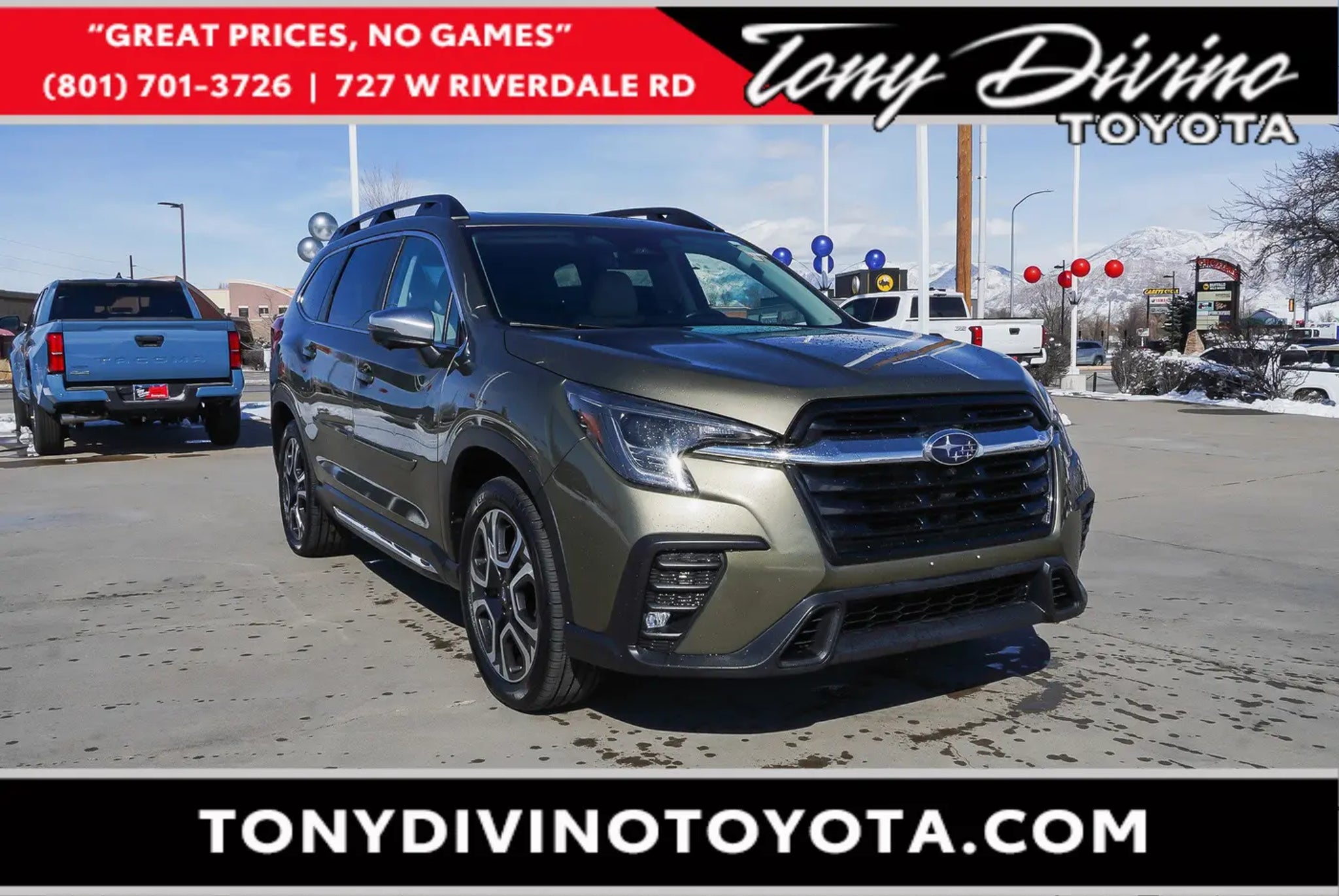 Only 35,552 Miles! Scores 25 Highway MPG and 19 City MPG! This Subaru Ascent delivers a Intercooled Turbo Regular Unleaded H-4 2.4 L/146 engine powering this Variable transmission. WARM IVORY, PERFORATED LEATHER-TRIMMED UPHOLSTERY -inc: silver or ivory stitching, TECHNOLOGY PACKAGE -inc: Retractable Cargo Area Cover, Satin Chrome Power-Folding Exterior Power Mirrors, integrated turn signals, Panoramic Power Moonroof w/UV/Drk Tint Dual Glass, front tilt up and external retracting w/auto-open/close, power sunshade and rear fixed glass, Cabin Connect, Enables communication from the front seats throughout the cabin without the need to speak loudly, Once the button on the Center Information Display (CID) is pressed, voices from the driver and front passenger are picked up by the overhead console microphone and outputted through the rear audio speakers, This feature combined w/the cabin view mirror, enables eye contact and provides a conversation to occur w/the rear seat passengers, helping to reduce distractions on the driver, Surround View Monitor System, Images from the 4 vehicle cameras are combined to create a single image that allows the area around the entire vehicle to be observed, Images from the front-vision camera, exterior power mirrors, AUTUMN GREEN METALLIC. This Subaru Ascent Comes Equipped with These Options Window Grid Antenna, Wheels: 20 x 7.5 J Dk Gray Alloy w/Machine Finish -inc: wheel center cap w/Subaru 6 star logo, Voice Activated Dual Zone Front Automatic Air Conditioning, Variable Intermittent Wipers w/Heated Wiper Park, Valet Function, Trunk/Hatch Auto-Latch, Trip Computer, Transmission: Lineartronic CVT -inc: high torque, steering wheel paddle-shift control switches, 8-speed manual shift mode and X-MODE dual-mode system w/Hill Descent Control (HDC), Transmission w/Driver Selectable Mode and Oil Cooler, Trailer Wiring Harness. Stop By Today Come in for a quick visit at Tony Divino Toyota|777 West Riverdale Rd, Riverdale, UT 84405 to claim your Subaru Ascent! * Estimated Monthly Payment will depend on vehicle make and model and will be determined upon actual vehicle inspection. All payments are estimates. Tax, title, registration and documentation fee ($349) are extra.* While every reasonable effort is made to ensure the accuracy of this information, we are not responsible for any errors or omissions contained on these pages. Please verify any information in question with Tony Divino Toyota.