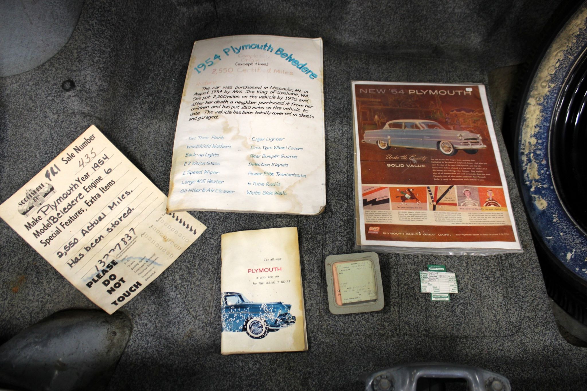 Car was purchased new in Missoula MT by Mrs. Joe King of Spokane WA. She put 2200 miles on the car until she passed away in 1970 and the car was purchased by her neighbor who added only 250 miles. The car was only taken out to shows in nice weather and stored inside under sheets the rest of the time. In the 1980’s the car was sold in Scottsdale, AZ at auction and ended up in a small town south of Council Bluffs, IA. Over the last 40 years the car has only been driven around 1500 miles and currently sits at 4012 miles!