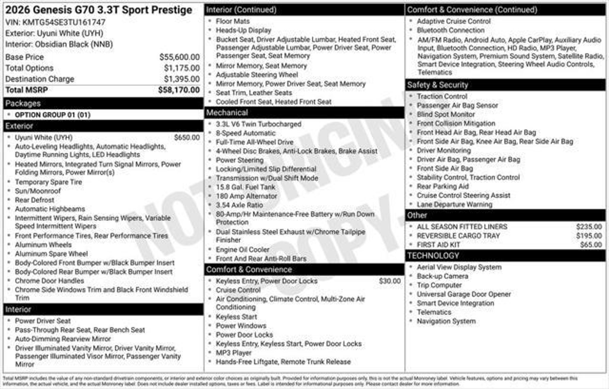Odometer is 2559 miles below market average! Clean CARFAX. ** OIL CHANGES FOR LIFE!! With purchase or lease of your New, Pre-Owned or Certified Pre-Owned Mazda purchased or leased from Wayne Mazda; to be done with dealer recommended services, must be done at Wayne Mazda Service Center only. Not available on prior sales; not available on Diesels, SVTs, Performance or Commercial vehicles. ** Uyuni White 2026 Genesis G70 3.3T Sport Prestige AWD 8-Speed Automatic 3.3L V6 DGI DOHC 24V Don't wait until it is too late! Call today to schedule an appointment. REST ASSURED every vehicle at Wayne Mazda has been hand selected by our Owner & Management. Each vehicle is put through a multi-point inspection by our factory certified technicians. After your future vehicle leaves our certified shop, it is fully detailed in our centralized recon shop and delivered just like new. With the Performance Auto Group - You CAN buy with confidence! We would love the opportunity to earn your business "“ ASK US ABOUT OUR OIL CHANGES FOR LIFE! *All prices includes all costs to be paid by a consumer, except for licensing costs, registration fees and taxes. Vehicles are subject to prior sale. Price quotes subject to change based on current incentives on day of sale.