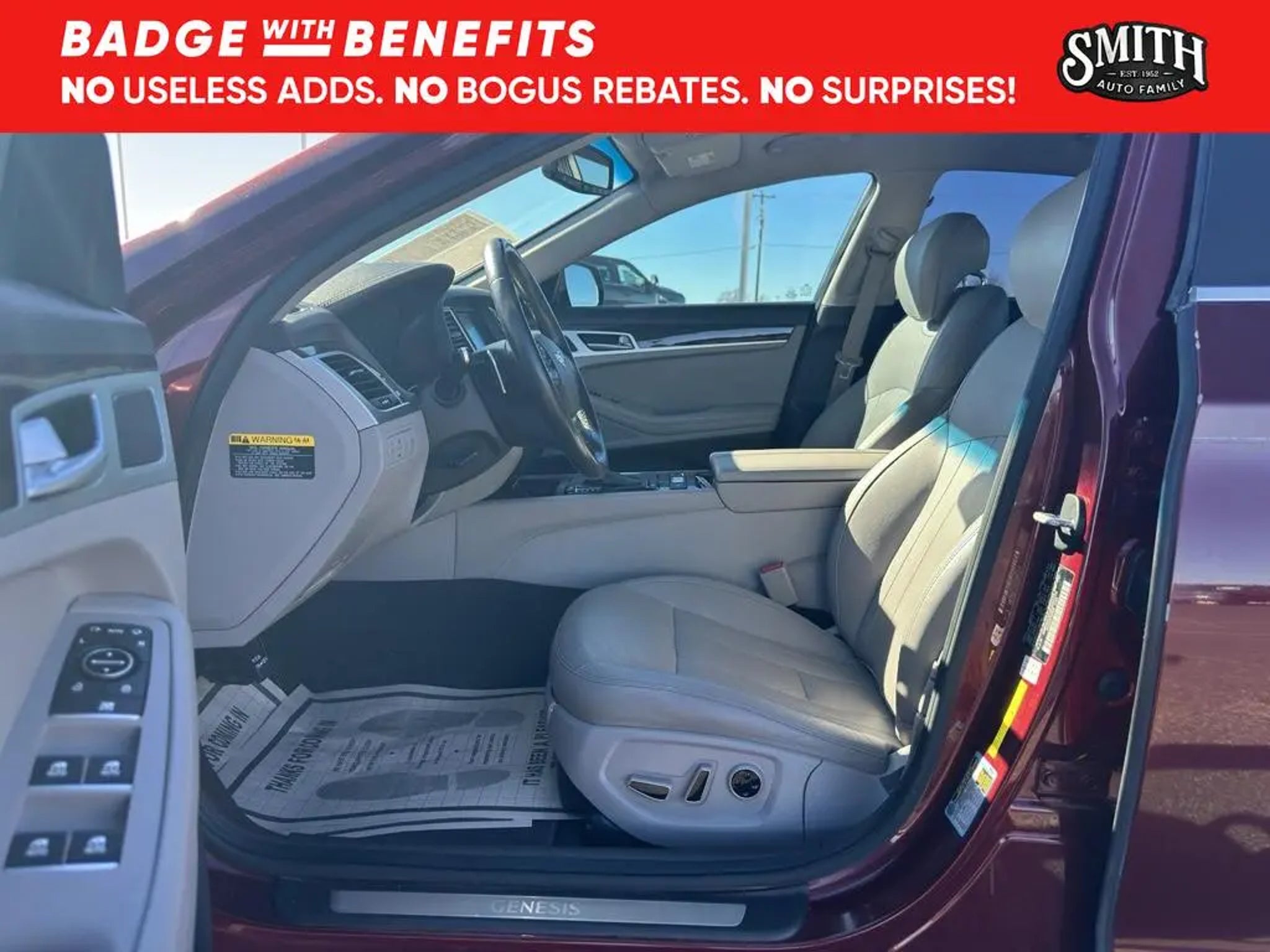 Vehicle Details 2015 Hyundai Genesis 3.8L V6 "” RWD luxury sedan located in Plainview, TX, offering the best price in the area. This well-maintained Hyundai Genesis pairs a smooth 3.8L V6 gasoline engine with rear-wheel drive and a refined automatic transmission for confident highway cruising and composed city driving. Premium features elevate daily comfort: automatic climate control maintains ideal cabin temperatures, heated steering wheel adds winter convenience, and leather-appointed seating ensures a luxury feel. Stay connected and on course with the factory navigation system, while the back-up camera enhances safety and parking confidence. Enjoy premium audio options including XM Radio for endless entertainment on long drives. Advanced engineering and a solid service history make this Hyundai Genesis a compelling choice for buyers seeking performance, comfort, and value. This Hyundai Genesis delivers an engaging driving experience without sacrificing practicality"”ample trunk space and thoughtfully designed interior controls make every journey comfortable. Safety and convenience features are designed to protect occupants and simplify driving tasks. Located in Plainview, TX, this vehicle is competitively priced to sell quickly; we're offering the best price compared to similar local listings, providing exceptional value for a luxury sedan with a V6 powerplant. Schedule a test drive today to experience the smooth ride, responsive V6 performance, and premium amenities firsthand. Competitive pricing combined with desirable features makes this 2015 Hyundai Genesis an outstanding buy. Equipment You'll never again be lost in a crowded city or a country region with the navigation system on this large car. with XM/Sirus Satellite Radio you are no longer restricted by poor quality local radio stations while driving this Hyundai Genesis. Anywhere on the planet, you will have hundreds of digital stations to choose from. This vehicle features a hands-free Bluetooth phone system. This unit offers Automatic Climate Control for personalized comfort. The leather seats in this large car are a must for buyers looking for comfort, durability, and style. It is pure luxury with a heated steering wheel. Protect the Hyundai Genesis from unwanted accidents with a cutting edge backup camera system. This Hyundai Genesis excites both driver and bystanders with a polished red exterior with racy lines. The Hyundai Genesis is rear wheel drive. Set the temperature exactly where you are most comfortable in the vehicle. The fan speed and temperature will automatically adjust to maintain your preferred zone climate. Packages Option Group 01. All Weather Floor Mats. Reversible Cargo Tray. Mud Guards. Rear Bumper Applique. Wheel Locks. First Aid Kit. **Equipment listed is based on original vehicle build and subject to change. Please confirm the accuracy of the included equipment by calling the dealer prior to purchase.**