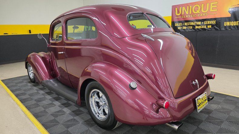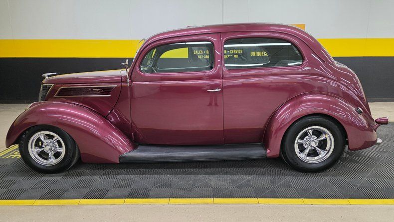 Classic 1937 Ford two-door sedan street rod with all-steel body and modern performance upgrades. Powered by a reliable 350 small block V8 engine and Turbo Hydramatic 350 automatic transmission. Unique medium plum metallic paint with chrome American Racing torque thrust wheels and powder-coated grille. Upgraded Mustang II front suspension and Ford 8-inch rear end from a Granada for improved handling. Great condition interior featuring quality cloth upholstery, Dolphin gauges, and an original-style radio. Power steering, cruise control, Mustang II front suspension, HEI ignition, 8-inch rear end, new battery, Edelbrock parts