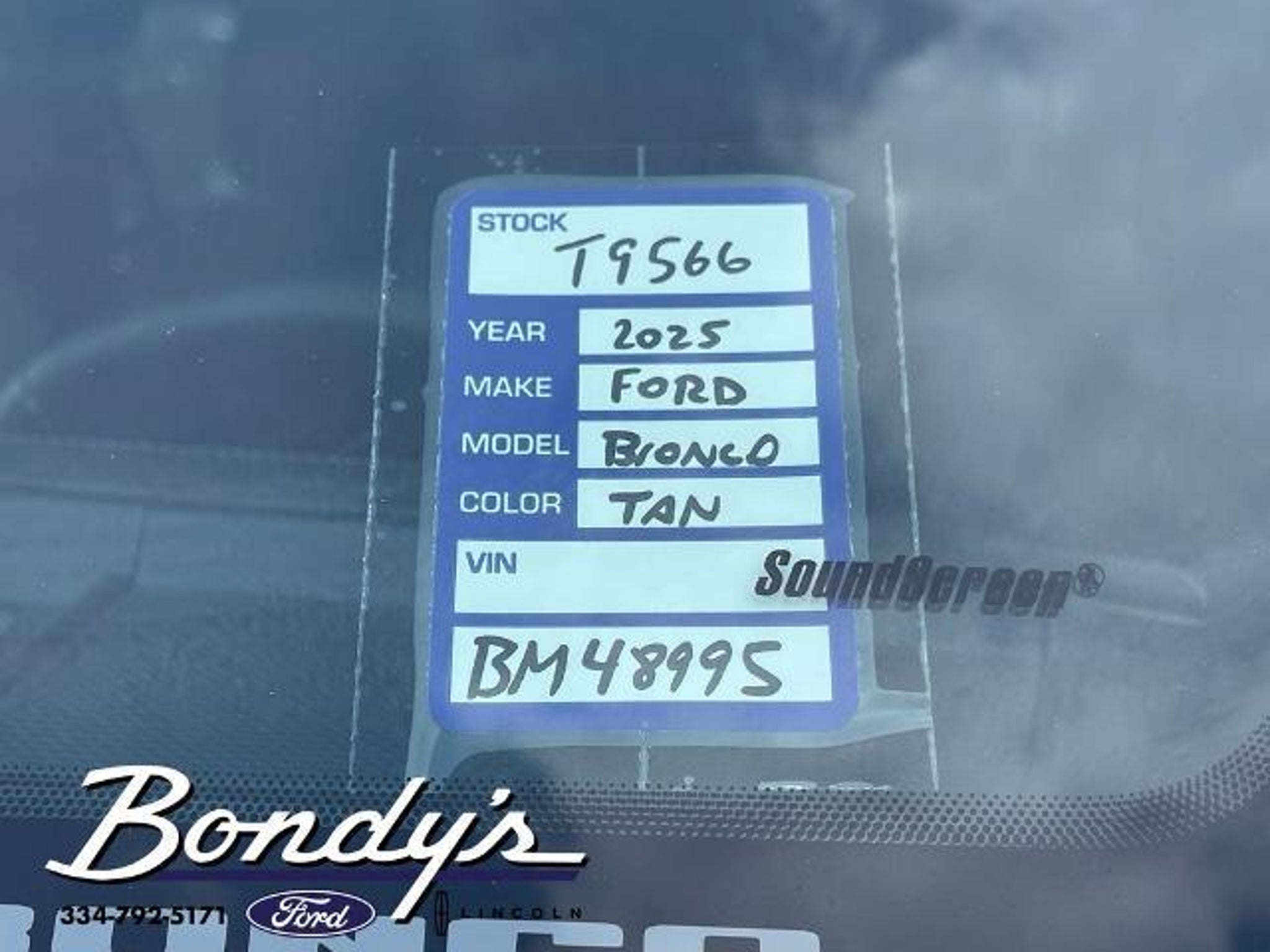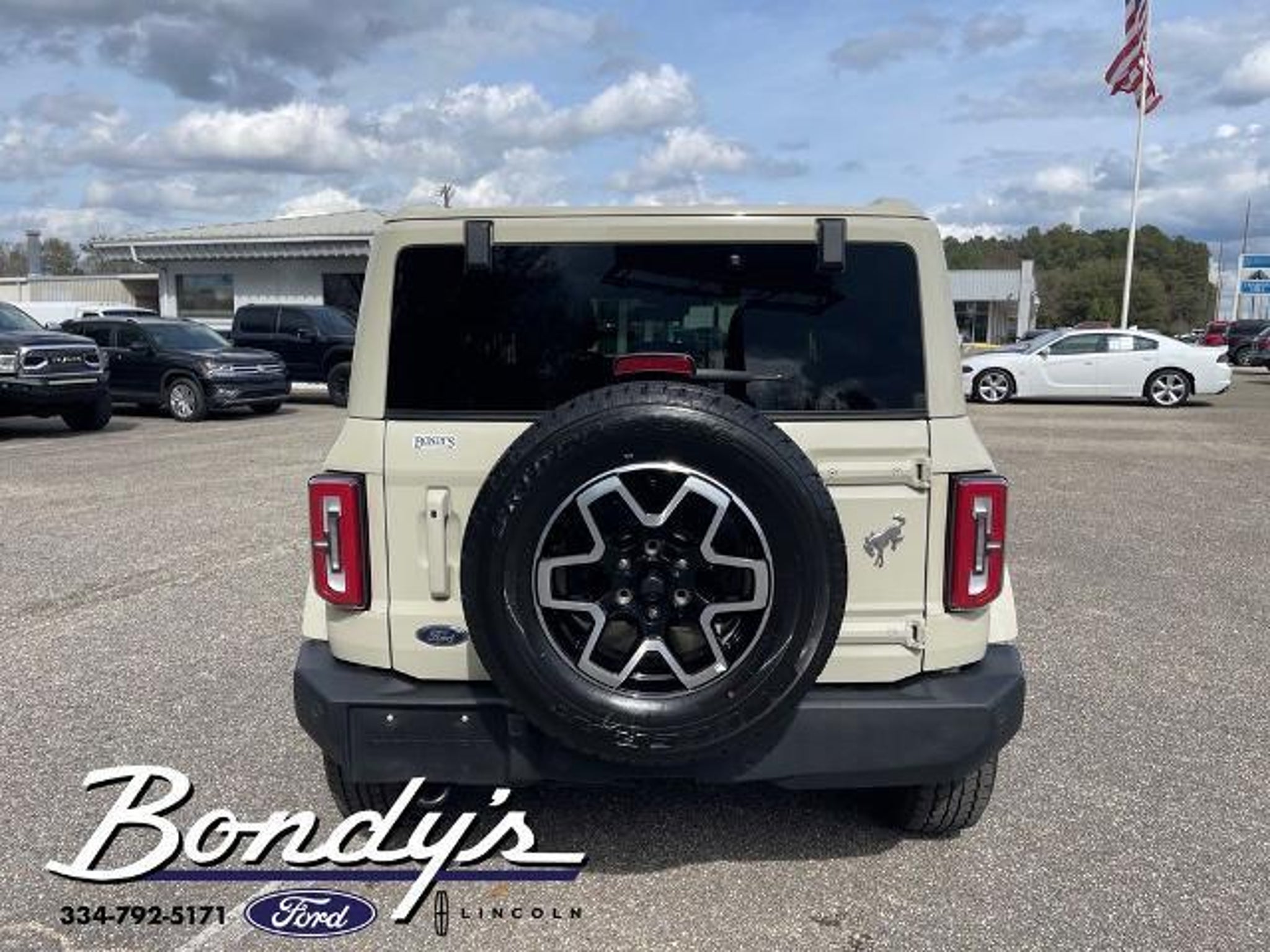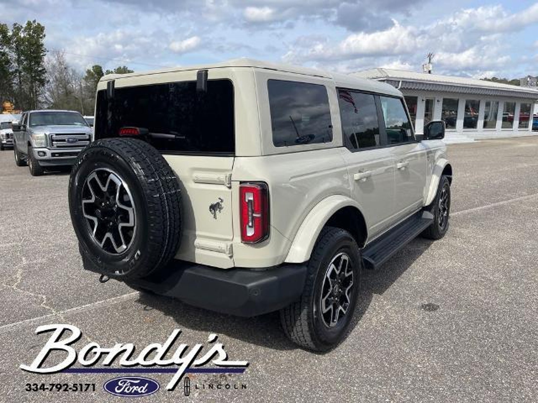 CARFAX One-Owner. Clean CARFAX. 2025 Ford Bronco Outer Banks 18 Bright Machined Aluminum Wheels, 3.73 Axle Ratio, 4-Wheel Disc Brakes, 7 Speakers, ABS brakes, Air Conditioning, Alloy wheels, AM/FM radio: SiriusXM with 360L, AM/FM Stereo, Auto High-beam Headlights, Auto-dimming Rear-View mirror, Automatic temperature control, Brake assist, Compass, Connected Navigation, Delay-off headlights, Driver door bin, Driver vanity mirror, Dual front impact airbags, Dual front side impact airbags, Electronic Stability Control, Emergency communication system: 911 Assist, Equipment Group 312A Mid Package, Exterior Parking Camera Rear, Front anti-roll bar, Front Bucket Seats, Front Center Armrest, Front dual zone A/C, Front fog lights, Front License Plate Bracket, Front reading lights, Front wheel independent suspension, Fully automatic headlights, Hard Top Sound Deadening Headliner, Heated door mirrors, Heated front seats, Heated Leather-Trimmed/Vinyl Bucket Seats, Heated steering wheel, Illuminated entry, Integrated roll-over protection, Internet access capable: FordPass Connect, Leather Shift Knob, Low tire pressure warning, Navigation system: Connected Navigation, Occupant sensing airbag, Outside temperature display, Overhead airbag, Overhead console, Painted Hard Top, Panic alarm, Passenger door bin, Passenger vanity mirror, Power door mirrors, Power driver seat, Power passenger seat, Power steering, Power windows, Radio data system, Rear seat center armrest, Rear-Window Defroster & Washer, Remote keyless entry, Security system, SiriusXM w/360L, Speed control, Split folding rear seat, Steering wheel mounted audio controls, SYNC 4, Tachometer, Telescoping steering wheel, Tilt steering wheel, Traction control, Trip computer, Variably intermittent wipers, Voltmeter. Desert Sand 4WD 2.3L EcoBoost I-4 10-Speed Automatic THIS VEHICLE IS LOCATED AT BONDY'S FORD LINCOLN AT 3615 ROSS CLARK CIRCLE DOTHAN, AL 36303. PLEASE CALL US AT 800-239-5171 TO ASK US ANY QUESTIONS! MON-FRI SALES IS HERE FROM 8:30 TO 7:00 AND SAT 8:30 TO 6:00. WE ARE CLOSED ON SUNDAYS. Call Toll Free 800-239-5171 or 334-792-5171.