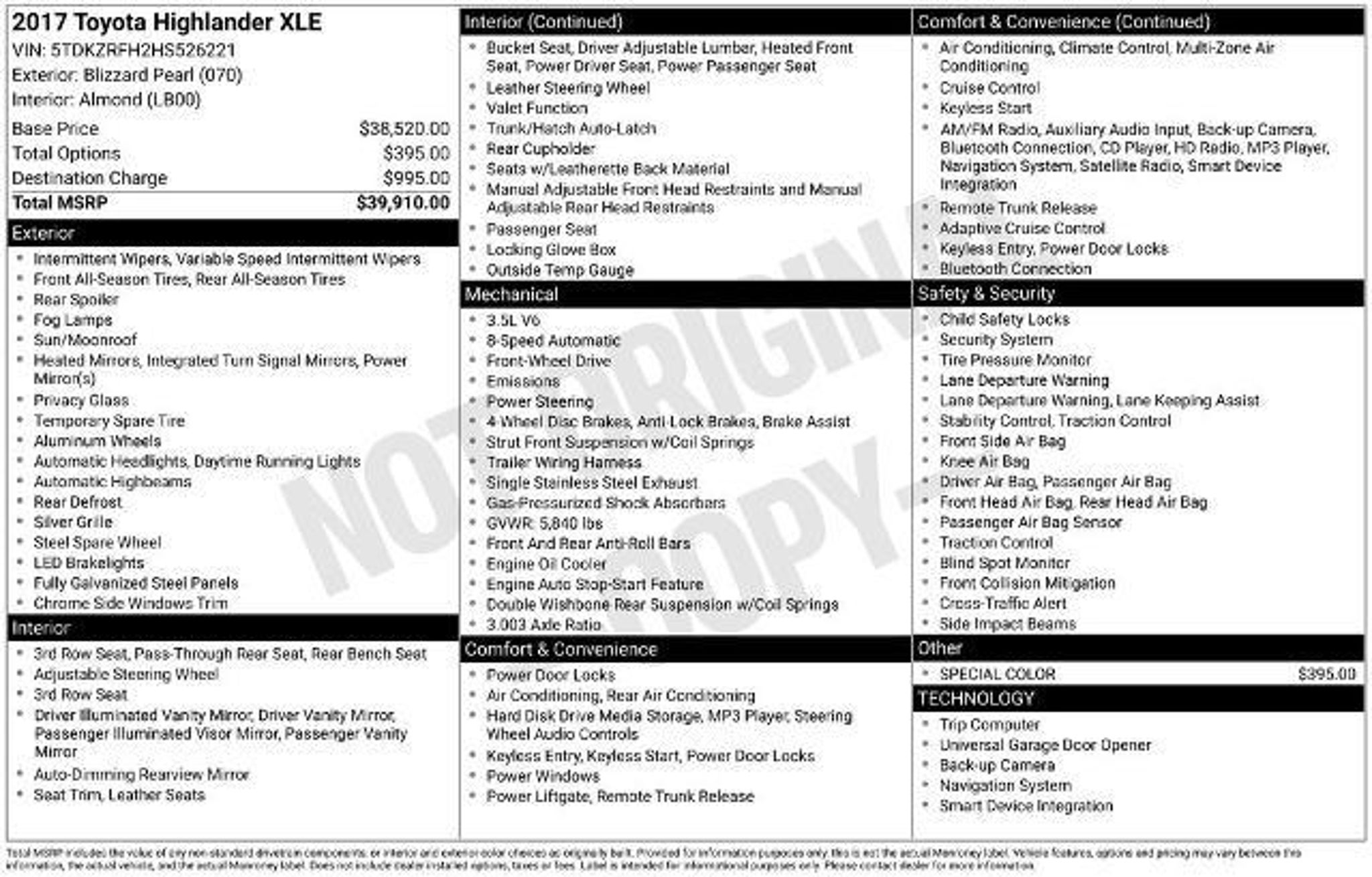 Discover the perfect blend of style, comfort, and performance in this 2017 Toyota Highlander XLE. This exceptional SUV boasts a sleek white exterior and a well-appointed interior that combines luxury and functionality, making it the ideal choice for the discerning driver. - Perfect No-Accident CarFax Garage Kept! - Special Color Packed with a host of premium features, this Highlander XLE is designed to elevate your driving experience. Enjoy the convenience of the Navigation System, the premium Entune audio system, and the power moonroof. Stay comfortable with the dual-zone climate control, heated front seats, and the power driver's seat. Enhance your driving confidence with the Active Cruise Control and the Exterior Parking Camera Rear. The 3.5L V6 engine, paired with the 8-speed automatic transmission, delivers a smooth and responsive performance, while the Front-Wheel Drive configuration ensures a confident and efficient ride. With an impressive 21 MPG in the city and 27 MPG on the highway, this Highlander XLE strikes the perfect balance between power and fuel efficiency. Discover the versatility of this SUV, with its spacious interior and split-folding third-row seats. Whether you're transporting your family, hauling cargo, or embarking on a road trip, the Highlander XLE has the capability to handle it all with ease. Elevate your driving experience with this meticulously maintained 2017 Toyota Highlander XLE. Backed by a clean CarFax report and a history of exceptional care, this SUV is ready to provide you with years of reliable and enjoyable driving. Visit our showroom today and experience the difference for yourself. The listed online price reflects a $1,000 finance incentive and a $1,000 qualifying retail trade-in incentive; absence of either or both incentives will result in an increase of up to $2,000 to the final sale price.