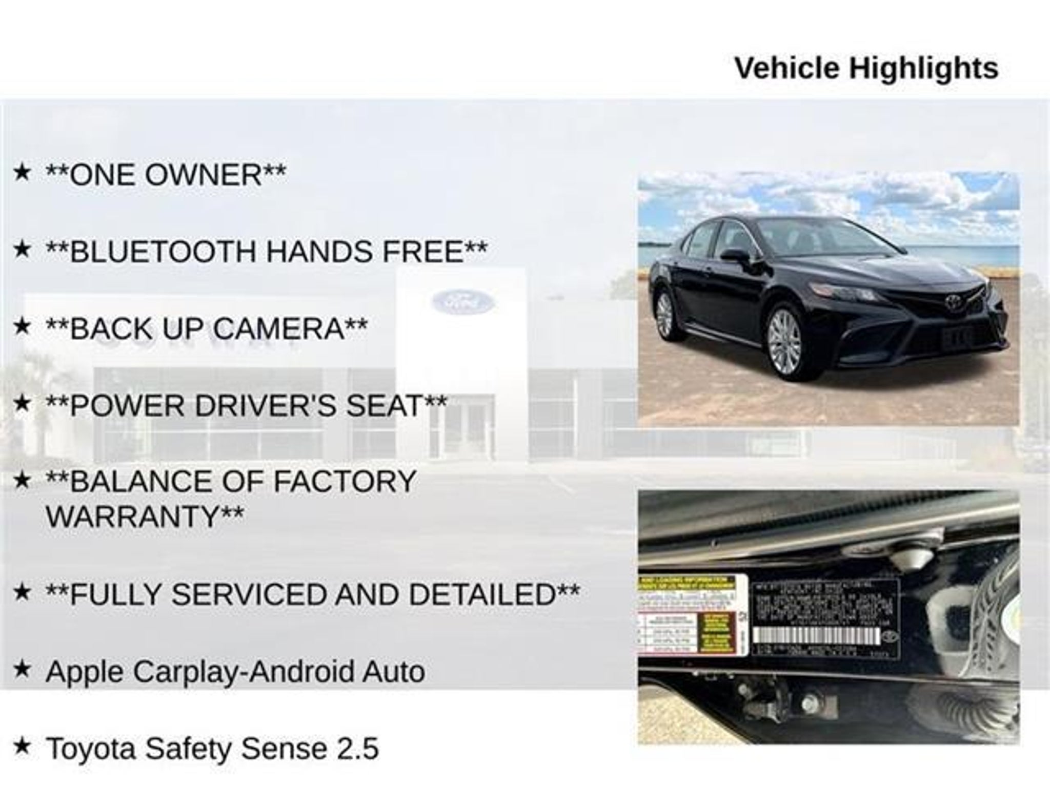 Discover the perfect blend of style, performance, and technology in this exceptional 2023 Toyota Camry SE. Boasting a sleek black exterior and a host of premium features, this one-owner Camry is the ideal choice for the discerning driver. - **ONE OWNER** - **BLUETOOTH HANDS FREE** - **BACK UP CAMERA** - **POWER DRIVER'S SEAT** - **BALANCE OF FACTORY WARRANTY** - **FULLY SERVICED AND DETAILED** - Apple CarPlay-Android Auto - Toyota Safety Sense 2.5 - Dynamic Radar Cruise Control - Star Safety System - Lane Tracing Assist - XM Satellite Radio Powered by a robust 2.5L I4 DOHC 16V engine mated to an 8-speed automatic transmission, this Camry delivers an impressive fuel economy of 28 mpg in the city and 39 mpg on the highway, making it an exceptional choice for your daily commute or weekend getaways. Step inside the well-appointed cabin and experience the perfect blend of comfort and technology. The Camry SE boasts a wealth of premium features, including dual-zone automatic climate control, a power driver's seat, and a premium audio system with Apple CarPlay and Android Auto integration. Safety is also a top priority, with advanced driver-assist technologies like Adaptive Cruise Control, Automatic High Beams, and a Rear-View Camera ensuring a secure and confident driving experience. This Camry SE also comes with the balance of the factory warranty, giving you the peace of mind that comes with owning a well-maintained, high-quality vehicle. Our team of certified technicians have thoroughly inspected and serviced this Camry, ensuring it is ready to provide you with years of reliable and enjoyable driving. Don't miss your opportunity to experience the exceptional value and performance of this 2023 Toyota Camry SE. Visit our showroom today and let us demonstrate how this remarkable vehicle can enhance your driving experience. We're confident that once you take it for a test drive, you'll be convinced that this Camry is the perfect fit for your lifestyle.