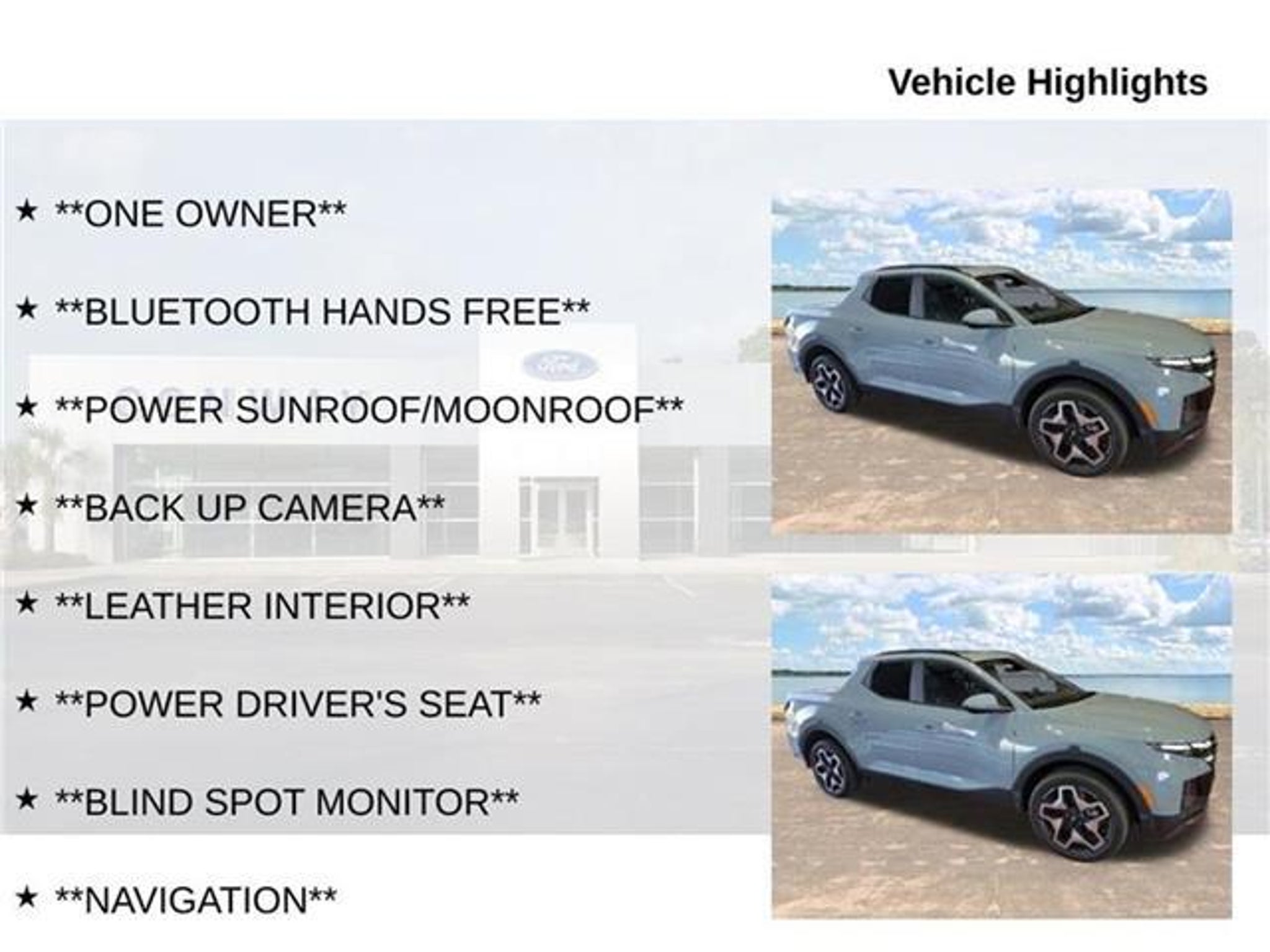 Discover the perfect blend of style, capability, and technology in the 2024 Hyundai Santa Cruz Limited. This exceptional SUV-truck hybrid is a true standout, offering a unique and versatile design that seamlessly combines the best of both worlds. - **ONE OWNER** - **BLUETOOTH HANDS FREE** - **POWER SUNROOF/MOONROOF** - **BACK UP CAMERA** - **LEATHER INTERIOR** - **POWER DRIVER'S SEAT** - **BLIND SPOT MONITOR** - **NAVIGATION** - **BALANCE OF FACTORY WARRANTY** - **FULLY SERVICED AND DETAILED** - Apple Carplay-Android Auto - Remote Start - Self-leveling Rear Suspension - Bose Sound System - Heated and Cooled Front Seats - Heated Steering Wheel - Smart Cruise Control - Lane Keeping and Lane Following Assist With its bold, distinctive styling and impressive capabilities, the Santa Cruz Limited is the perfect companion for your active lifestyle. Powered by a 2.5L I4 Shiftronic AWD engine, this vehicle delivers a remarkable blend of performance and efficiency, boasting an EPA-estimated 19 MPG in the city and 27 MPG on the highway. Step inside the Santa Cruz Limited and discover a world of premium features and advanced technology. The leather-trimmed interior, heated and ventilated front seats, and heated steering wheel provide unparalleled comfort, while the Bose premium audio system and seamless integration of Apple CarPlay and Android Auto keep you connected and entertained. Safety is a top priority in the Santa Cruz Limited, with features like the Blind Spot Monitor, Lane Keeping and Lane Following Assist, and Adaptive Cruise Control ensuring you can navigate the roads with confidence. The rear-view camera and self-leveling suspension further enhance your driving experience, making this vehicle a true standout in its class. With the balance of the factory warranty still in effect, you can purchase this 2024 Hyundai Santa Cruz Limited with peace of mind, knowing that your investment is protected. Our team of dedicated professionals has meticulously serviced and detailed this vehicle, ensuring it is in pristine condition and ready to take you on your next adventure. Don't miss your opportunity to experience the unmatched versatility and sophistication of the 2024 Hyundai Santa Cruz Limited. Visit our showroom today and let us demonstrate how this remarkable vehicle can enhance your driving experience.