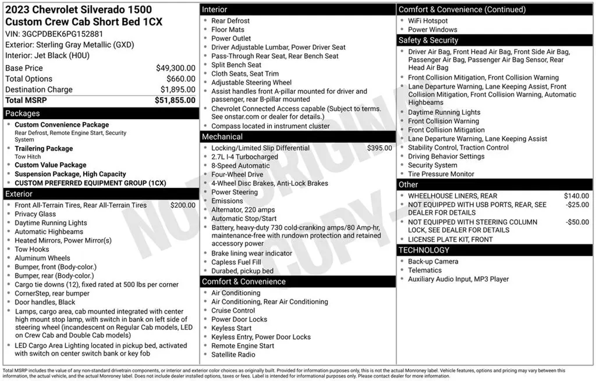 Discover the perfect blend of capability, comfort, and convenience in the 2023 Chevrolet Silverado 1500 Custom. This remarkable truck is poised to exceed your expectations and elevate your driving experience. Tailored to meet your needs, the Silverado 1500 Custom boasts an impressive array of features: - Auto-Locking Rear Differential - Tires, 275/60R20SL All-Terrain, Blackwall - Wheelhouse Liners, Rear Elevate your driving experience with the Custom Convenience Package, Custom Value Package, High Capacity Suspension Package, Preferred Equipment Group 1CX, and Trailering Package, all designed to enhance your comfort and convenience. Indulge in the premium audio system with SiriusXM Radio, Bluetooth® connectivity, and wireless phone projection, ensuring seamless connectivity on the road. Stay comfortable with features like air conditioning, power windows, and remote keyless entry, while the rear window defroster and 120-volt power outlets provide added convenience. Safety is paramount, and the Silverado 1500 Custom delivers with advanced features like ABS brakes, dual front impact airbags, electronic stability control, and a rear vision camera. The Automatic Emergency Braking, Forward Collision Alert, and Lane Keep Assist with Lane Departure Warning provide an extra layer of protection. Underneath the hood, the powerful 2.7L Turbo engine paired with an 8-speed automatic transmission and 4WD delivers impressive performance, with an EPA-estimated 18 city/21 highway MPG. This truck is ready to tackle any adventure, whether it's hauling heavy loads or traversing rugged terrain. Experience the perfect blend of capability, comfort, and technology in the 2023 Chevrolet Silverado 1500 Custom. Visit our showroom today and let us demonstrate why this exceptional truck should be your next automotive companion. All prices plus tax, tag, and fees. New prices cannot be combined with special interest rates. Must finance through manufacturer's or dealer's preferred lender for certain rebates and some offers may not be combined. See Dealer for details. Important recall information: so you know, any used vehicle you may be considering may have unrepaired manufacturer's safety recalls. To check the recall status repaired or unrepaired of the specific used vehicle you're interested in purchasing visit www.safercar.gov. Thanks for shopping with us.