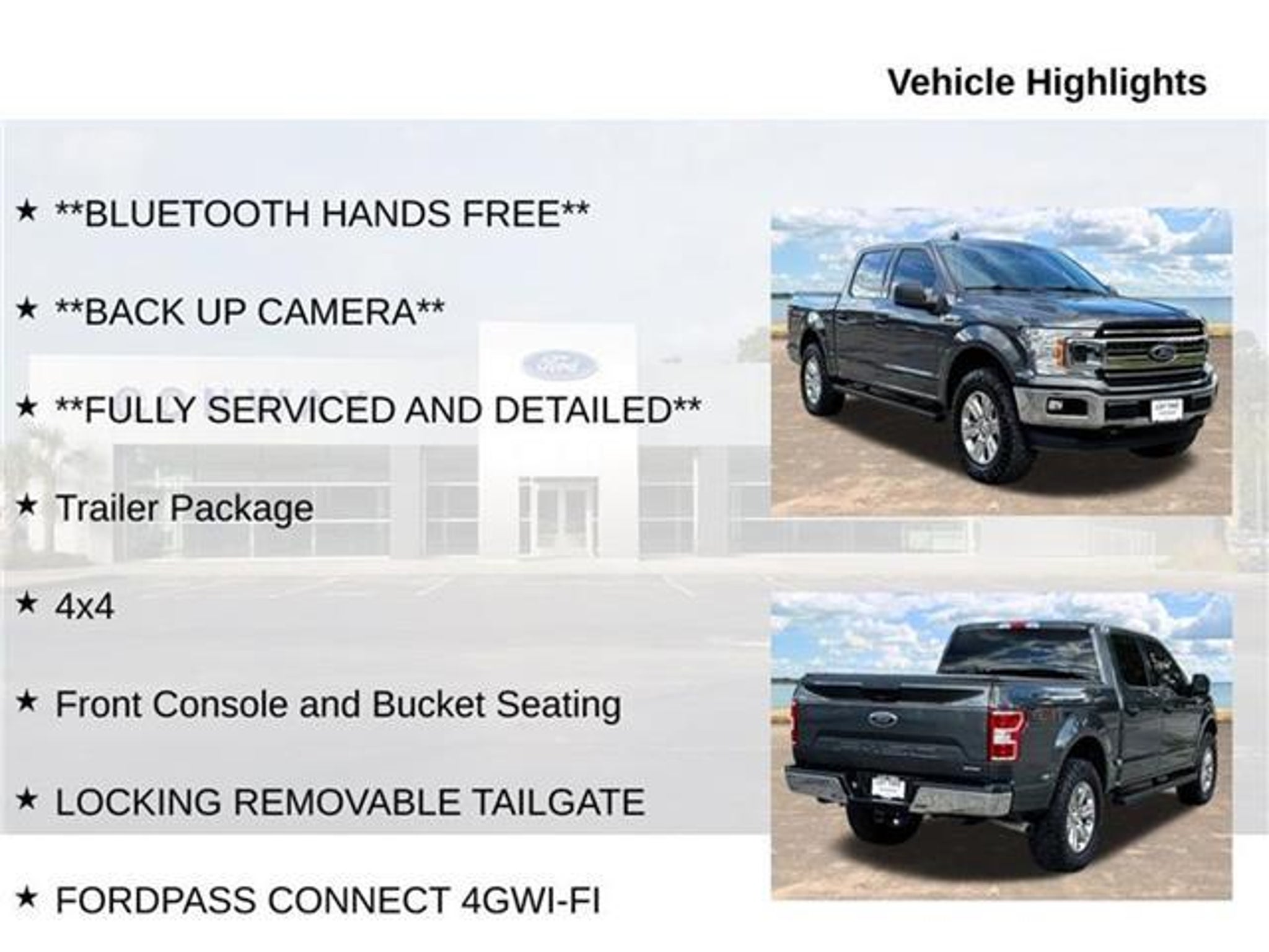 Discover the power and capability of the 2019 Ford F-150 XLT. This impressive truck is built to handle any task with its robust 3.5L V6 EcoBoost engine, 10-speed automatic transmission, and 4-wheel drive system. Boasting a towing capacity of up to 7,000 lbs and a payload capacity of 7,000 lbs, this F-150 is ready to take on your toughest jobs. - Bluetooth hands-free connectivity - Backup camera for enhanced visibility - Fully serviced and detailed for peace of mind - Trailer package with integrated brake controller - 4x4 capability for confident off-road performance - Front console and bucket seating for comfort - LOCKING REMOVABLE TAILGATE for secure cargo - FORDPASS CONNECT 4G WI-FI for on-the-go connectivity - MYKEY for customizable driving settings - Cruise control for effortless highway driving The exterior of this F-150 XLT is finished in a sleek Gray color, complemented by chrome bumpers and 17-inch silver painted aluminum wheels. Step inside and you'll find a well-appointed interior with cloth 40/console/40 front seats, 4-way adjustable headrests, and a flow-through console with column shift. Equipped with the SYNC 3 infotainment system, this F-150 offers seamless integration with your smartphone via Apple CarPlay and Android Auto. The Harman Kardon premium audio system delivers an immersive listening experience, while the 6.1-inch color touchscreen keeps you connected and in control. Safety and technology are also at the forefront, with features like the electronic locking differential, trailer brake controller, and a suite of advanced driver-assistance systems. The F-150 XLT is built to inspire confidence on the road, whether you're hauling a heavy load or navigating through challenging terrain. This well-maintained 2019 Ford F-150 XLT is ready to take on your next adventure. With its impressive capabilities, advanced features, and exceptional value, it's the perfect choice for the discerning truck enthusiast. Visit our showroom today and experience the power and versatility of this remarkable vehicle firsthand.