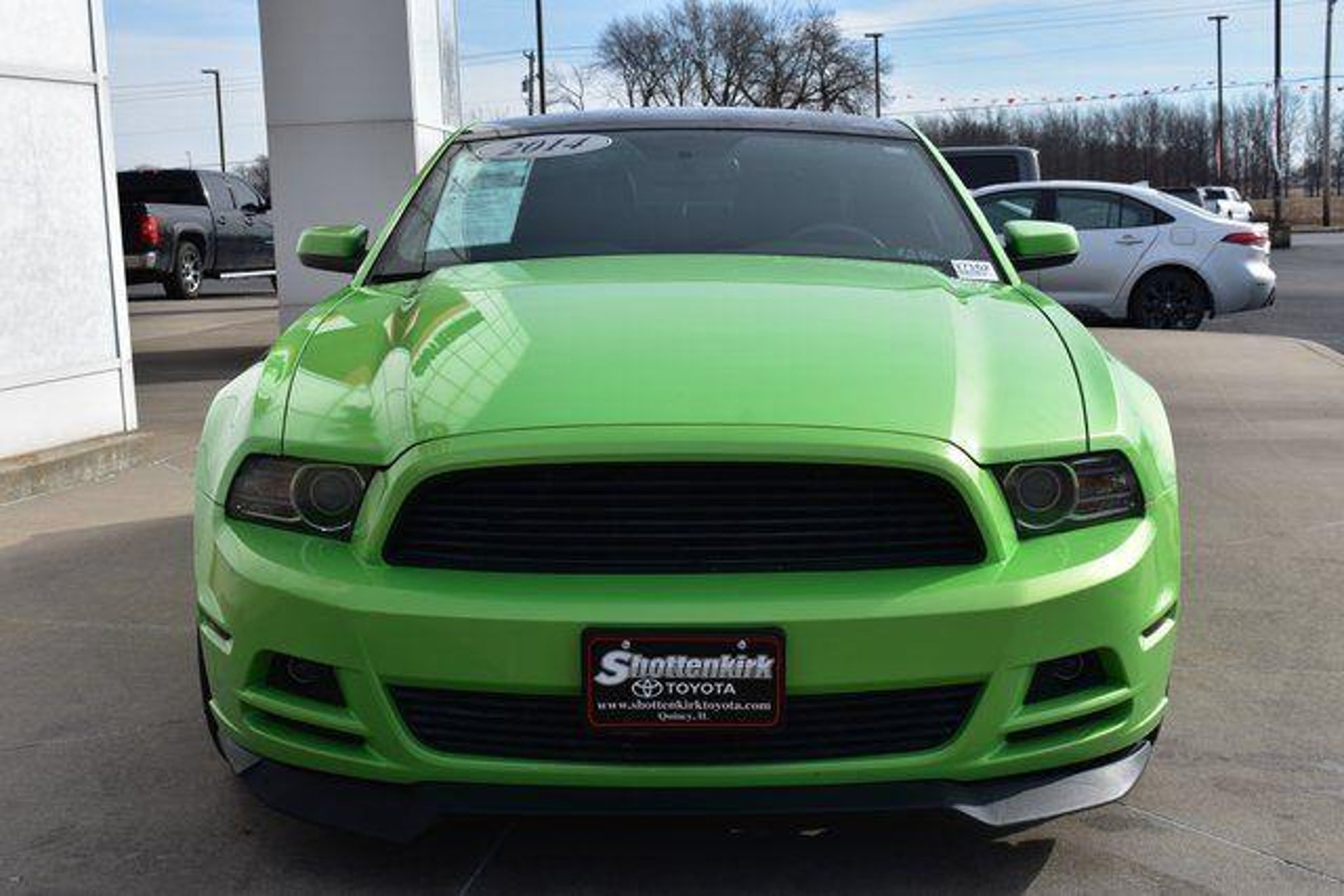 [ 2014 Ford Mustang Green Metallic V6 Premium 3.7L V6 Ti-VCT 24V 6-Speed Automatic RWD Clean Carfax One Owner Sunroof/Moonroof Leather Backup Camera Mustang V6 Premium 6-Speed Automatic RWD Green Metallic Black Leather 6-Way Power Passenger Seat 8 Speakers ABS brakes Air Conditioning Alloy wheels AM/FM radio: SiriusXM Bumpers: body-color CD player Driver door bin Driver vanity mirror Front Bucket Seats Front Center Armrest Front reading lights Garage door transmitter Heated Front Seats High-Intensity Discharge Headlights Illuminated entry Leather Bucket Seats Leather Shift Knob Low tire pressure warning Occupant sensing airbag Outside temperature display Panic alarm Passenger door bin Passenger vanity mirror Power door mirrors Power driver seat Power steering Power windows Radio data system Rear window defroster Remote keyless entry Speed control Split folding rear seat Steering wheel mounted audio controls Tilt steering wheel Traction control Variably intermittent wipers. Awards: * 2014 KBB.com 10 Coolest New Cars Under $25 000 * 2014 KBB.com 5-Year Cost to Own Awards * 2014 KBB.com Brand Image Awards Standard with Shottenkirk Care which includes 6 month 6 000 mile powertrain warranty dent and ding repair tire road hazard and wheel repair and windshield chip repair. (Call us for details) Shottenkirk Toyota of Quincy Illinois has been serving the needs of tri-state motorists for years.Offering top notch new and used Toyota sales service and parts in a friendly environment that puts a premium on service not prices! We're proud to be a destination for used car shoppers from the Jacksonville Springfield Carthage Il. Hannibal Kirksville St. Louis Columbia Mo. And the Mt.Pleasant Keokuk Farmington Fort Madison Iowa areas.Whether you visit us to buy an used Ford like a F-150 Super-Duty Escape Mustang Taurus Fusion Focus Expedition Excursion Ranger Fiesta Edge and Explorer or to get service for your existing vehicle you'll get impeccable service. We have an outstanding reputation for quality and a no-hassle buying experience.You may also visit us at ] [Our Toyota dealership is happy to help drivers in Quincy, IL and surrounding areas in finding Toyota cars, trucks and SUVs for sale. We believe that after just a few moments of sifting through our abundant inventory, motorists will find the perfect vehicle for their needs. We also offer competitive finance packages and service options as well! Did we mention that most of your automotive requests can be booked entirely online? Starting online can save you lots of valuable time. Our website will serve you well if you're looking to apply for financing, schedule a service appointment, or browse service specials. ]