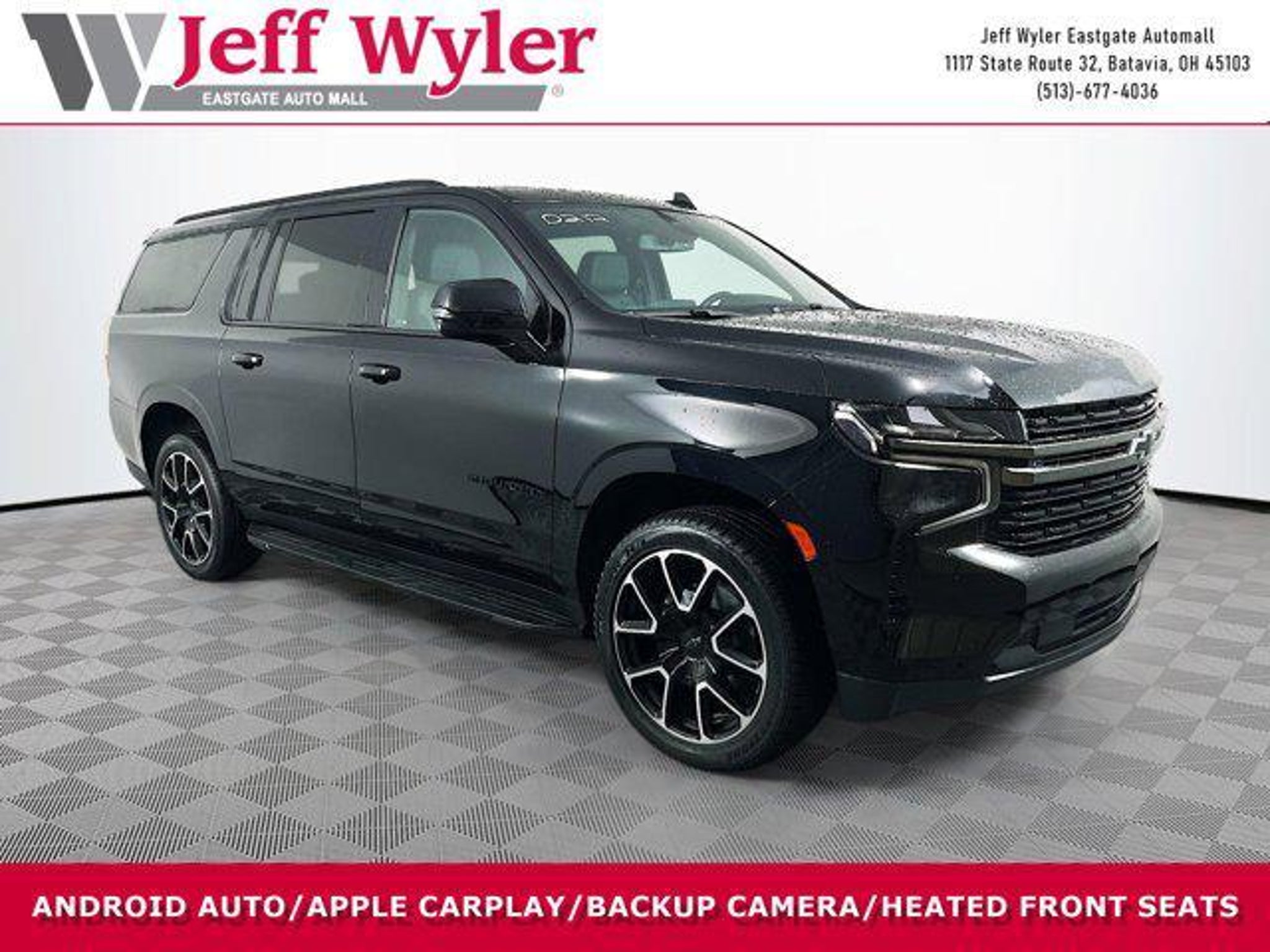 Jeff Wyler Eastgate Auto Mall is very proud to offer this outstanding-looking 2021 Chevrolet Suburban RST in Black. Well equipped with: Driver Alert Package (Front & Rear Park Assist, Lane Change Alert w/Side Blind Zone Alert, Lane Keep Assist w/Lane Departure Warning, and Rear Cross Traffic Alert), Luxury Package (2nd Row Pwr Release 60/40 Split-Folding Bench Seat, 3rd Row 60/40 Power-Folding Split-Bench, Automatic Heated Steering Wheel, HD Surround Vision, Heated 2nd Row Outboard Seats, Memory Settings, Outside Heated Power-Adjustable Mirrors, Power Tilt & Telescopic Steering Column, and Rear Pedestrian Alert), Preferred Equipment Group 1SP (10-Way Power Driver & Passenger Seat Adjusters, 1st & 2nd Row Color-Keyed Carpeted Floor Mats, 2 USB Data Ports, Auto-Dimming Inside Rear-View Mirror, Bose 9-Speaker Stereo Audio System Feature, Bright Front & Rear Door Sill Plates, Color-Keyed Carpeting Floor Covering, Driver & Front Outboard Passenger Airbags, Floor Console w/Storage Area, Hands-Free Rear Power Programmable Liftgate, HD Radio, Heated Driver & Front Passenger Seats, Infotainment Display, Leather-Wrapped Steering Wheel, LED Daytime Running Lamps, Memory Settings For Driver, Remote Start, SiriusXM Radio w/360L, and Universal Home Remote), 3.23 Rear Axle Ratio, 3rd row seats: split-bench, 4-Wheel Disc Brakes, 9 Speakers, ABS brakes, Air Conditioning, Alloy wheels, AM/FM radio: SiriusXM with 360L, Apple CarPlay/Android Auto, Auto High-beam Headlights, Auto-dimming Rear-View mirror, Automatic temperature control, Brake assist, Bumpers: body-color, Compass, Delay-off headlights, Driver door bin, Driver vanity mirror, Dual front impact airbags, Dual front side impact airbags, Dual-Pane Power Panoramic Sunroof, Electronic Stability Control, Emergency communication system: OnStar and Chevrolet connected services capable, Four wheel independent suspension, Front anti-roll bar, Front Bucket Seats, Front Center Armrest, Front dual zone A/C, Front reading lights, Fully automatic headlights, Garage door transmitter, Heated door mirrors, Heated front seats, Illuminated entry, Leather steering wheel, Low tire pressure warning, Memory seat, Occupant sensing airbag, Outside temperature display, Overhead airbag, Overhead console, Panic alarm, Passenger door bin, Passenger vanity mirror, Perforated Leather Seating Surfaces, Power door mirrors, Power driver seat, Power Liftgate, Power passenger seat, Power Release 2nd Row Bucket Seats, Power steering, Power windows, Premium audio system: Chevrolet Infotainment 3 Plus, Premium Smooth Ride Suspension, Radio: Chevrolet Infotainment 3 Plus System, Rain sensing wipers, Rear air conditioning, Rear anti-roll bar, Rear reading lights, Rear seat center armrest, Rear window defroster, Rear window wiper, Remote keyless entry, Roof rack: rails only, Security system, Speed control, Speed-sensing steering, Split folding rear seat, Spoiler, Steering wheel mounted audio controls, Tachometer, Telescoping steering wheel, Tilt steering wheel, Traction control, Trip computer, Variably intermittent wipers, Voltmeter, Wheel Locks (Set of 4) (LPO), and Wheels: 22 x 9 Bright Machined. Ask about available certifications. Used vehicles 10 years of age or newer with less than 100,000 miles are eligible for the Wyler Assurance Program, but eligible vehicles must pass our reconditioning process and multi-point inspection. Provided the vehicle passes inspection, vehicles will be eligible for the 6 month/6,000 mile limited warranty. The 6 month/6,000 mile limited warranty is NOT available on AS-IS vehicles, wholesale vehicles, lease buyback/pass-thru vehicles or un-inspected vehicles. Note that this program can also apply to vehicles where the remaining factory coverage is less than 6 months or 6,000 miles. Please check the Federal Trade Commission (FTC) Buyers guide on the vehicle for full details as to whether or not warranty coverage may apply. Contact Dealer for additional details. The Wyler Assurance 6 month/6,000