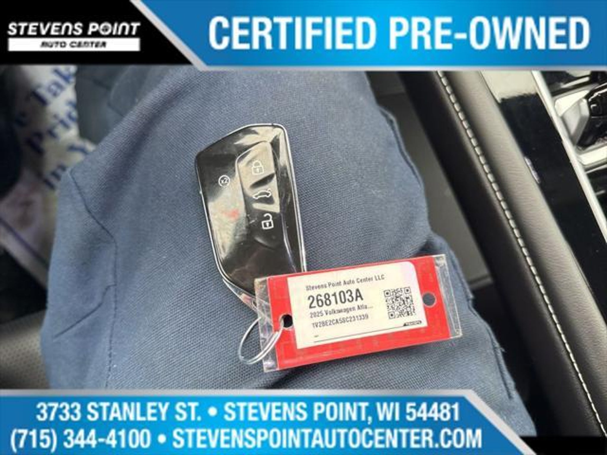 Details > 2025 Volkswagen Atlas Cross Sport AWD SEL 4motion 4DR SUV For Sale in Stevens Point, WI Private Party Sellers Click here to place your ad now! You auta tell them you saw the ad in AutaBuy when you call or email. 1/36 2/36 3/36 4/36 5/36 6/36 7/36 8/36 9/36 10/36 11/36 12/36 13/36 14/36 15/36 16/36 17/36 18/36 19/36 20/36 21/36 22/36 23/36 24/36 25/36 26/36 27/36 28/36 29/36 30/36 31/36 32/36 33/36 34/36 35/36 36/36 View 36 Photos View All Add to My Garage Parked in Your Garage! Stevens Point Hyundai Contact Seller: I would like to: Make Offer Check Availability Ask A Question Request More Photos Check Financing Options Send a copy of this message to me Add this listing to my garage Send to Mobile Mileage 10,460 Exterior Color Deep Black Pearl Interior Color Titan Black Doors 4 Engine 2.0L I4 Transmission 8 Speed Auto Stock # 268103A VIN 1V2BE2CA5SC231339 Estimated Monthly Payment $696 mo Apply Now J.J. Best Banc & Co. 2025 Volkswagen Atlas Cross Sport AWD SEL 4motion 4DR SUV Description: Stevens Point Hyundai · Mileage: 10,460 · Color: Deep Black Pearl Price: $39,997. Price: $39,996. Mileage 10,460 Exterior Color Deep Black Pearl Interior Color Titan Black Doors 4 Engine 2.0L I4 Transmission 8 Speed Auto Stock # 268103A VIN 1V2BE2CA5SC231339 Estimated Monthly Payment $696 mo Apply Now J.J. Best Banc & Co. Add to My Garage Parked in Your Garage! Message Seller Stevens Point Hyundai Contact Seller: I would like to: Make Offer Check Availability Ask A Question Request More Photos Check Financing Options Send a copy of this message to me Add this listing to my garage Offered for sale by Stevens Point Hyundai STEVENS POINT, WI Price: $39,997. Price: $39,996. Offered for sale by Stevens Point Hyundai STEVENS POINT, WI [entire inventory] Ask Auta Intelligence The first collector-car AI built directly into a classic car marketplace How many Atlas Cross Sports were produced in Black? What safety features does this model offer? Tell me the history on this model When was this model first introduced? Can you show me more suvs for a similar price? What does this VIN number tell me? What engine options did these come with? How many passengers can this seat comfortably? How far is this from me? What transmission options did these offer? How easy are parts to find for this model? What factory options were available on this model? What trim levels were available for this model? How many of these were produced? What kind of mileage do these get? What colors did these come in? Where is this located? Do you have a similar car to sell? List It Now! Questions about this car? Ask Auta Intelligence for production numbers, available options, etc. · Subscribe to AutaBuy! · Send a Gift Subscription Notice to a Friend