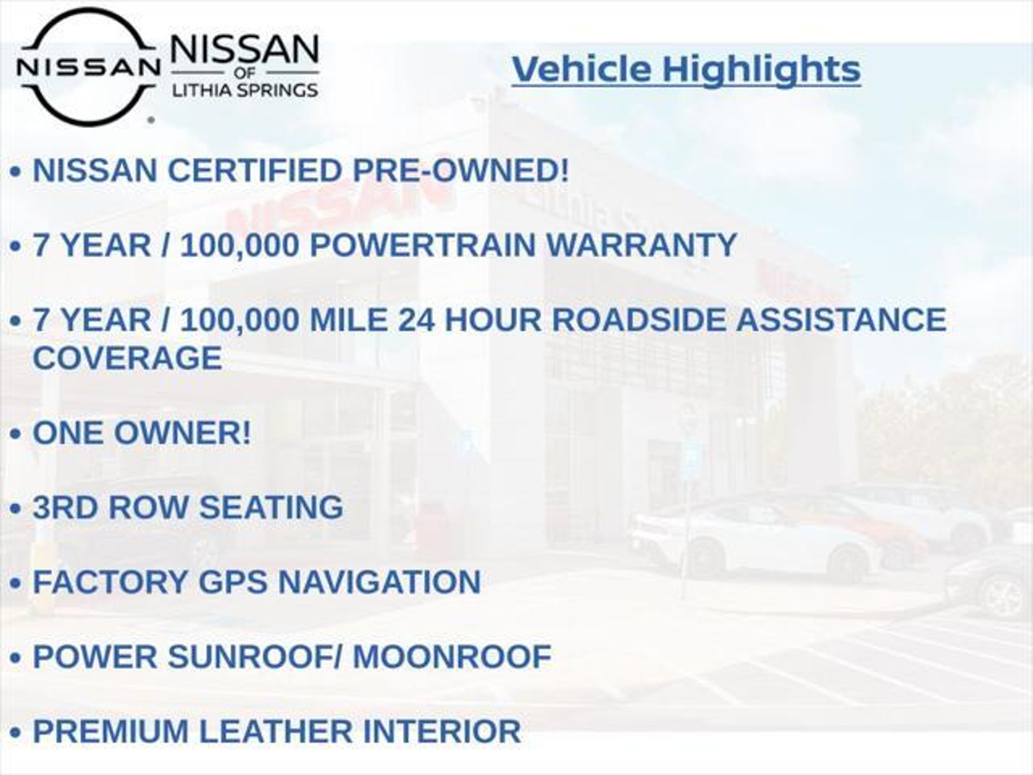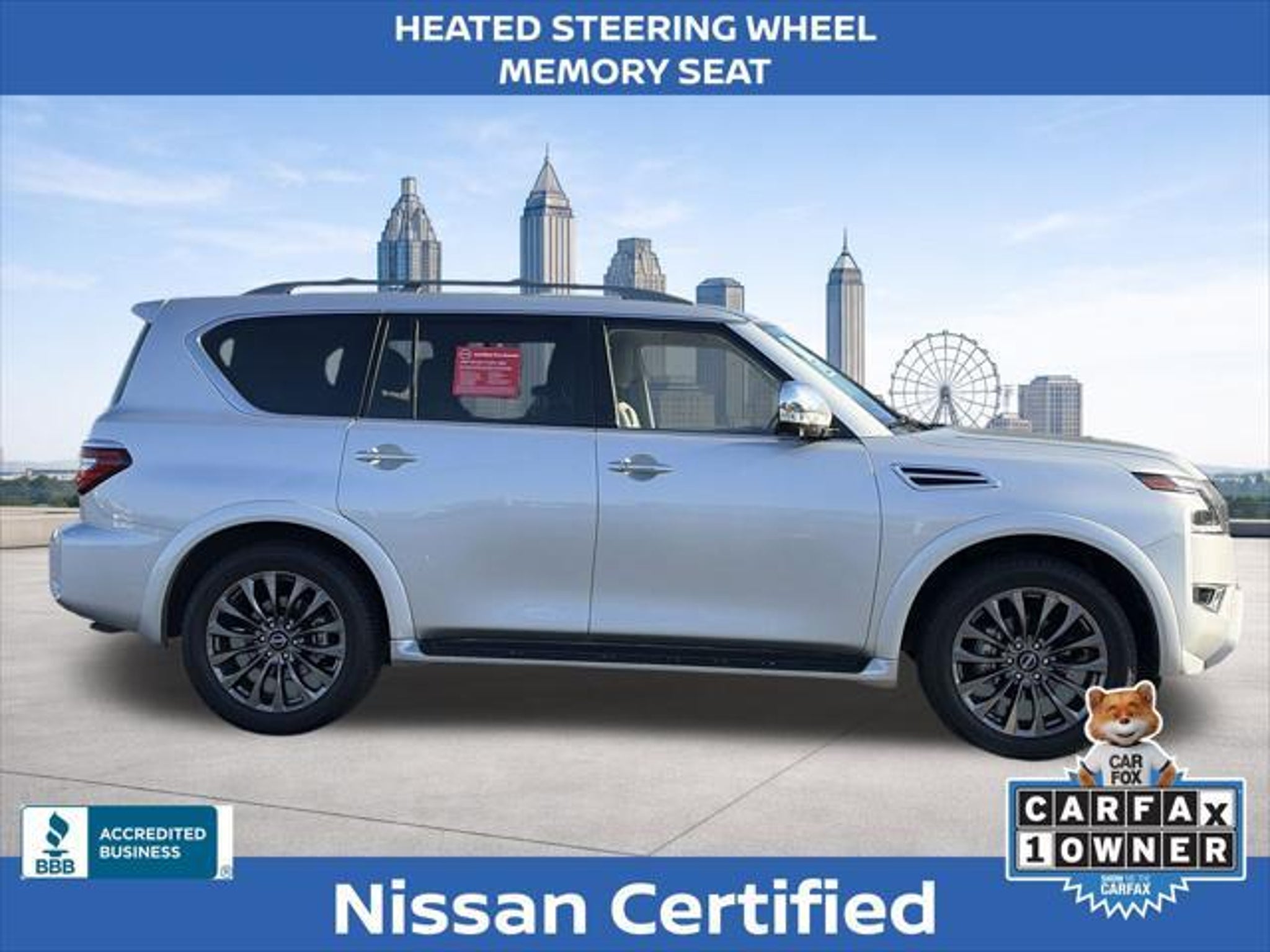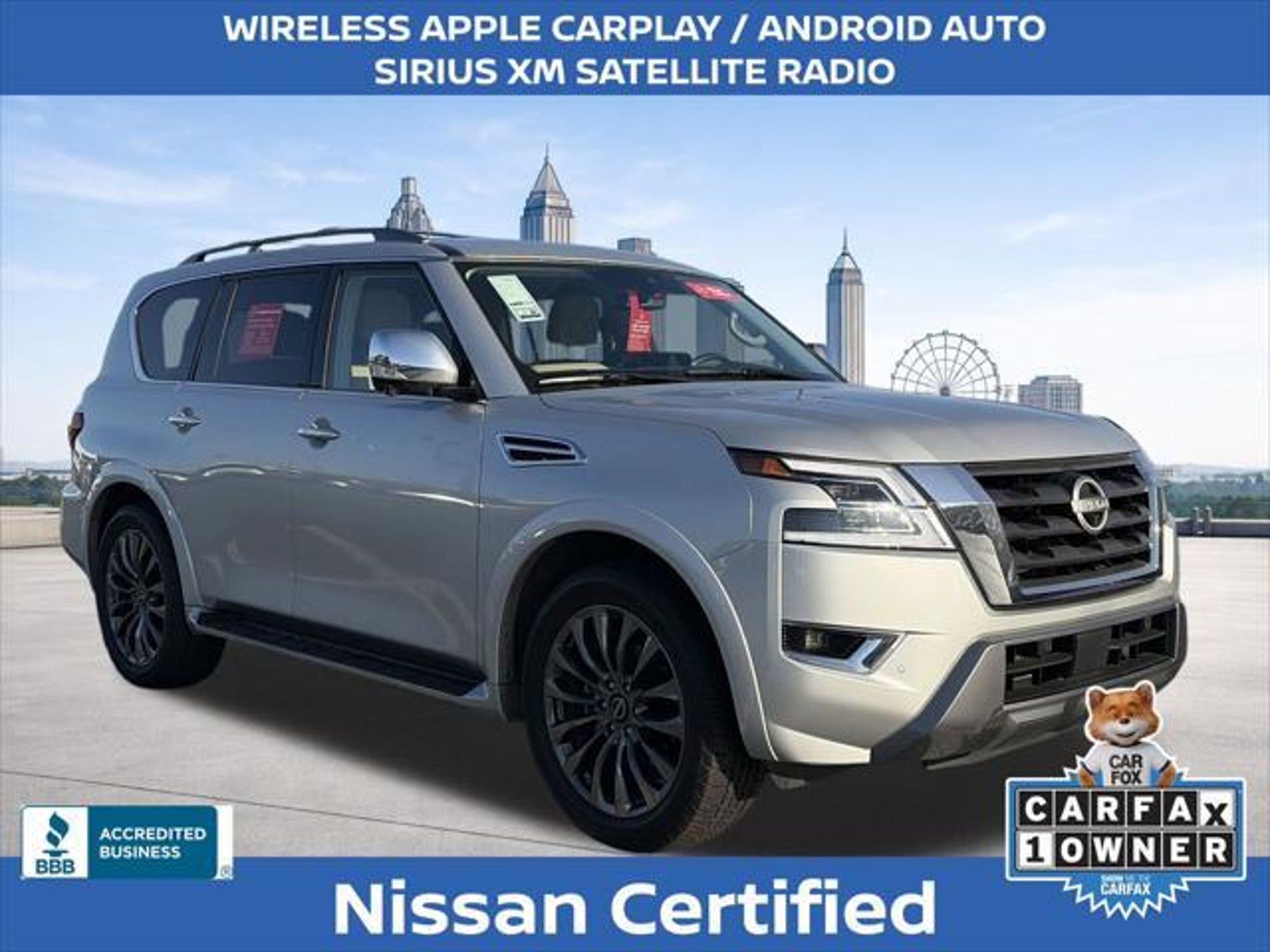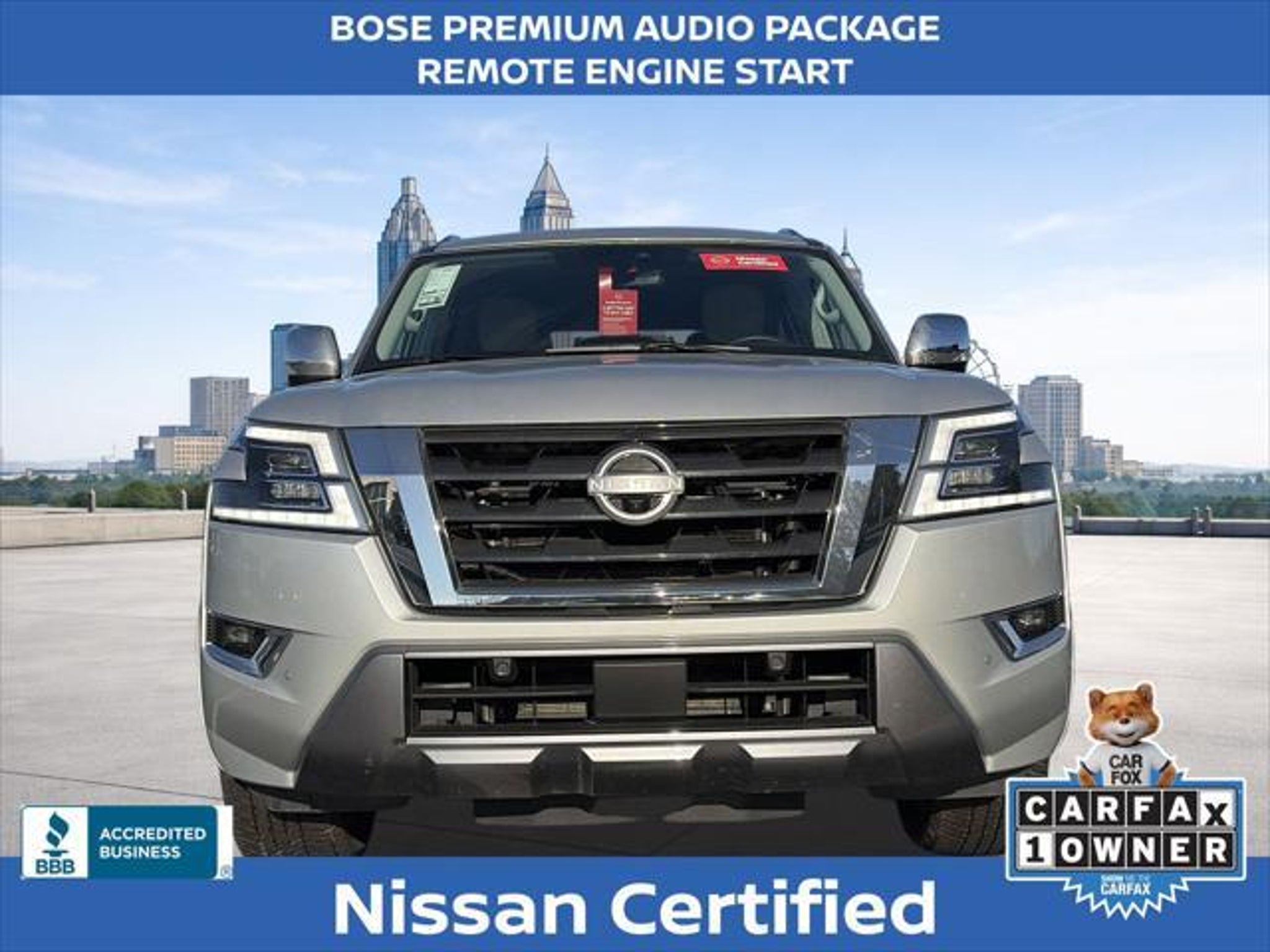 Experience the pinnacle of luxury and capability with the 2024 Nissan Armada Platinum. This exceptional SUV is a true masterpiece, blending advanced technology, premium comfort, and unparalleled performance to elevate your driving experience. Boasting an impressive array of features, the 2024 Armada Platinum stands out from the crowd: "¢ NISSAN CERTIFIED PRE-OWNED! 7 YEAR / 100,000 POWERTRAIN WARRANTY "¢ 7 YEAR / 100,000 MILE 24 HOUR ROADSIDE ASSISTANCE COVERAGE "¢ ONE OWNER! "¢ 3RD ROW SEATING "¢ FACTORY GPS NAVIGATION "¢ POWER SUNROOF/ MOONROOF "¢ PREMIUM LEATHER INTERIOR "¢ CLIMATE CONTROLLED SEATING "¢ HEATED AND COOLED SEATS "¢ HEATED STEERING WHEEL "¢ MEMORY SEAT "¢ WIRELESS APPLE CARPLAY / ANDROID AUTO "¢ SIRIUS XM SATELLITE RADIO "¢ BOSE PREMIUM AUDIO PACKAGE The Armada Platinum's captivating presence is further enhanced by its striking 22 wheel package and sleek silver exterior. Step inside and be enveloped in the luxurious quilted leather seating, where you'll enjoy the convenience of power-adjustable and heated/ventilated front seats, as well as a heated steering wheel for unparalleled comfort. Powered by a robust 5.6L V8 engine delivering 400 horsepower, the Armada Platinum provides the perfect blend of strength and efficiency, with an impressive 19 mpg on the highway. Cutting-edge safety features, including Intelligent Forward Collision Warning, Automatic Emergency Braking, and Blind Spot Intervention, ensure you and your loved ones can travel with confidence. The 2024 Nissan Armada Platinum is more than just a vehicle "“ it's a statement of refined taste and uncompromising quality. Experience the pinnacle of SUV luxury and capability today. We want to ensure you have all the details you need! Our pricing and information are presented with utmost accuracy. Please keep in mind that prices and incentives can vary depending on your location, and they are subject to change. It's important to note that government fees such as tax, tag, title, and WRA are not included in our prices. At Nissan of Lithia Springs, we proudly offer automotive loan financing through our esteemed Finance Department. Contact one of our dedicated finance managers to learn more about our Credit Assistance Program. Our exceptional team of sales and finance associates is committed to providing top-notch care and addressing all your automotive concerns with the utmost dedication. Visit our dealership at 811 Thornton Rd, Lithia Springs, GA, or call us at . We are looking forward to assisting all our customers in the greater Atlanta area with great enthusiasm and sincerity.