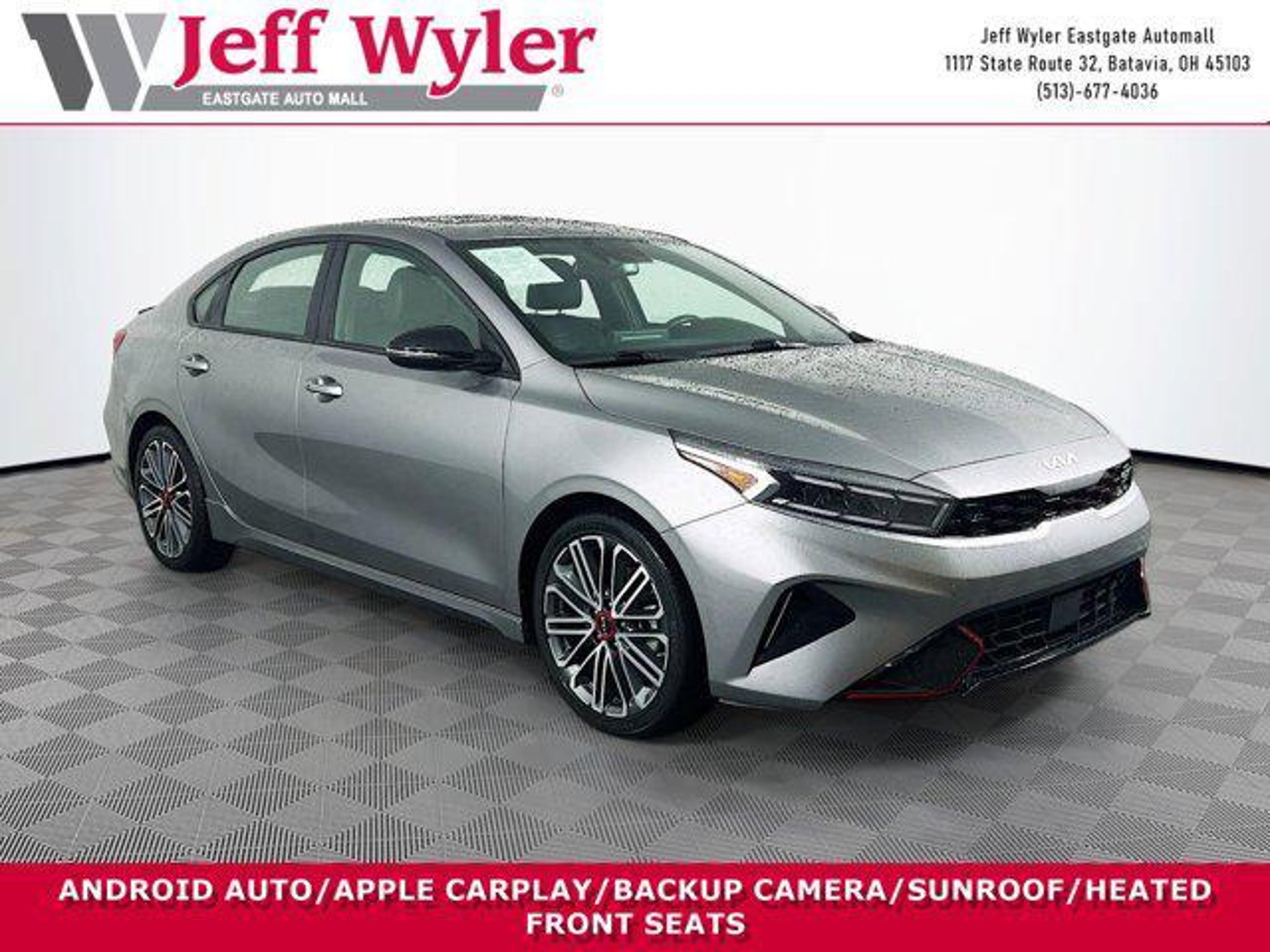 Jeff Wyler Eastgate Auto Mall is pleased to offer this charming 2024 Kia Forte GT in Steel Gray. Well equipped with: GT2 Package (10-Way Power Driver's Seat, harman/kardon® Premium Audio, Heated & Ventilated Front Seats, LED Interior Lighting, Parking Distance Warning-Reverse, Power Sunroof, and SynTex Seat Trim), 18 x 7.5J Alloy Wheels, 4-Wheel Disc Brakes, 6 Speakers, ABS brakes, Air Conditioning, Alloy wheels, AM/FM radio: SiriusXM, Apple CarPlay & Android Auto, Auto High-beam Headlights, Automatic temperature control, Brake assist, Bumpers: body-color, Cloth & SynTex Seat Trim, Delay-off headlights, Driver door bin, Driver vanity mirror, Dual front impact airbags, Dual front side impact airbags, Electronic Stability Control, Emergency communication system, Exterior Parking Camera Rear, Four wheel independent suspension, Front anti-roll bar, Front Bucket Seats, Front Center Armrest, Front dual zone A/C, Front fog lights, Front reading lights, Fully automatic headlights, Heated door mirrors, Illuminated entry, Leather Shift Knob, Leather steering wheel, Low tire pressure warning, Navigation System, Occupant sensing airbag, Outside temperature display, Overhead airbag, Overhead console, Panic alarm, Passenger door bin, Passenger vanity mirror, Power door mirrors, Power steering, Power windows, Radio data system, Radio: 10.25 Display Audio, Rear anti-roll bar, Rear seat center armrest, Rear window defroster, Remote keyless entry, Security system, Speed control, Split folding rear seat, Spoiler, Sport steering wheel, Steering wheel mounted audio controls, Tachometer, Telescoping steering wheel, Tilt steering wheel, Traction control, Trip computer, Turn signal indicator mirrors, and Variably intermittent wipers. CARFAX One-Owner. Ask about available certifications. Used vehicles 10 years of age or newer with less than 100,000 miles are eligible for the Wyler Assurance Program, but eligible vehicles must pass our reconditioning process and multi-point inspection. Provided the vehicle passes inspection, vehicles will be eligible for the 6 month/6,000 mile limited warranty. The 6 month/6,000 mile limited warranty is NOT available on AS-IS vehicles, wholesale vehicles, lease buyback/pass-thru vehicles or un-inspected vehicles. Note that this program can also apply to vehicles where the remaining factory coverage is less than 6 months or 6,000 miles. Please check the Federal Trade Commission (FTC) Buyers guide on the vehicle for full details as to whether or not warranty coverage may apply. Contact Dealer for additional details. The Wyler Assurance 6 month/6,000 Mile limited warranty ends 6 months from the date of the Retail Purchase Agreement (BUYERS ORDER) or when the vehicle's odometer registers 6,000 additional miles to the mileage listed on the BUYERS ORDER, whichever comes first. Your Deductible - The warranty holder on your contract pays the first $100 of each covered repair.