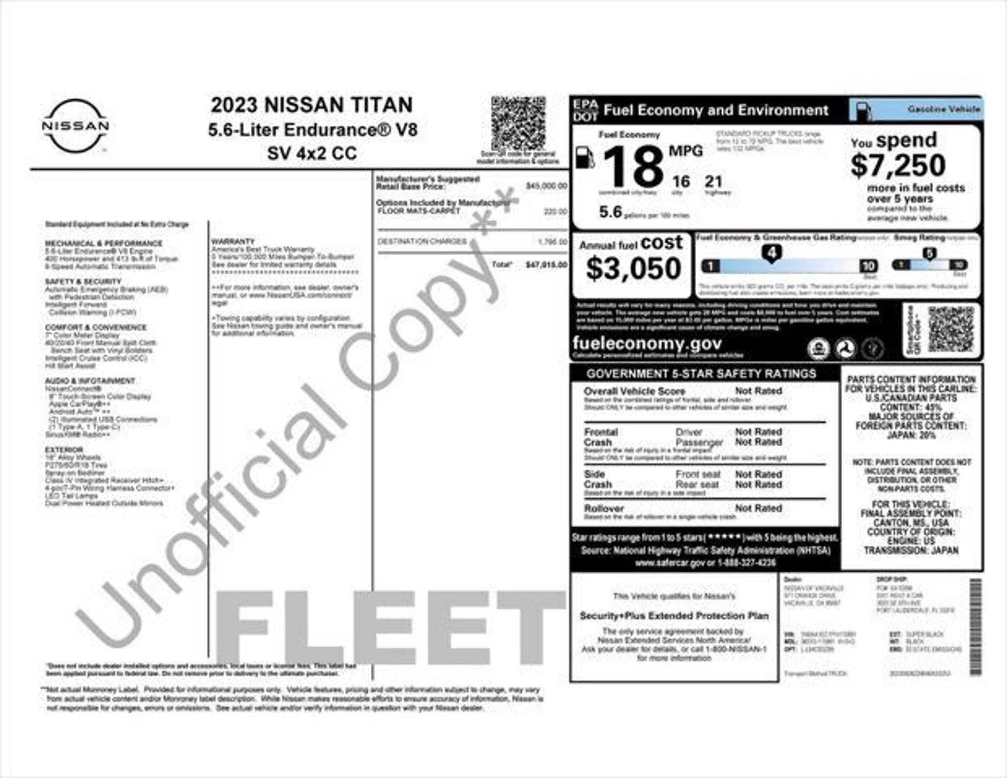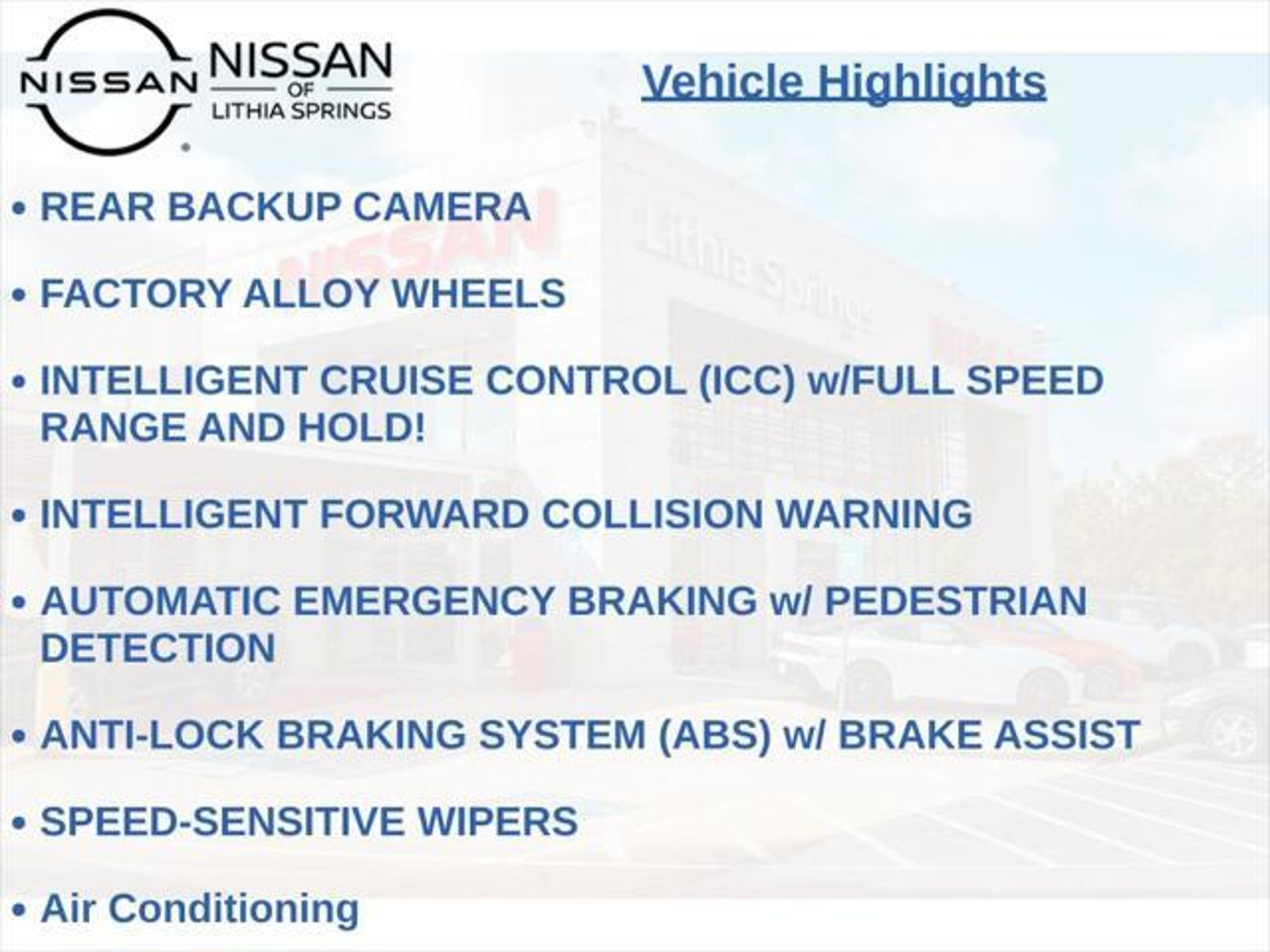 Elevate your driving experience with the 2023 Nissan Titan SV - a rugged and capable full-size pickup that delivers uncompromising performance and unparalleled comfort. This stunning Black Titan SV is powered by a potent 5.6L V8 DOHC 32V engine that generates an impressive 400 horsepower, paired with a smooth-shifting 9-speed automatic transmission and a rear-wheel-drive configuration. - 5 YEAR/100,000 BUMPER TO BUMPER LIMITED WARRANTY!! - 5 YEAR/100,000 MILE POWERTRAIN WARRANTY!! - APPLE CARPLAY / ANDROID AUTO - SIRIUS XM SATELLITE RADIO - REMOTE KEYLESS ENTRY - PUSH BUTTON START - VEHICLE IMMOBILIZER SYSTEM - HANDS-FREE BLUETOOTH - REAR BACKUP CAMERA - FACTORY ALLOY WHEELS - INTELLIGENT CRUISE CONTROL (ICC) w/FULL SPEED RANGE AND HOLD! - INTELLIGENT FORWARD COLLISION WARNING - AUTOMATIC EMERGENCY BRAKING w/ PEDESTRIAN DETECTION With a commanding presence on the road, the Titan SV boasts a spacious and well-appointed interior that caters to your every need. Enjoy the convenience of features like Apple CarPlay, Android Auto, and SiriusXM Satellite Radio, as well as advanced safety technologies like Intelligent Cruise Control, Intelligent Forward Collision Warning, and Automatic Emergency Braking with Pedestrian Detection. The Titan SV's impressive fuel efficiency, with an EPA-estimated 16 mpg in the city and 21 mpg on the highway, means you can conquer the open road with confidence, whether you're hauling heavy loads or embarking on a long-distance journey. Backed by a comprehensive 5-year/100,000-mile bumper-to-bumper limited warranty and a 5-year/100,000-mile powertrain warranty, this Titan SV is built to last and ready to take on any challenge. Discover the perfect blend of power, capability, and technology in the 2023 Nissan Titan SV. Visit our dealership today to experience this exceptional full-size pickup for yourself and let our knowledgeable sales team guide you through all the features and benefits that make the Titan SV the ultimate choice for your driving needs. We want to ensure you have all the details you need! Our pricing and information are presented with utmost accuracy. Please keep in mind that prices and incentives can vary depending on your location, and they are subject to change. It's important to note that government fees such as tax, tag, title, and WRA are not included in our prices. At Nissan of Lithia Springs, we proudly offer automotive loan financing through our esteemed Finance Department. Contact one of our dedicated finance managers to learn more about our Credit Assistance Program. Our exceptional team of sales and finance associates is committed to providing top-notch care and addressing all your automotive concerns with the utmost dedication. Visit our dealership at 811 Thornton Rd, Lithia Springs, GA, or call us at . We are looking forward to assisting all our customers in the greater Atlanta area with great enthusiasm and sincerity.
