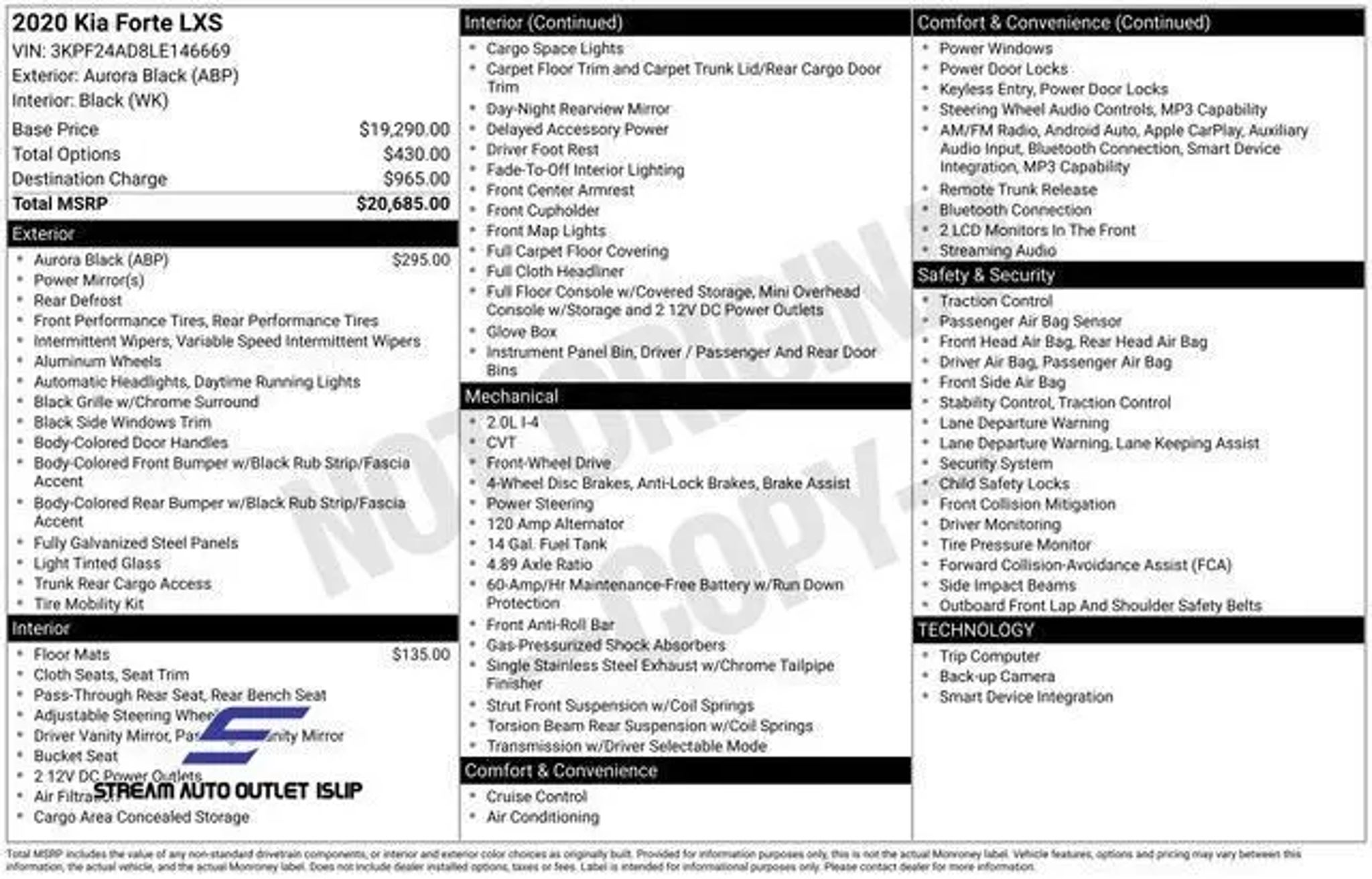 CARFAX One-Owner. Clean CARFAX. 2020 Kia Forte Aurora Black Pearl Odometer is 45330 miles below market average! 29/40 City/Highway MPG Priced below KBB Fair Purchase Price! Welcome to Stream Auto Outlet Islip"”where everyone drives. With 400 vehicles available and financing options for all credit types, we make approvals simple for customers with ITINs, new credit, bad credit, or no SSN. Our team is known for getting deals done and helping drivers across Long Island get into reliable, high-quality vehicles every day. No stress. No judgment. Just straightforward car buying.
